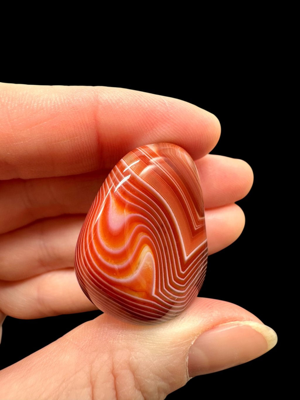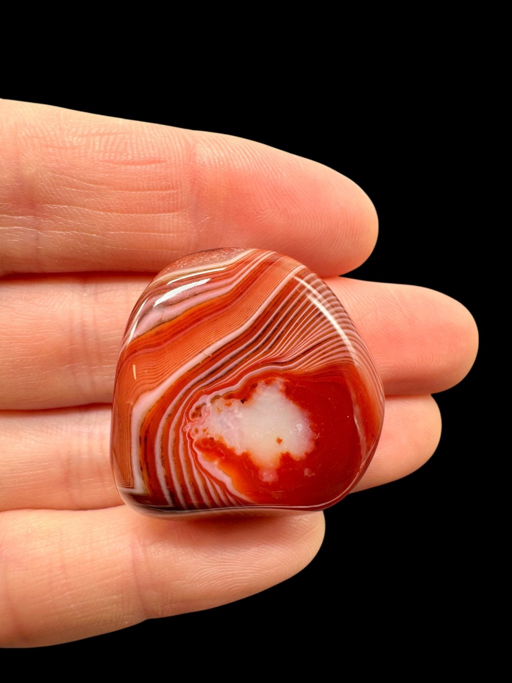 The red and orange shades of agates are caused by the presence of iron oxides, especially the minerals hematite and goethite. These minerals occur naturally within the agate and give it its characteristic coloration. The intensity of the color depends on the concentration of iron and the conditions under which the stone formed.