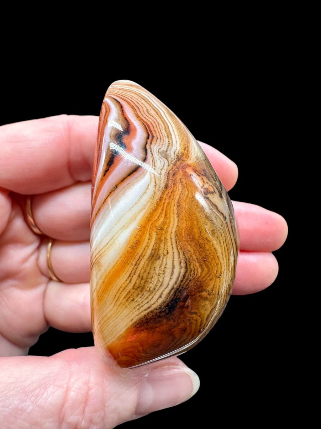 The red and orange shades of agates are caused by the presence of iron oxides, especially the minerals hematite and goethite. These minerals occur naturally within the agate and give it its characteristic coloration. The intensity of the color depends on the concentration of iron and the conditions under which the stone formed.
