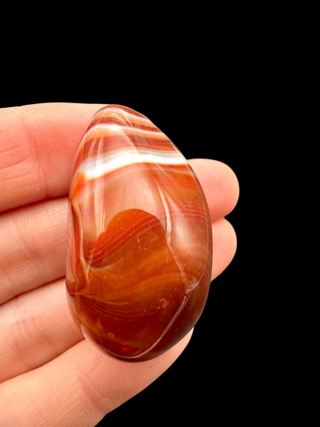 The red and orange shades of agates are caused by the presence of iron oxides, especially the minerals hematite and goethite. These minerals occur naturally within the agate and give it its characteristic coloration. The intensity of the color depends on the concentration of iron and the conditions under which the stone formed.