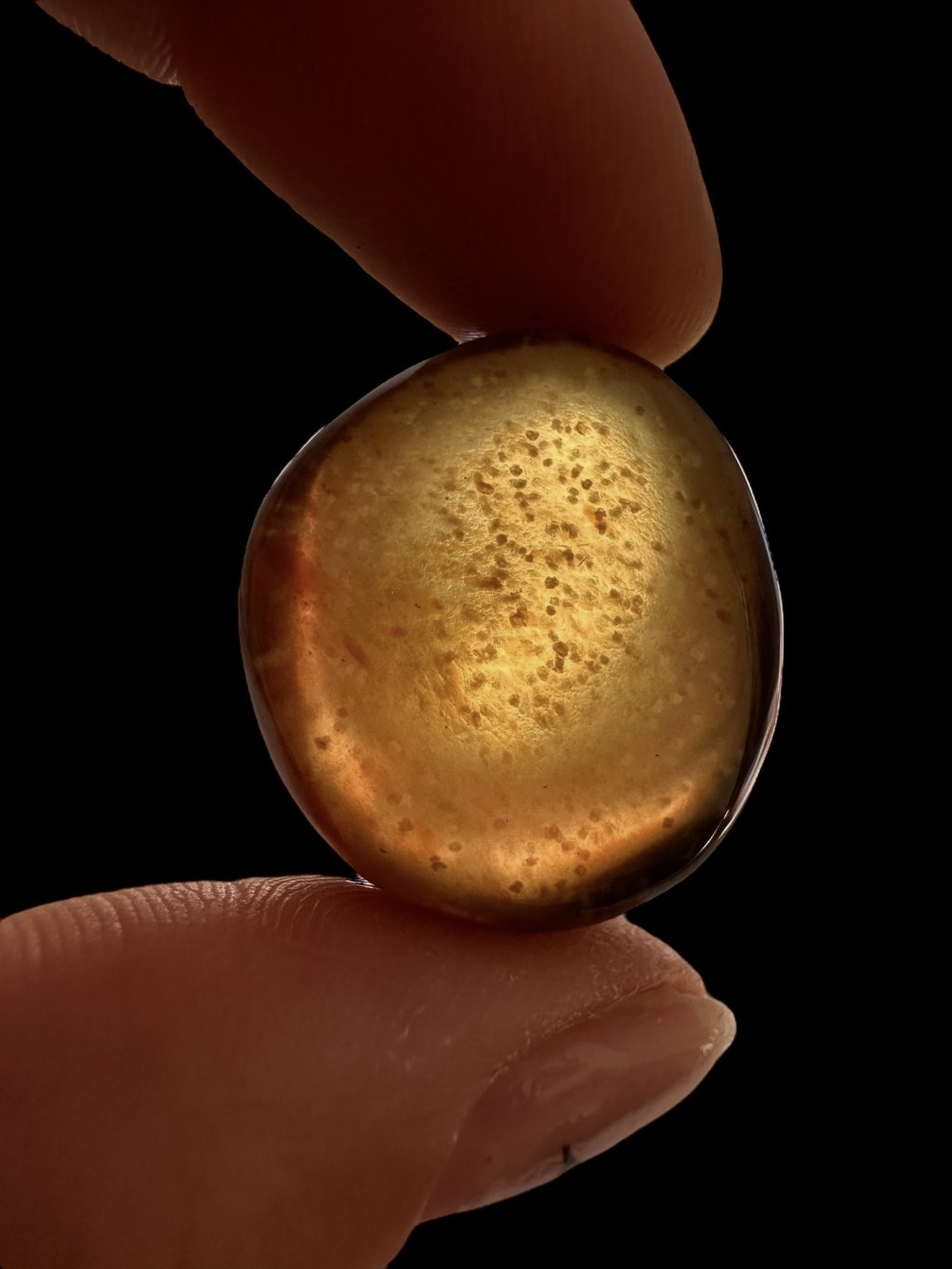 Unlike Dominican or Burmese amber, Indonesian amber very rarely contains insect inclusions. It most often contains plant remnants such as fragments of leaves, needles, or resin bubbles. Air bubbles can produce interesting optical effects. Occasionally, microorganisms appear. The geological conditions and age of this amber likely did not allow for the preservation of larger amounts of animal inclusions.
