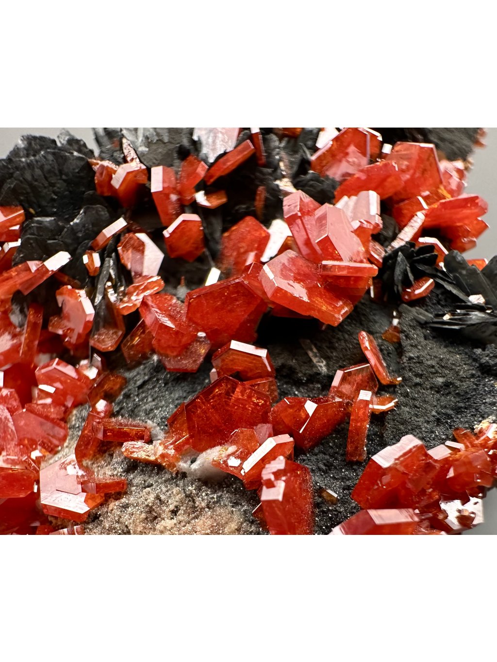 Vanadinite often forms beautiful compositions with barite, creating very aesthetic collectible specimens. In some cases, the barite, which is usually white or yellowish, may be covered with manganese salts. The manganese salts give the barite dark brown to black hues, creating a contrast with the vanadinite crystals. These crystals typically occur in bright red or orange, creating a visually attractive combination of