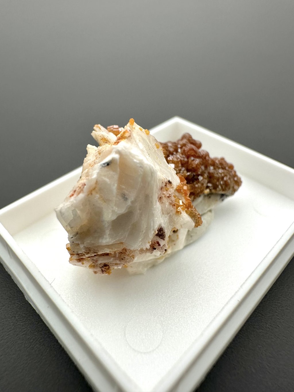 Vanadinite often forms beautiful compositions with barite, creating very aesthetic collectible specimens. In some cases, the barite, which is usually white or yellowish, may be covered with manganese salts. The manganese salts give the barite dark brown to black hues, creating a contrast with the vanadinite crystals. These crystals typically occur in bright red or orange, creating a visually attractive combination of