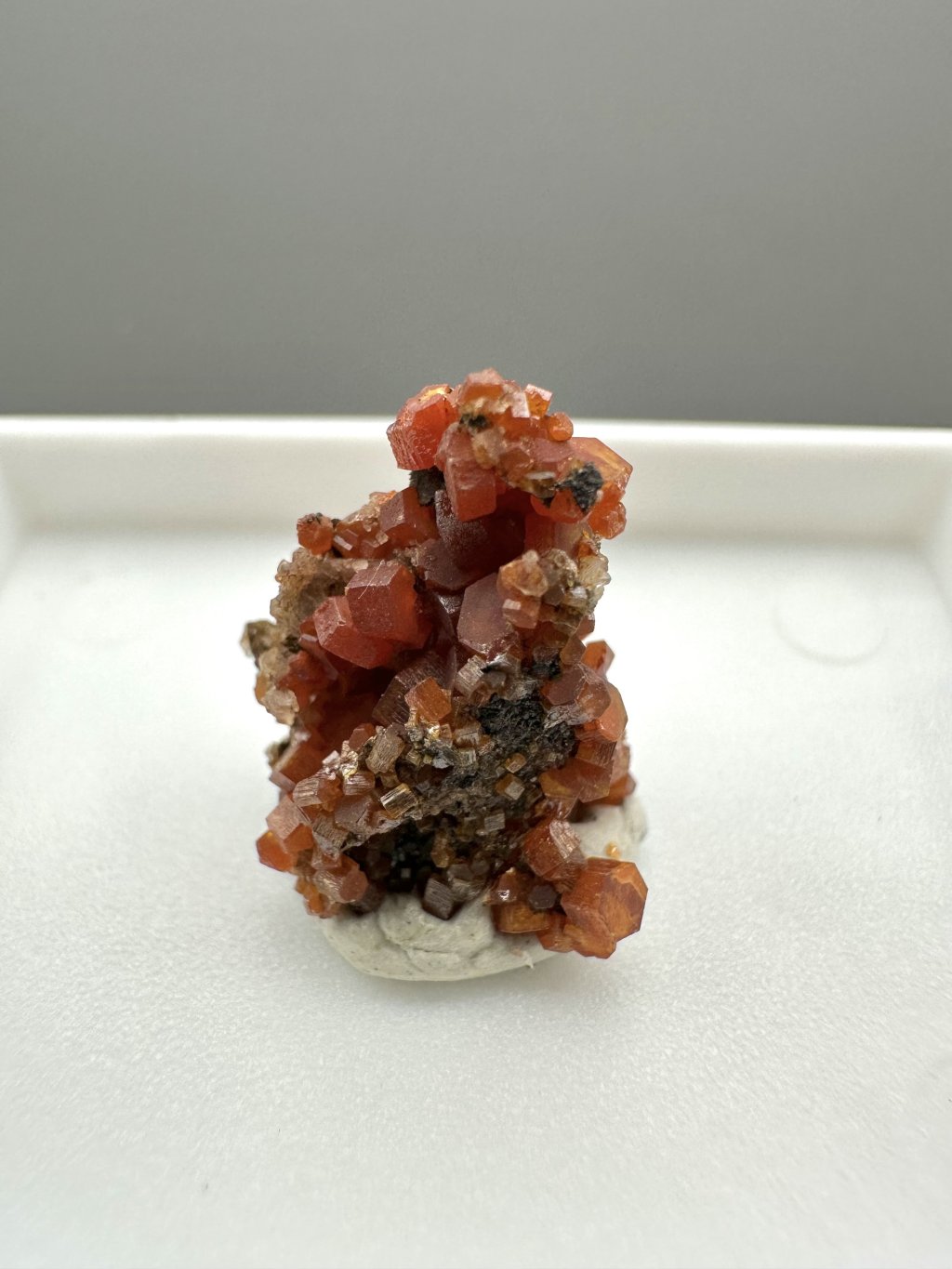 Vanadinite occurs mainly in dry, oxidised lead deposits, especially in Morocco, where some of the finest specimens have been found. Other important localities are Mexico, Argentina, Namibia, and the United States (e.g. Arizona).