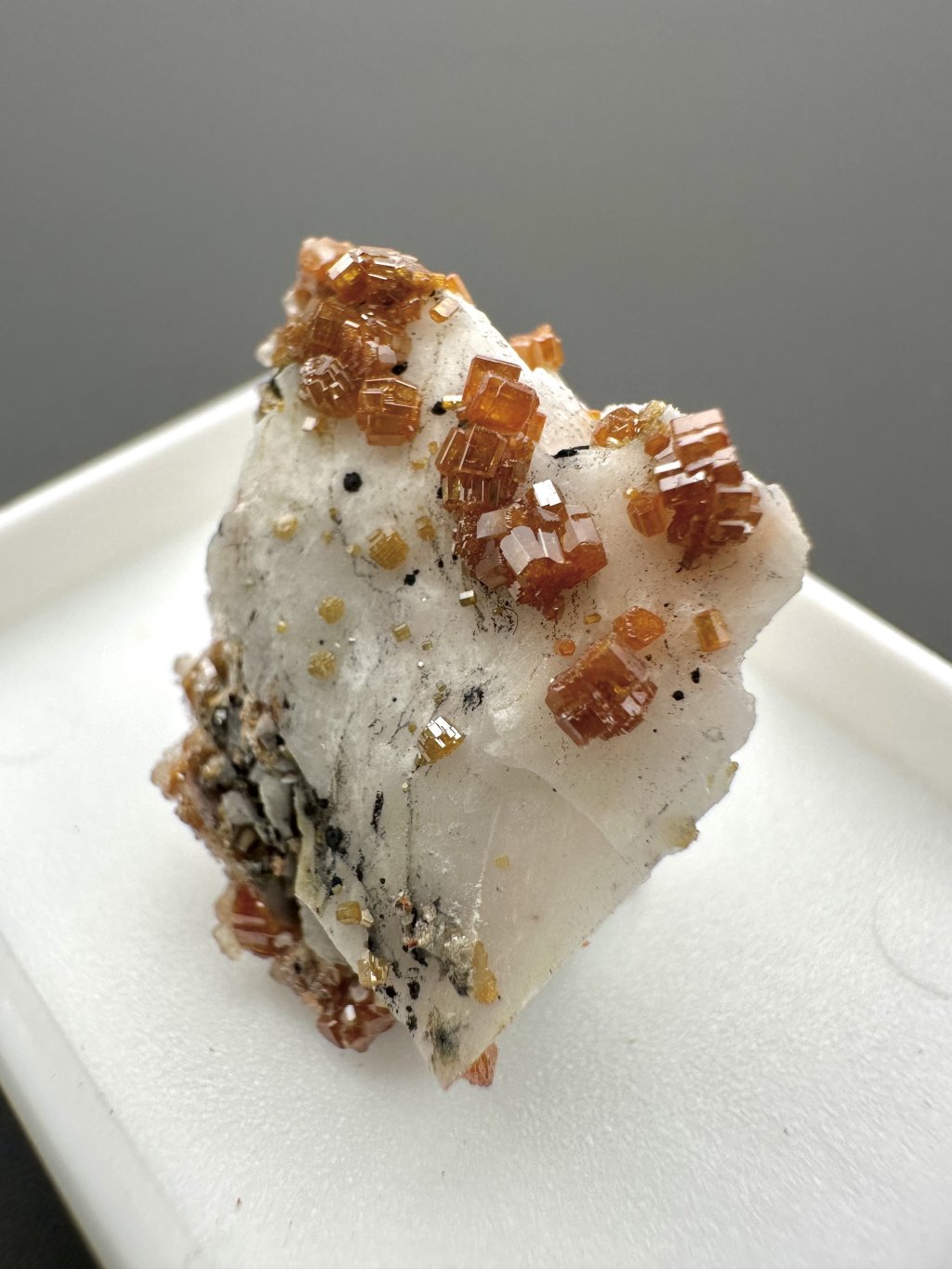 Vanadinite often forms beautiful compositions with barite, creating very aesthetic collectible specimens. In some cases, the barite, which is usually white or yellowish, may be covered with manganese salts. The manganese salts give the barite dark brown to black hues, creating a contrast with the vanadinite crystals. These crystals typically occur in bright red or orange, creating a visually attractive combination of