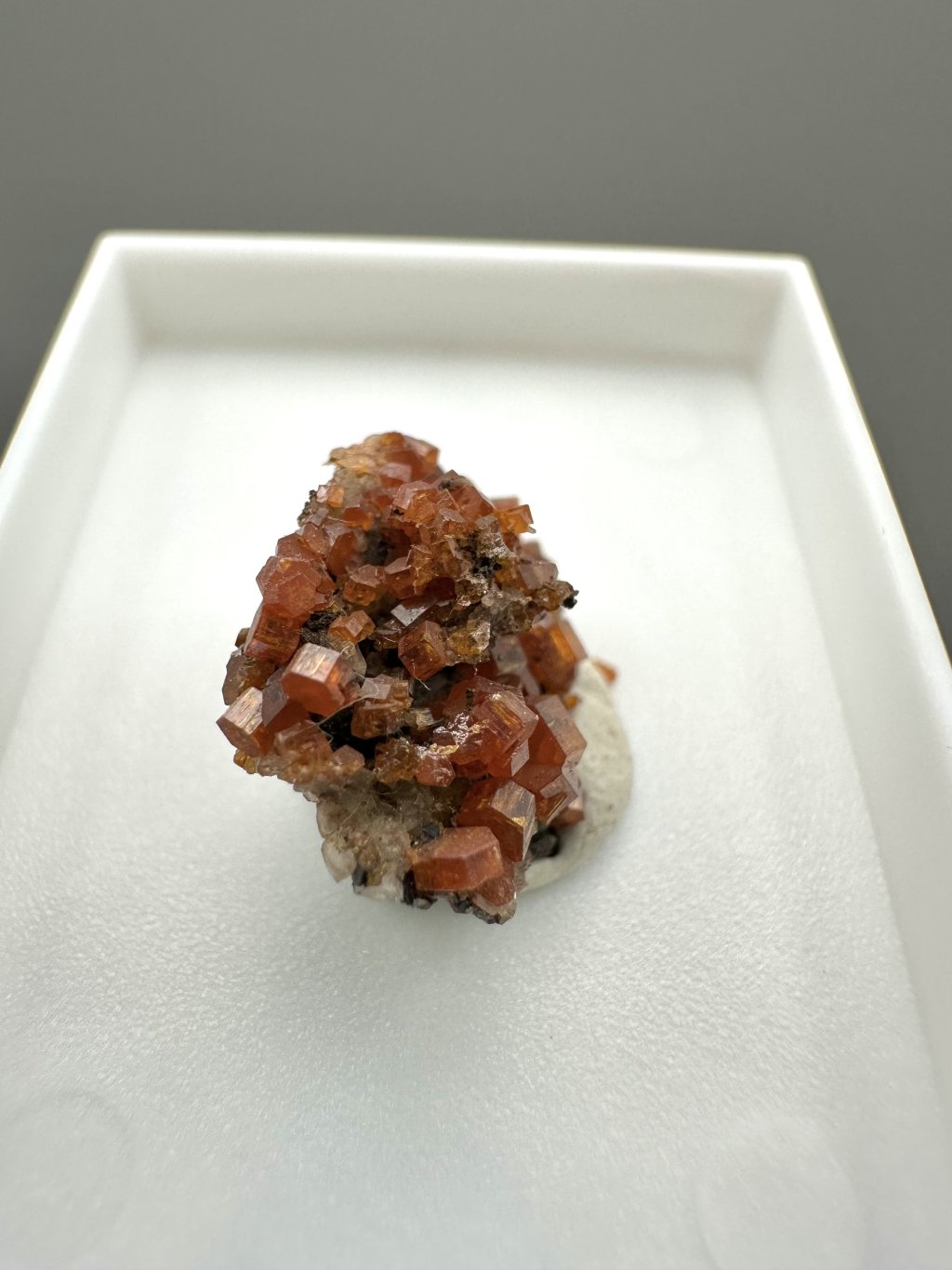Vanadinite has the chemical formula Pb₅(VO₄)₃Cl and its principal constituents are lead, vanadium and chlorine. It also contains minor amounts of phosphorus and arsenic, which may partially replace vanadium in its structure. It typically occurs in shades of red, orange, brown and sometimes yellow. The colour depends on the vanadium and trace element content of the mineral. Vanadinite forms hexagonal (hexagonal) crystals that are often perfectly developed. It can also form stellate, granular or massive aggregates. Vanadinite crystals have a high glassy to diamond-like luster, which contributes to their attractive appearance and popularity among mineral collectors.