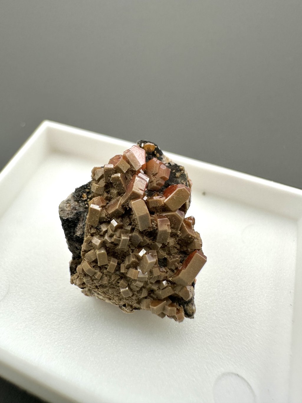 Vanadinite often forms beautiful compositions with barite, creating very aesthetic collectible specimens. In some cases, the barite, which is usually white or yellowish, may be covered with manganese salts. The manganese salts give the barite dark brown to black hues, creating a contrast with the vanadinite crystals. These crystals typically occur in bright red or orange, creating a visually attractive combination of