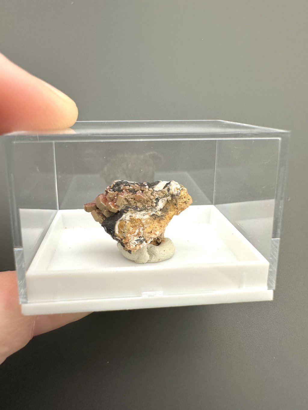 Vanadinite often forms beautiful compositions with barite, creating very aesthetic collectible specimens. In some cases, the barite, which is usually white or yellowish, may be covered with manganese salts. The manganese salts give the barite dark brown to black hues, creating a contrast with the vanadinite crystals. These crystals typically occur in bright red or orange, creating a visually attractive combination of