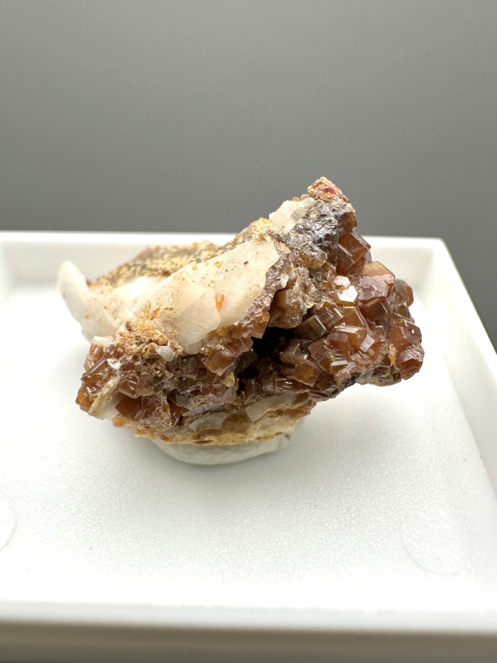 Vanadinite often forms beautiful compositions with barite, creating very aesthetic collectible specimens. In some cases, the barite, which is usually white or yellowish, may be covered with manganese salts. The manganese salts give the barite dark brown to black hues, creating a contrast with the vanadinite crystals. These crystals typically occur in bright red or orange, creating a visually attractive combination of