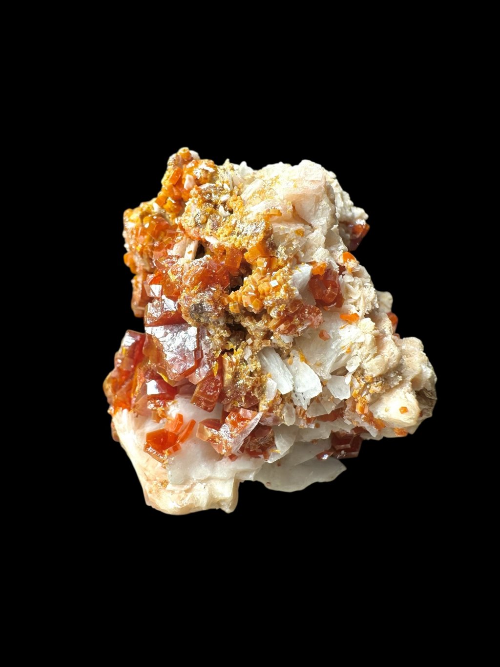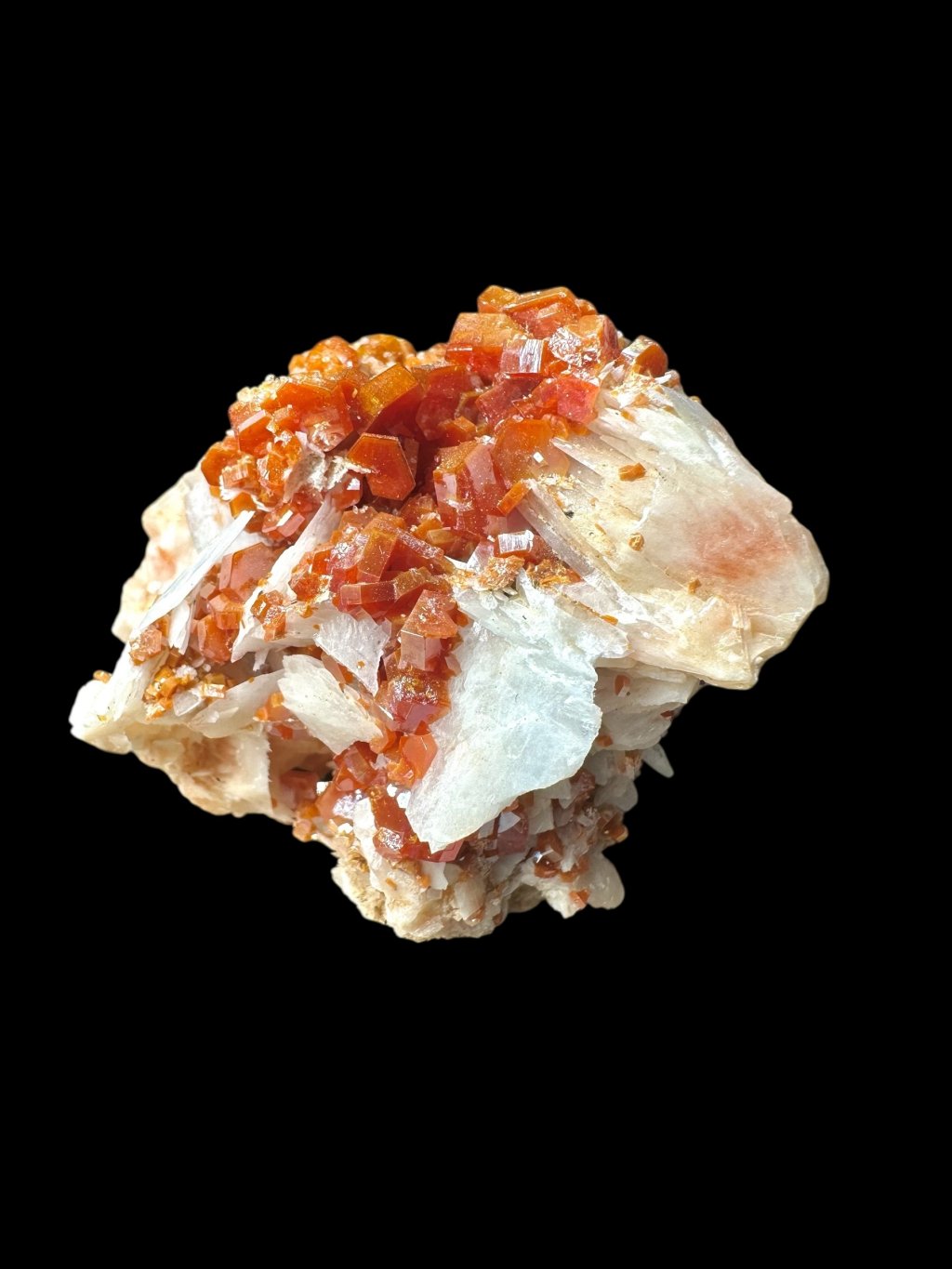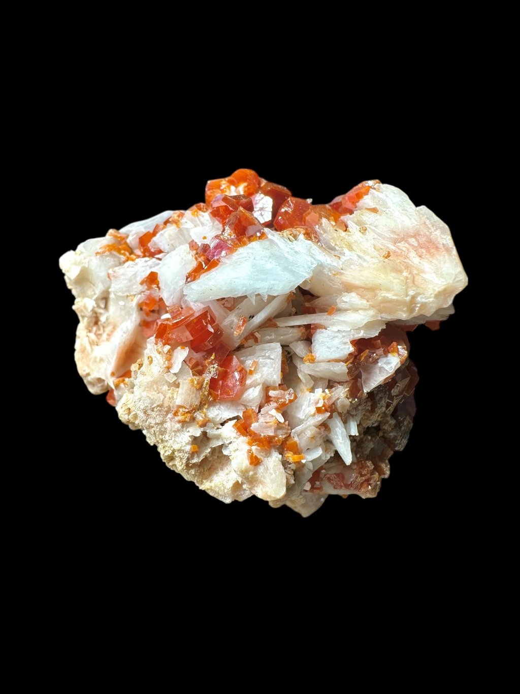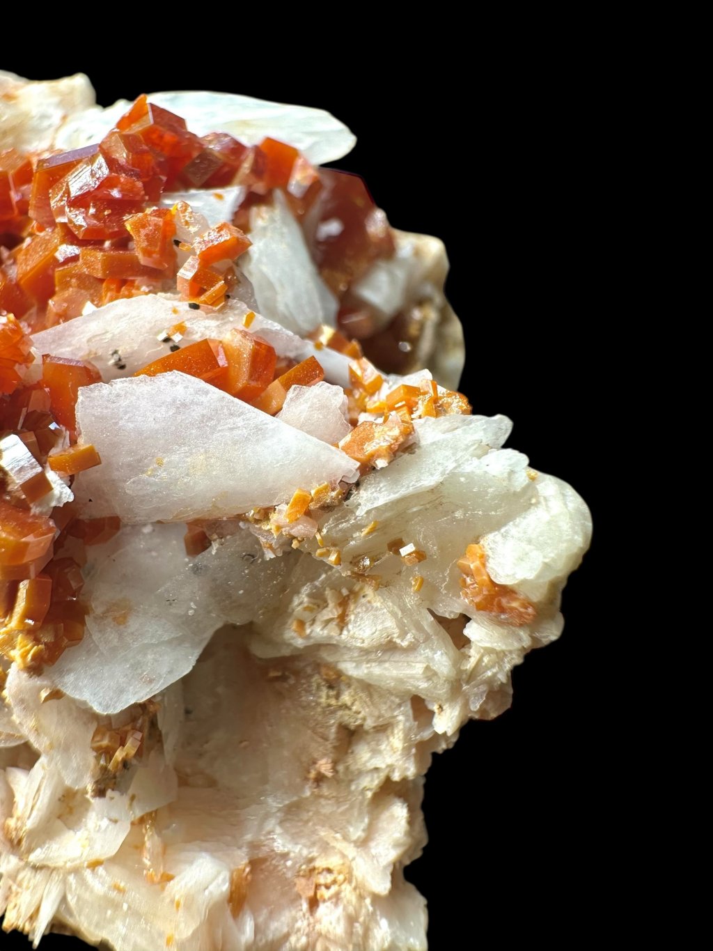 Vanadinite often forms beautiful compositions with barite, creating very aesthetic collectible specimens. In some cases, the barite, which is usually white or yellowish, may be covered with manganese salts. The manganese salts give the barite dark brown to black hues, creating a contrast with the vanadinite crystals. These crystals typically occur in bright red or orange, creating a visually attractive combination of