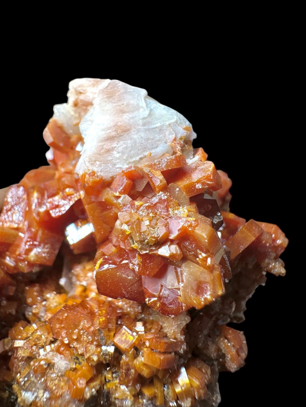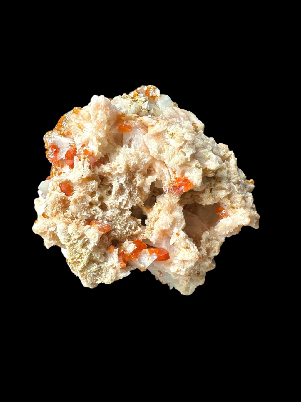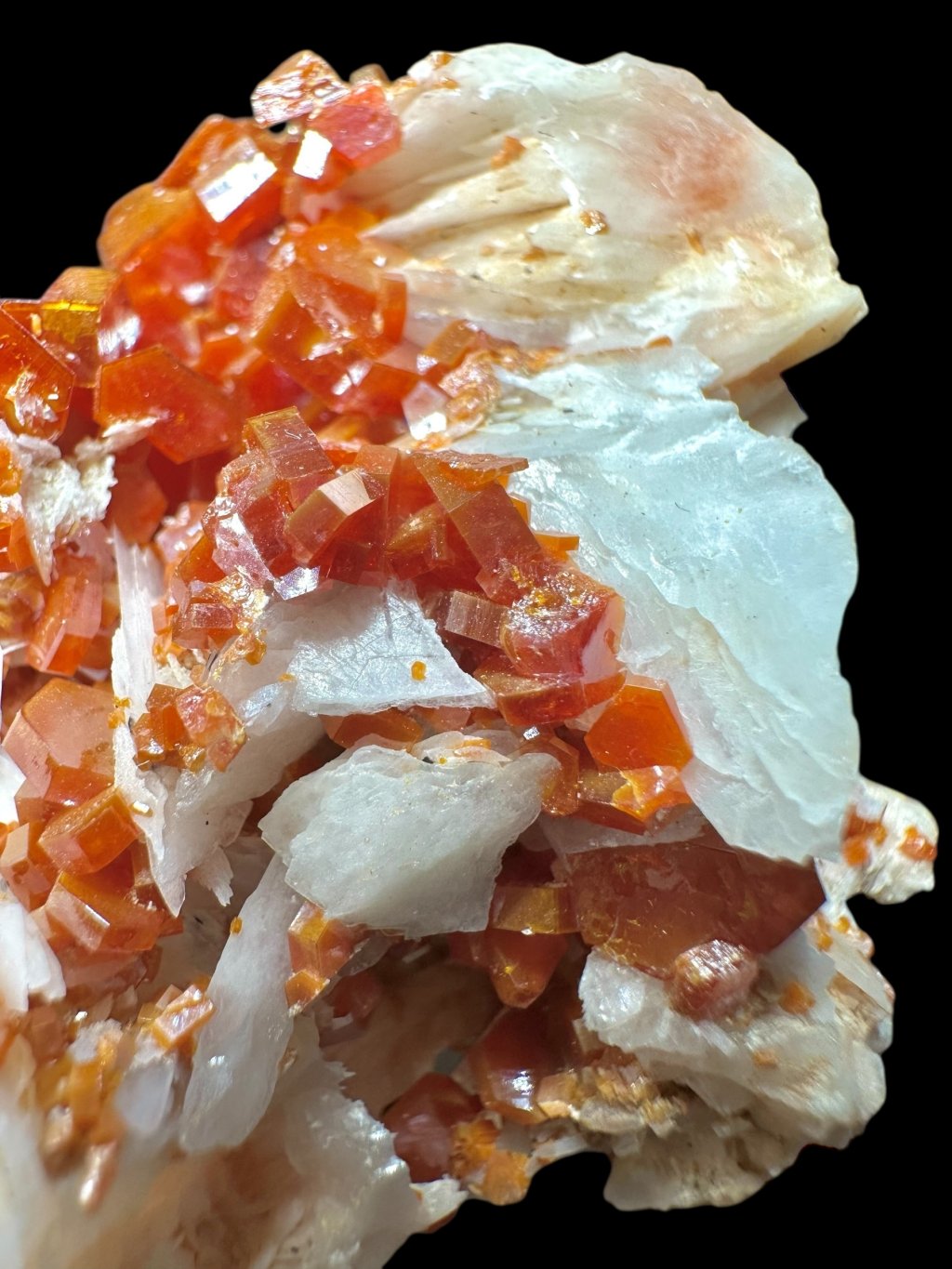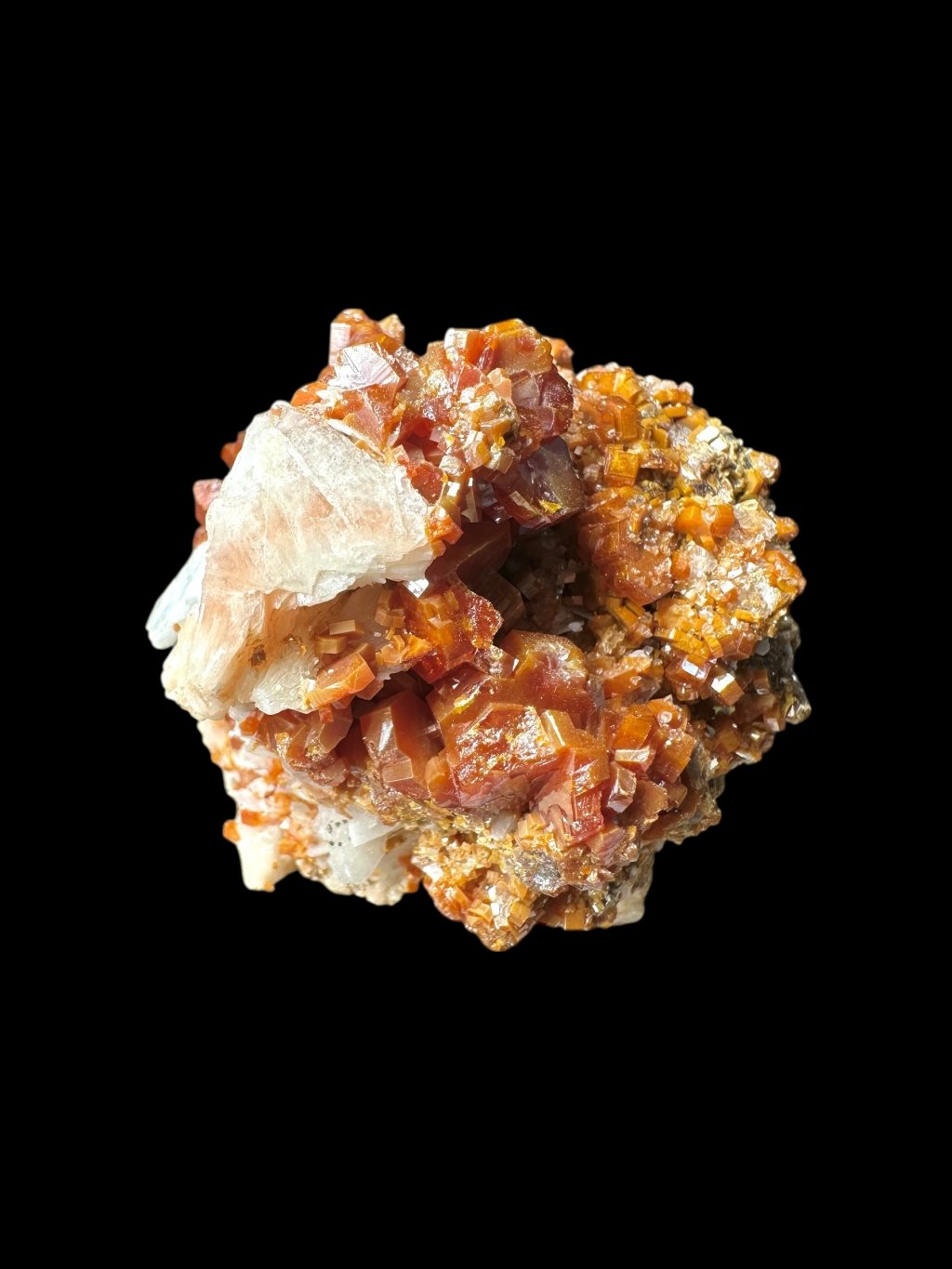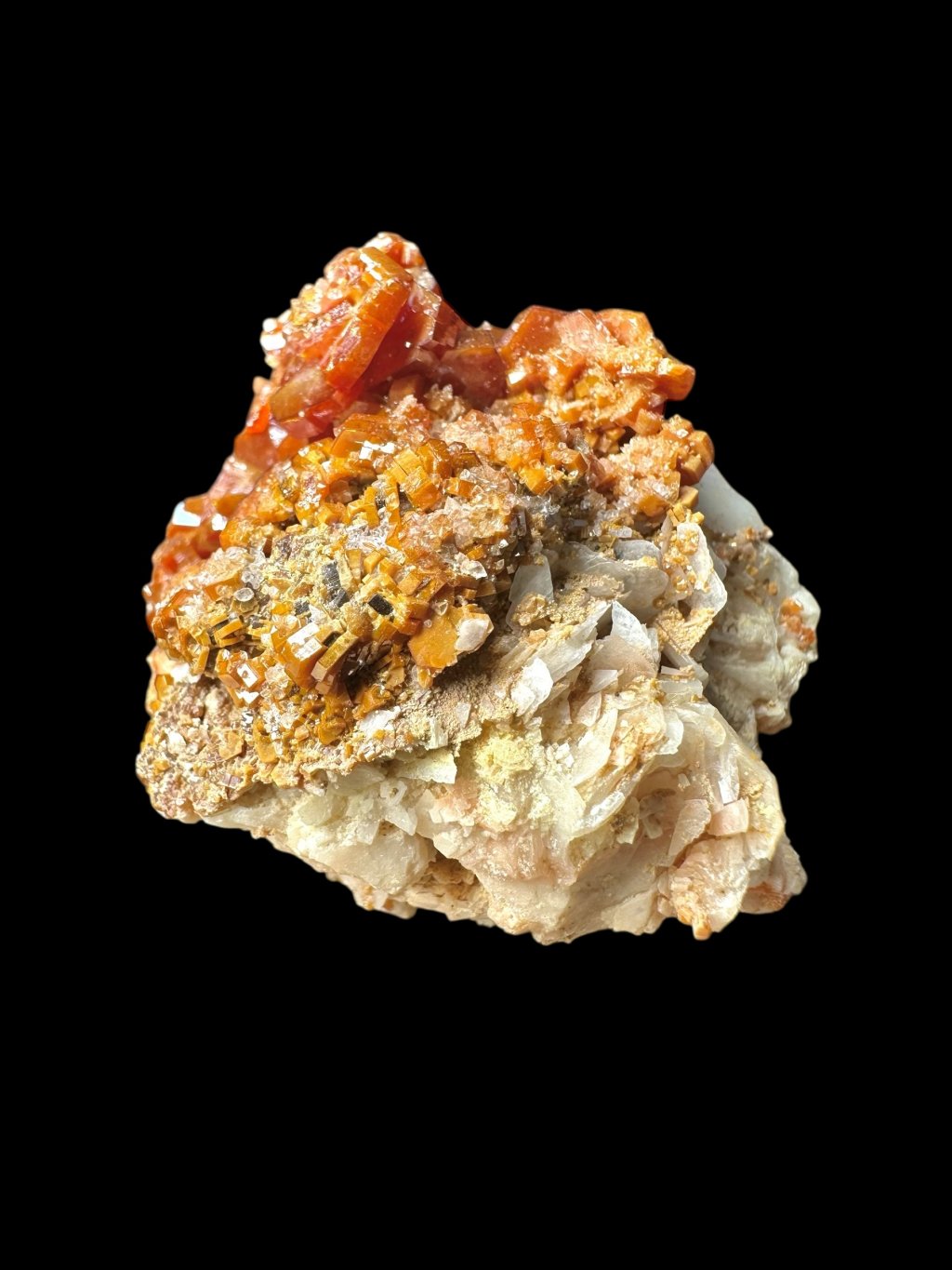 Vanadinite often forms beautiful compositions with barite, creating very aesthetic collectible specimens. In some cases, the barite, which is usually white or yellowish, may be covered with manganese salts. The manganese salts give the barite dark brown to black hues, creating a contrast with the vanadinite crystals. These crystals typically occur in bright red or orange, creating a visually attractive combination of