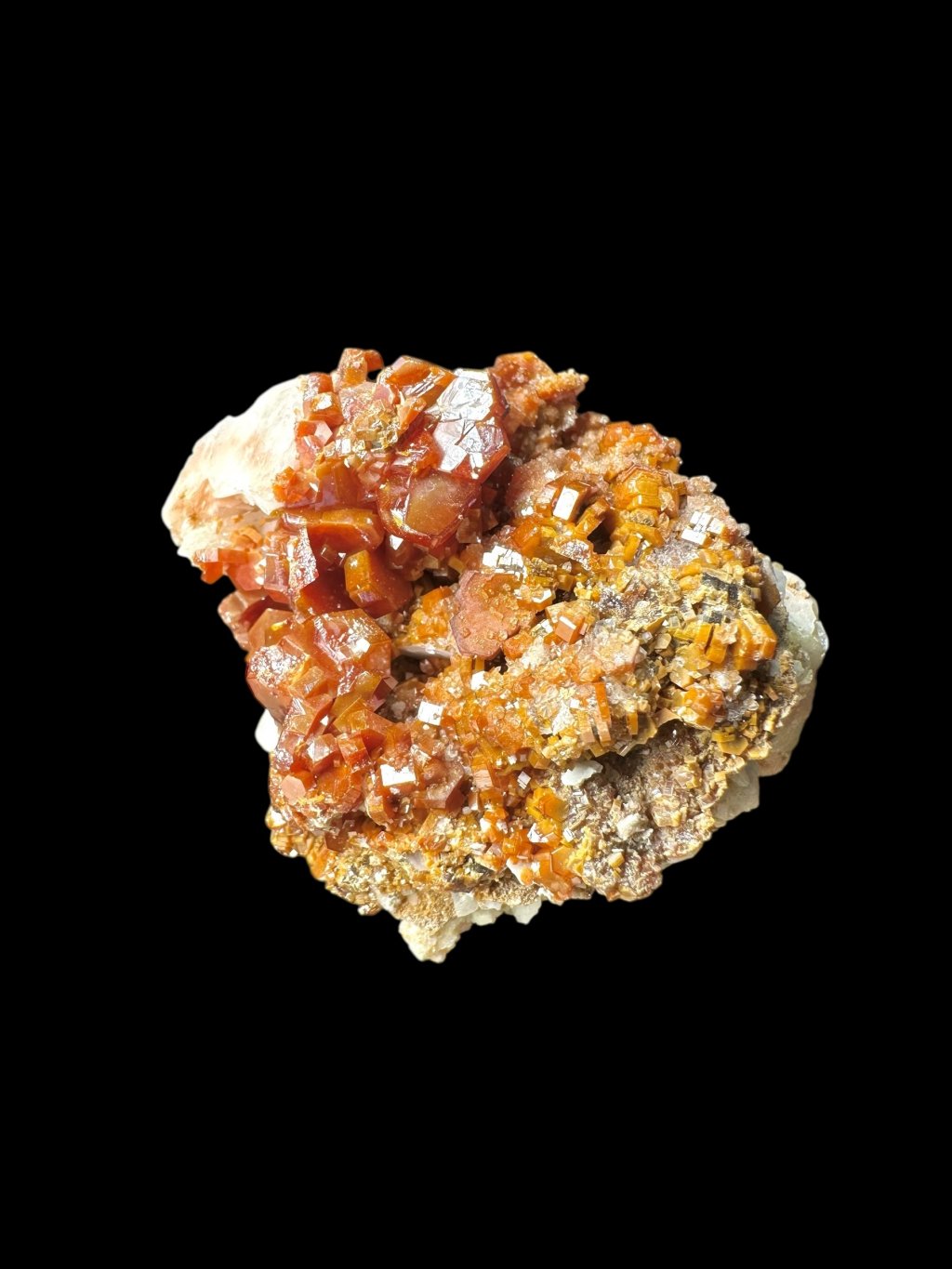 Vanadinite has the chemical formula Pb₅(VO₄)₃Cl and its principal constituents are lead, vanadium and chlorine. It also contains minor amounts of phosphorus and arsenic, which may partially replace vanadium in its structure. It typically occurs in shades of red, orange, brown and sometimes yellow. The colour depends on the vanadium and trace element content of the mineral. Vanadinite forms hexagonal (hexagonal) crystals that are often perfectly developed. It can also form stellate, granular or massive aggregates. Vanadinite crystals have a high glassy to diamond-like luster, which contributes to their attractive appearance and popularity among mineral collectors.