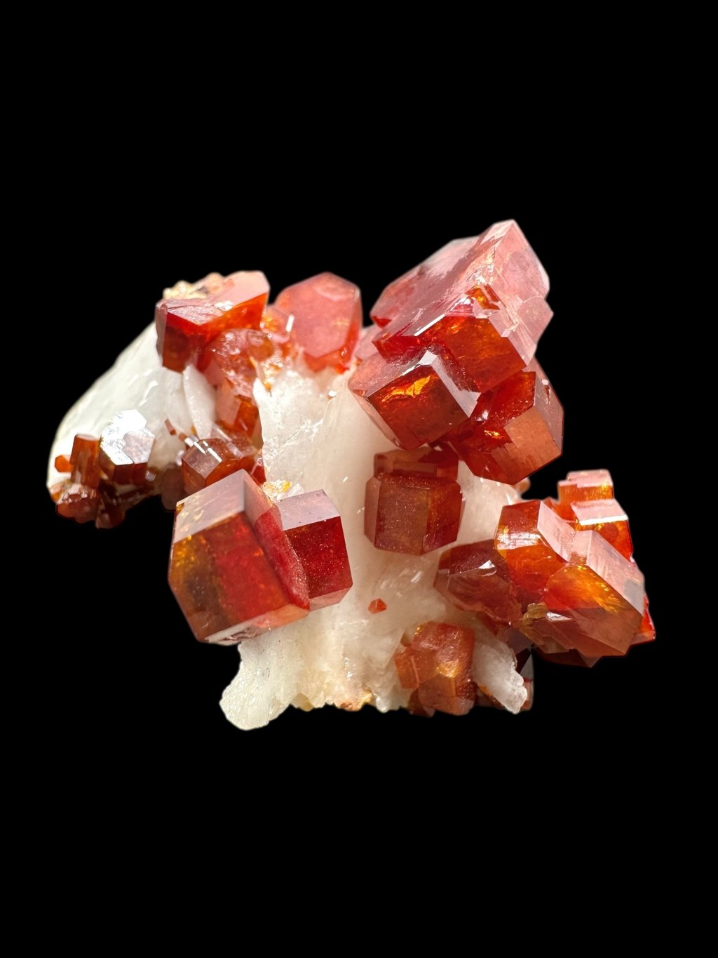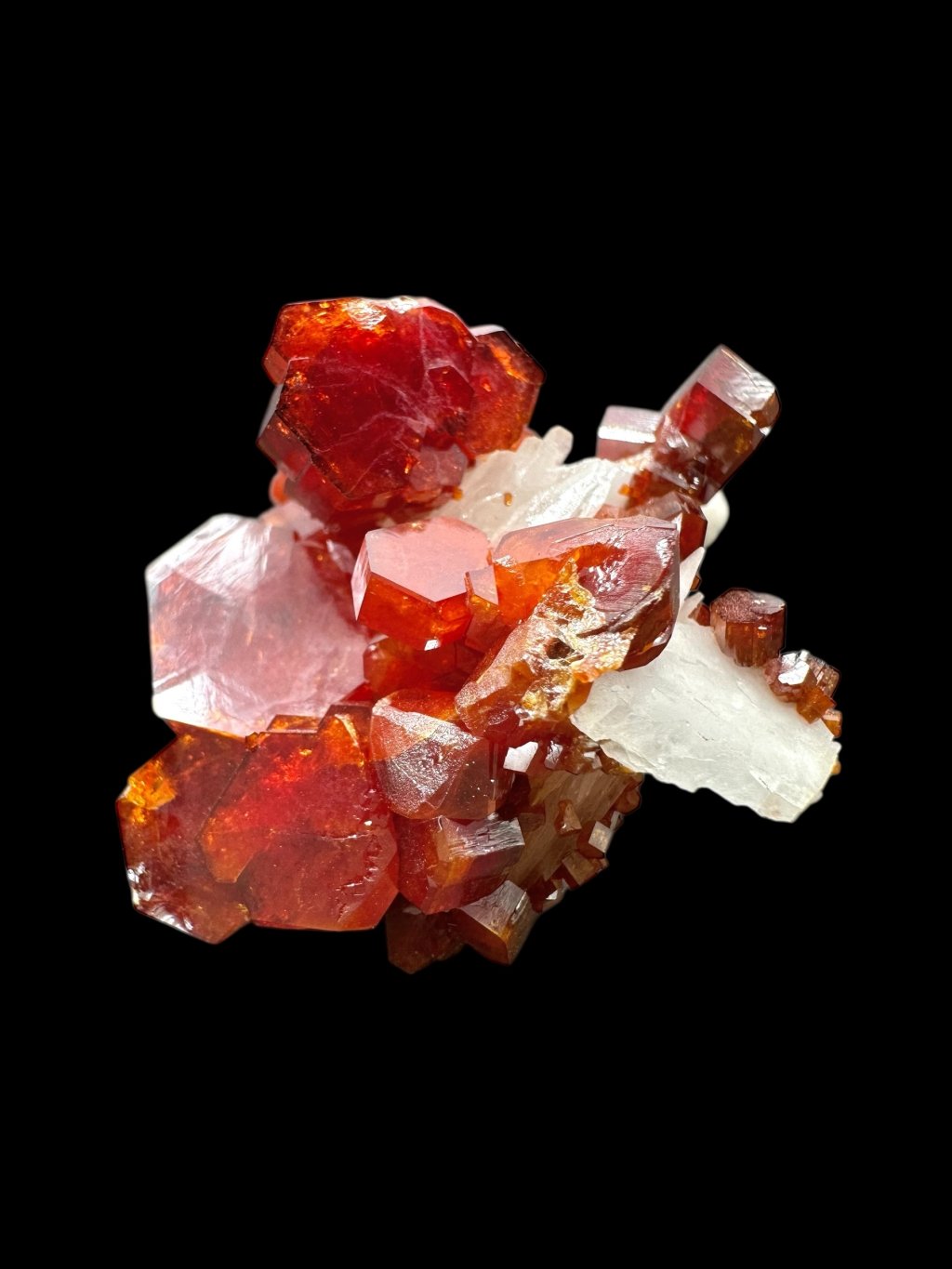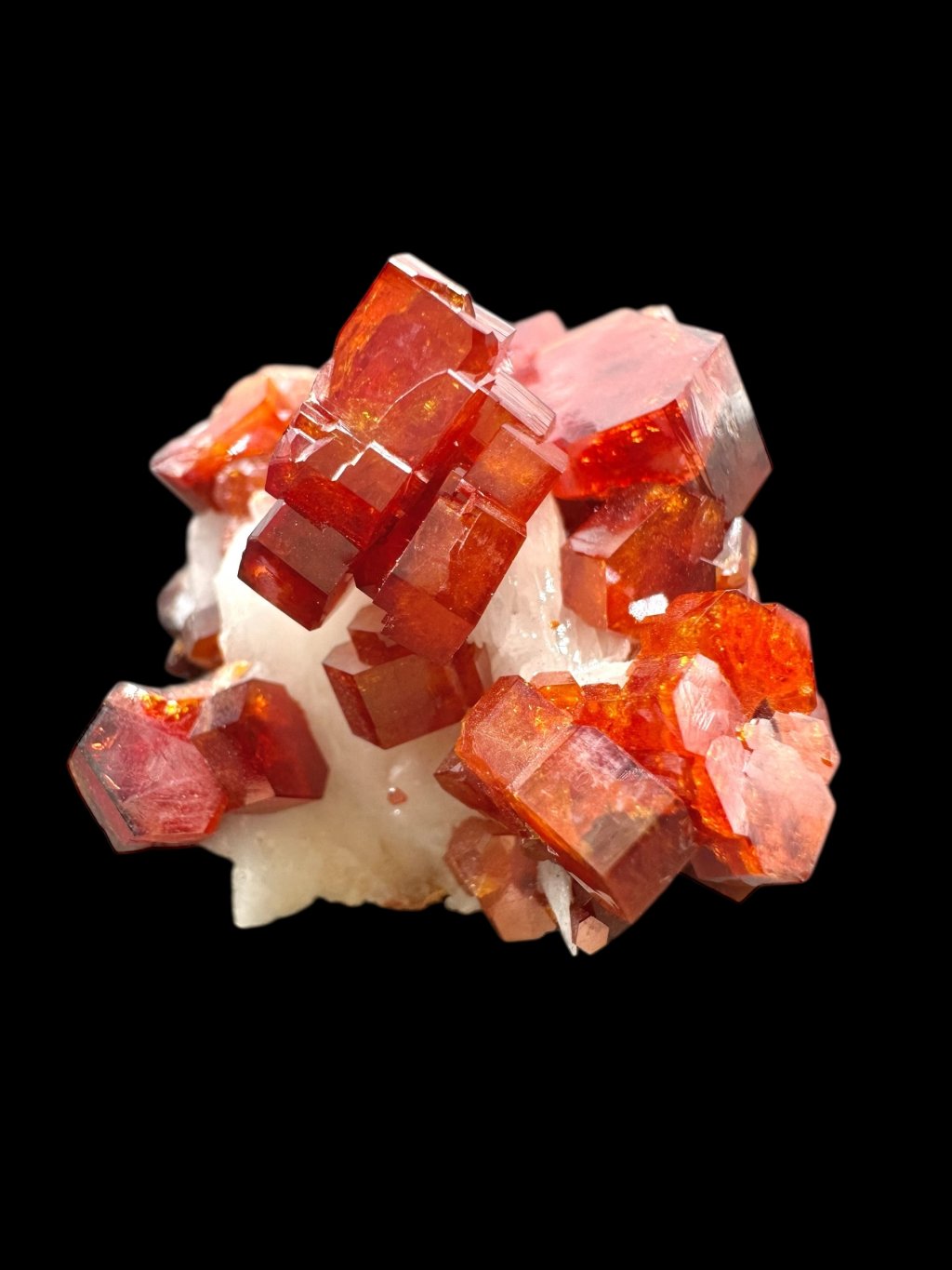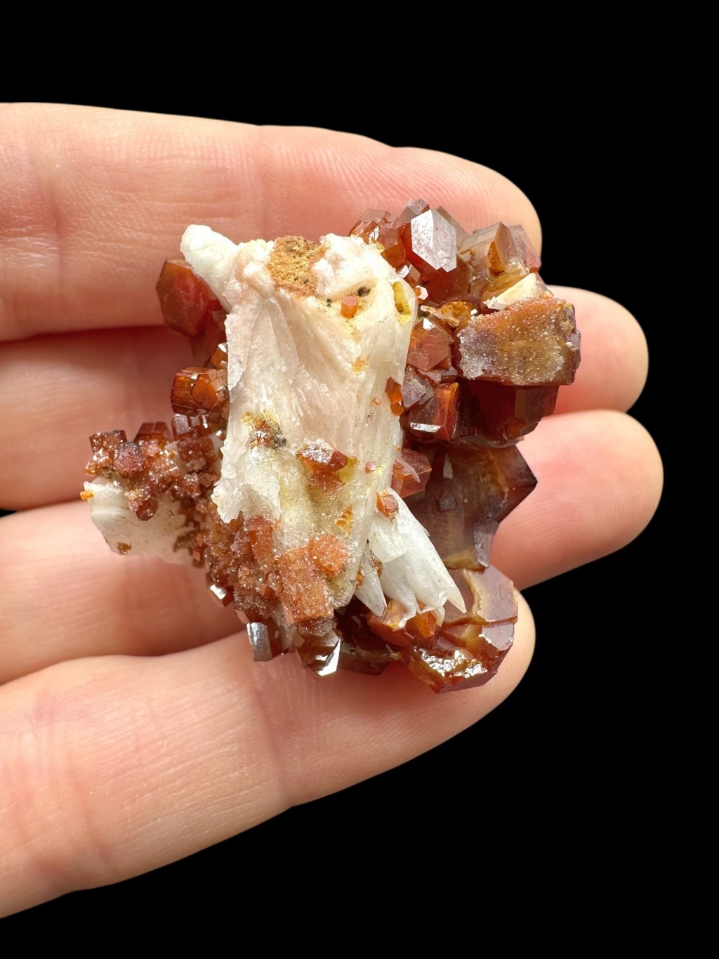 Vanadinite often forms beautiful compositions with barite, creating very aesthetic collectible specimens. In some cases, the barite, which is usually white or yellowish, may be covered with manganese salts. The manganese salts give the barite dark brown to black hues, creating a contrast with the vanadinite crystals. These crystals typically occur in bright red or orange, creating a visually attractive combination of