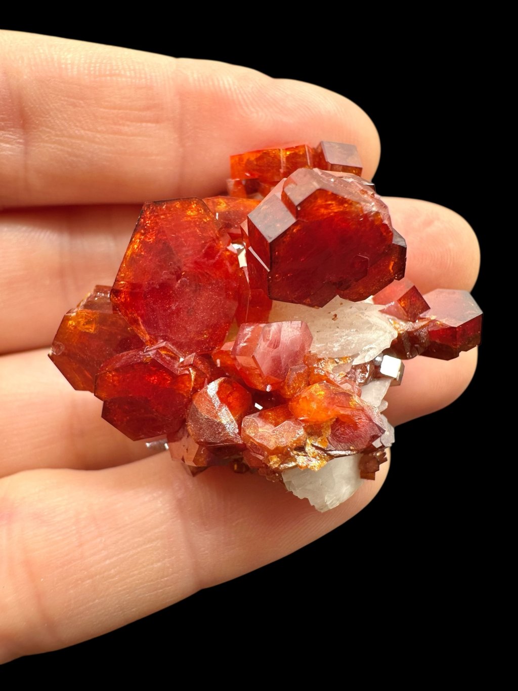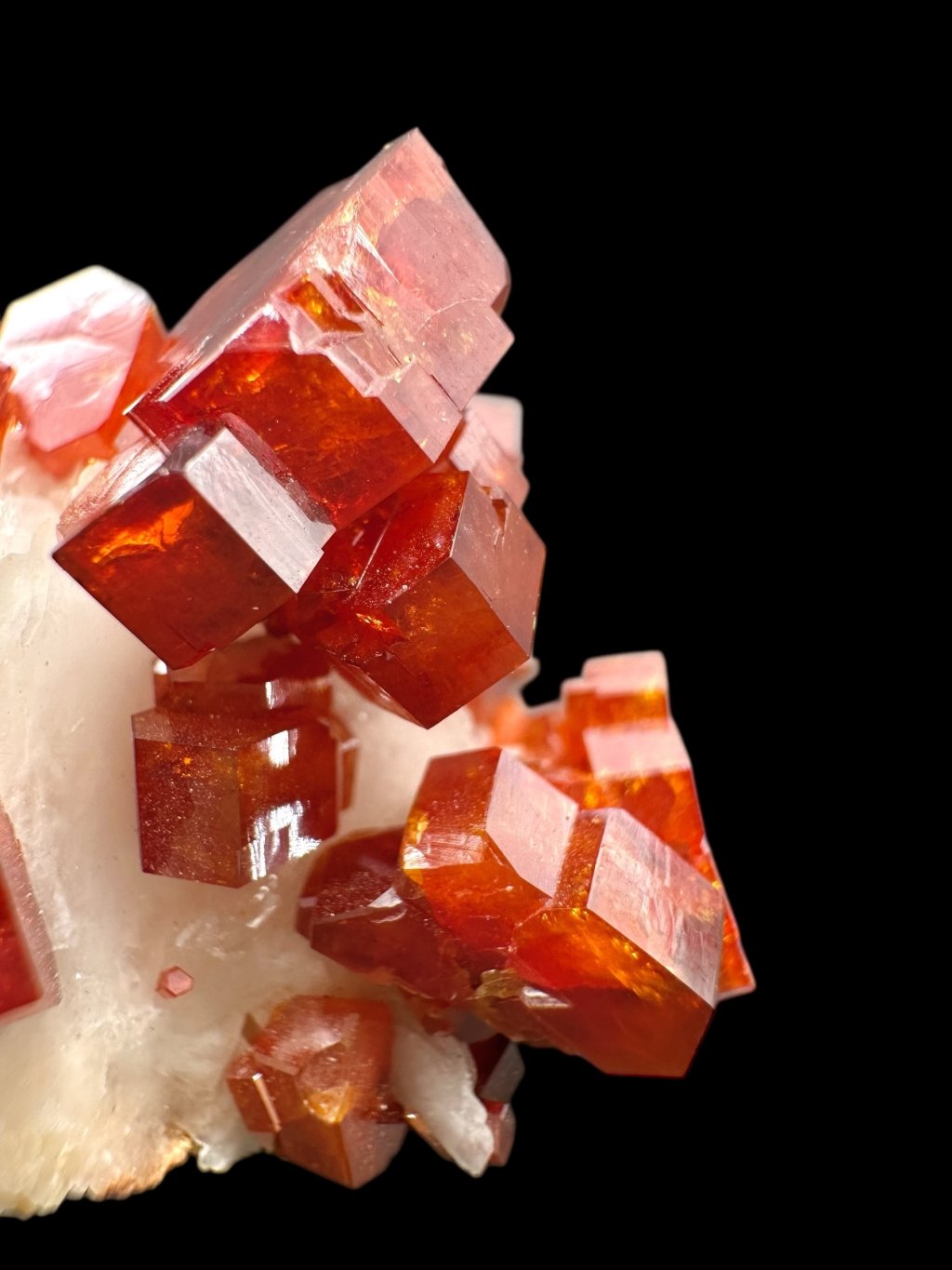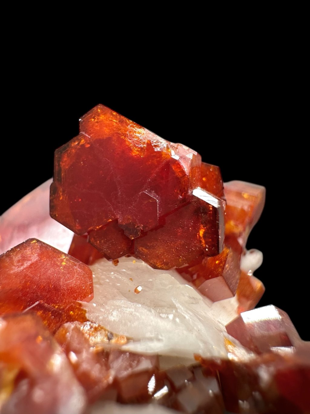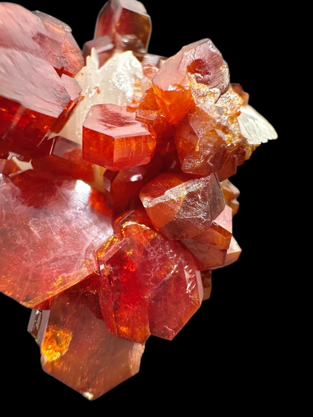 Vanadinite often forms beautiful compositions with barite, creating very aesthetic collectible specimens. In some cases, the barite, which is usually white or yellowish, may be covered with manganese salts. The manganese salts give the barite dark brown to black hues, creating a contrast with the vanadinite crystals. These crystals typically occur in bright red or orange, creating a visually attractive combination of
