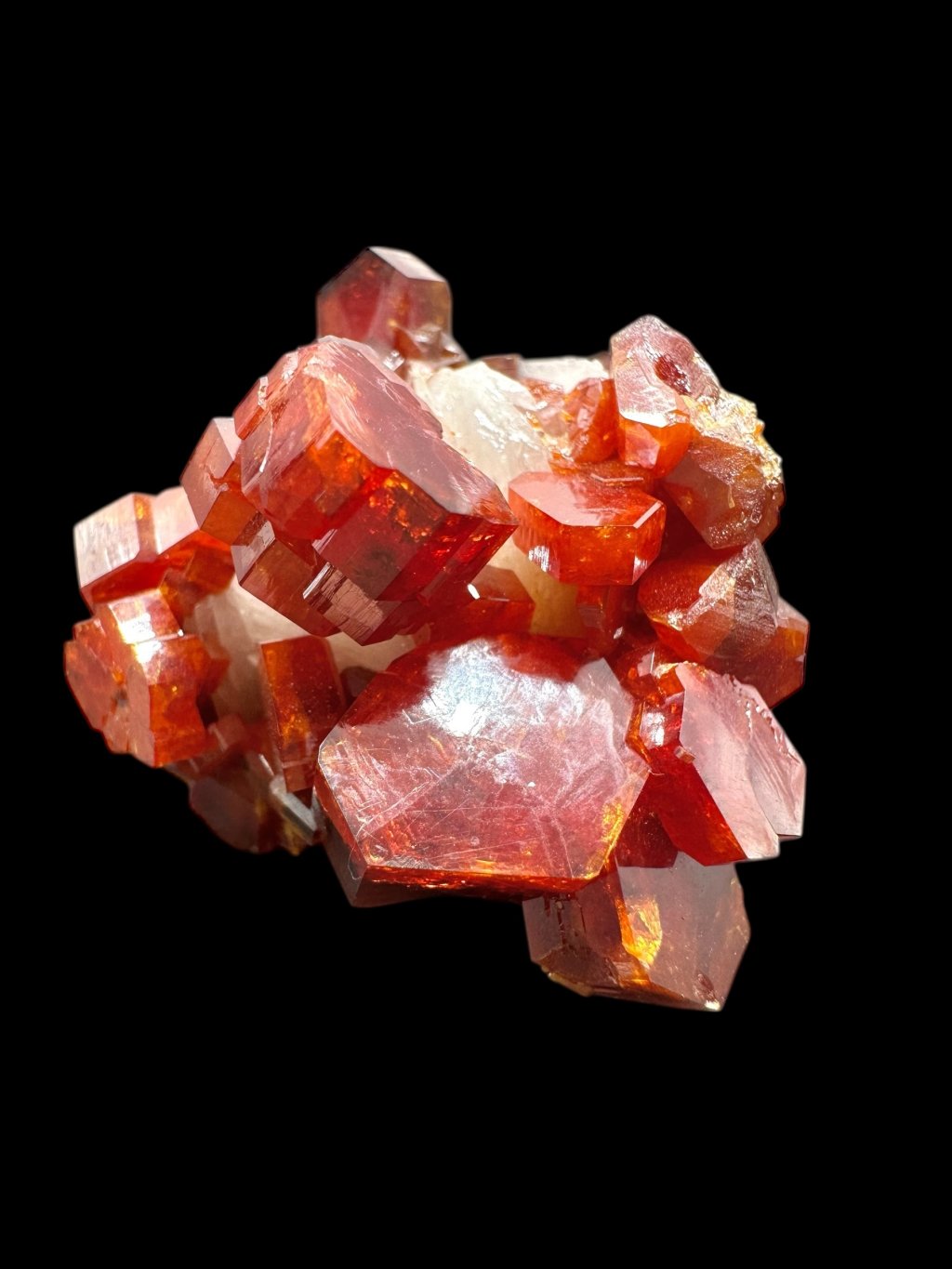 Vanadinite has the chemical formula Pb₅(VO₄)₃Cl and its principal constituents are lead, vanadium and chlorine. It also contains minor amounts of phosphorus and arsenic, which may partially replace vanadium in its structure. It typically occurs in shades of red, orange, brown and sometimes yellow. The colour depends on the vanadium and trace element content of the mineral. Vanadinite forms hexagonal (hexagonal) crystals that are often perfectly developed. It can also form stellate, granular or massive aggregates. Vanadinite crystals have a high glassy to diamond-like luster, which contributes to their attractive appearance and popularity among mineral collectors.