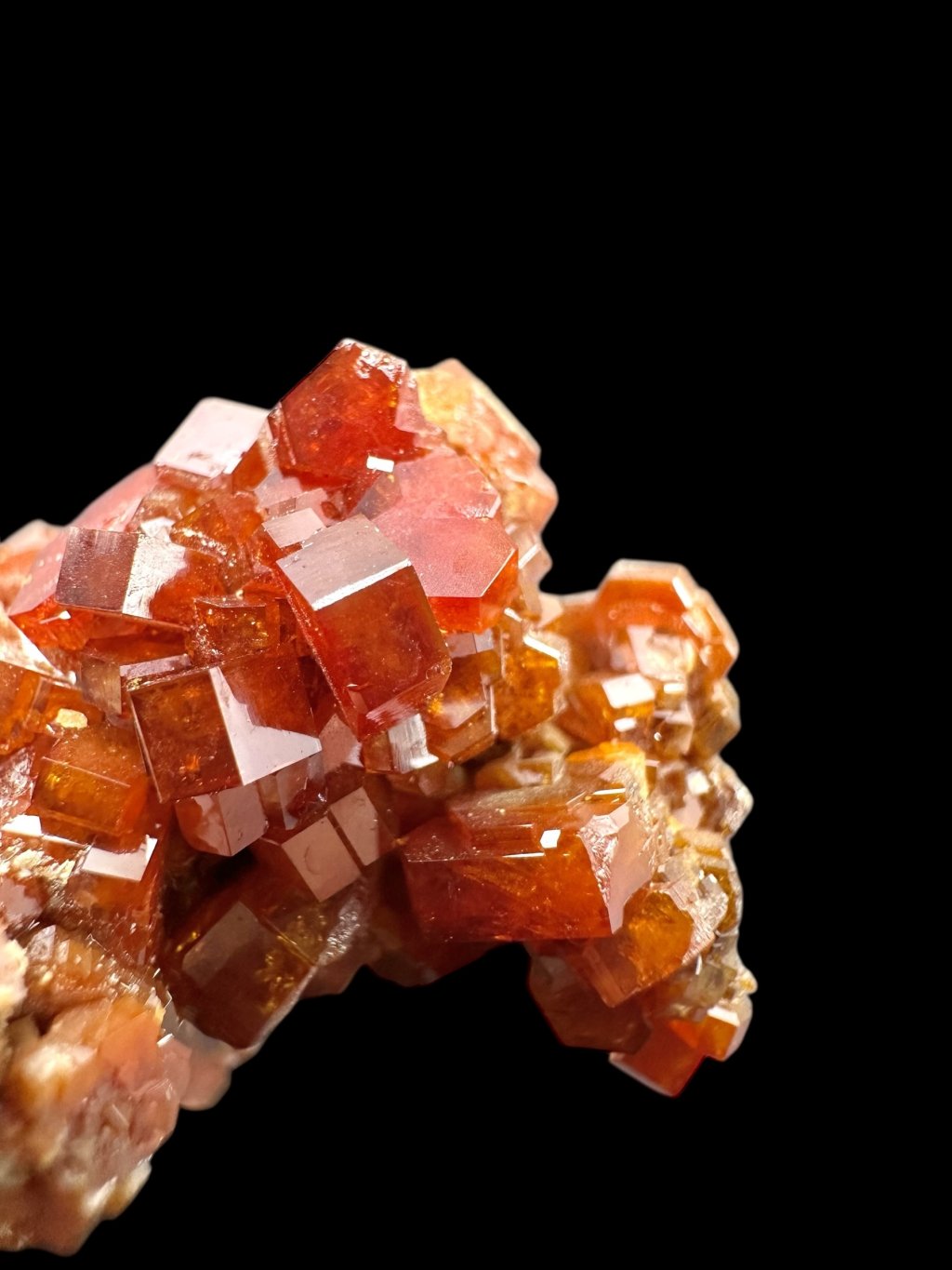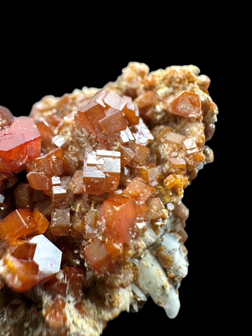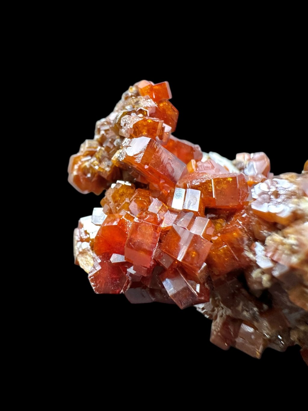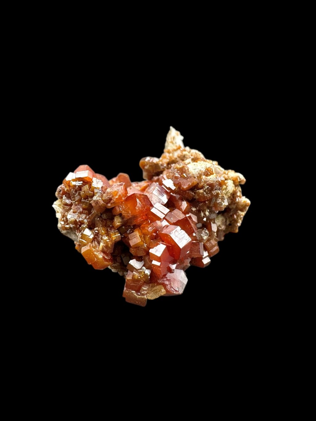 Vanadinite has the chemical formula Pb₅(VO₄)₃Cl and its principal constituents are lead, vanadium and chlorine. It also contains minor amounts of phosphorus and arsenic, which may partially replace vanadium in its structure. It typically occurs in shades of red, orange, brown and sometimes yellow. The colour depends on the vanadium and trace element content of the mineral. Vanadinite forms hexagonal (hexagonal) crystals that are often perfectly developed. It can also form stellate, granular or massive aggregates. Vanadinite crystals have a high glassy to diamond-like luster, which contributes to their attractive appearance and popularity among mineral collectors.