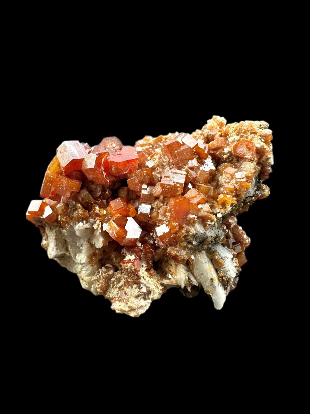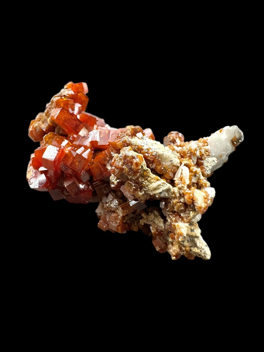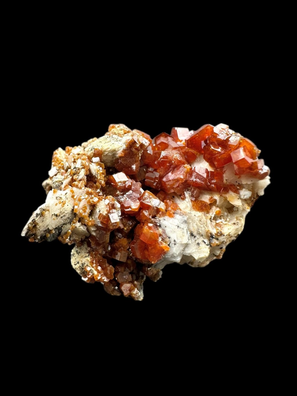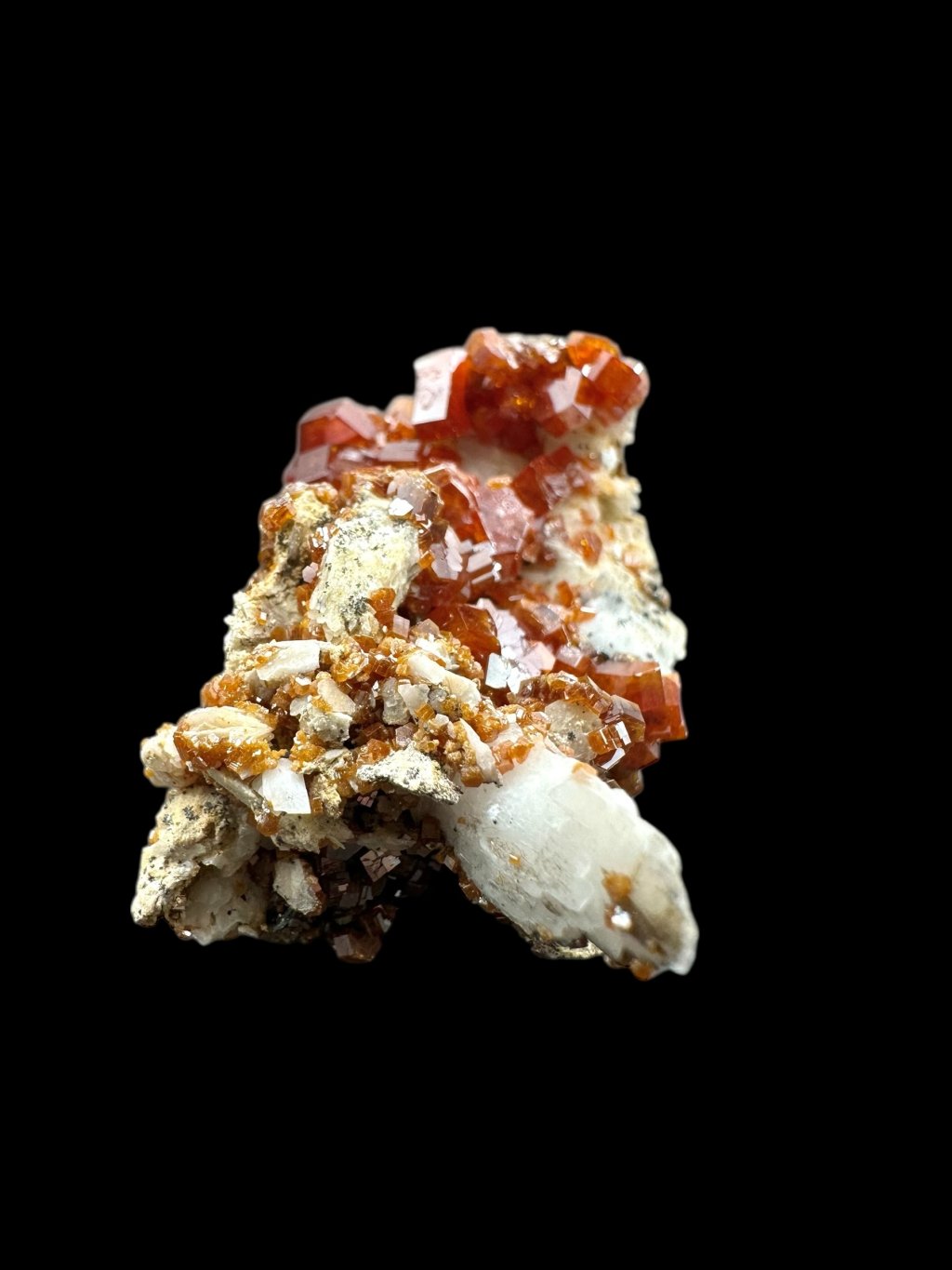 Vanadinite often forms beautiful compositions with barite, creating very aesthetic collectible specimens. In some cases, the barite, which is usually white or yellowish, may be covered with manganese salts. The manganese salts give the barite dark brown to black hues, creating a contrast with the vanadinite crystals. These crystals typically occur in bright red or orange, creating a visually attractive combination of
