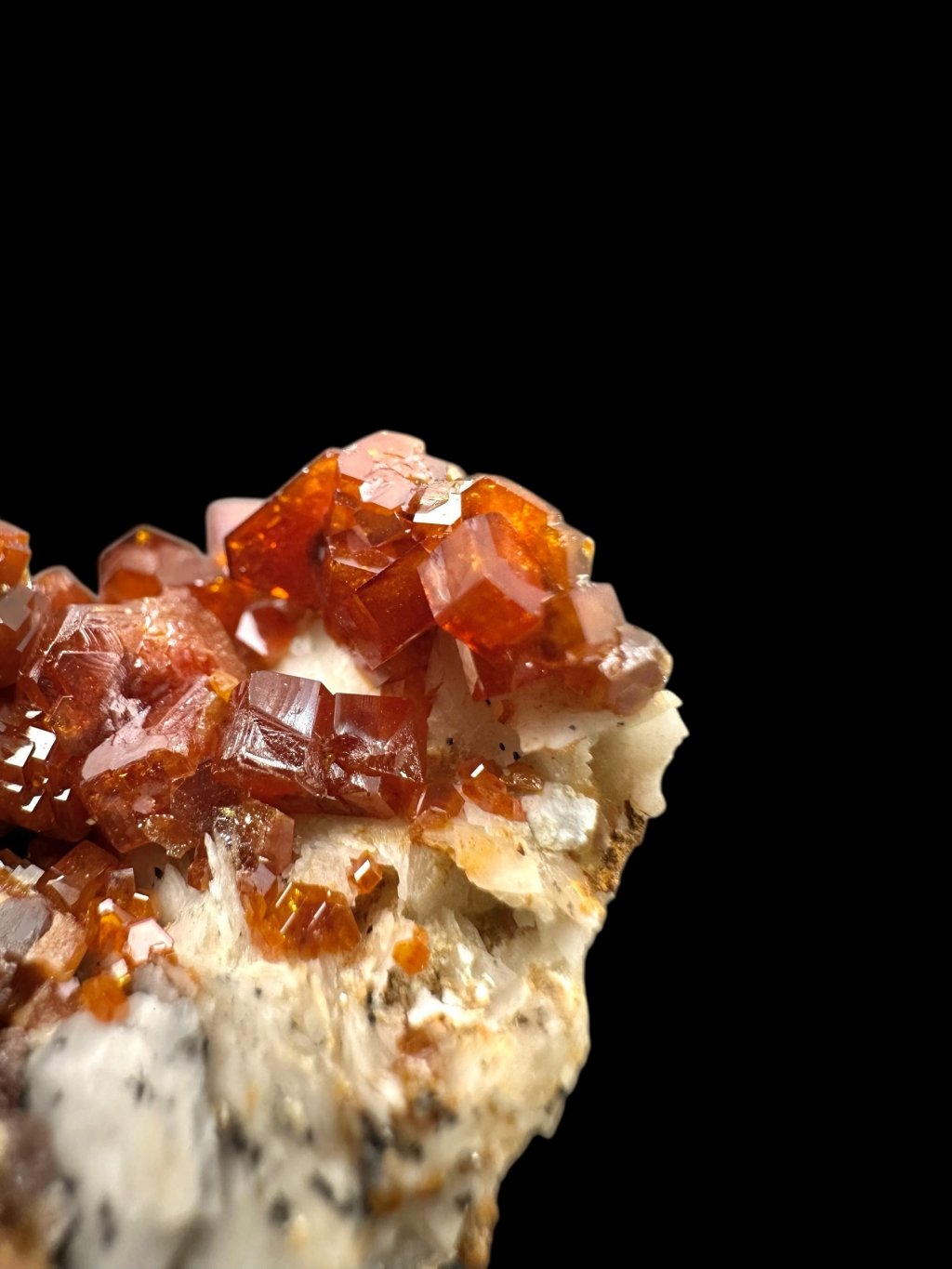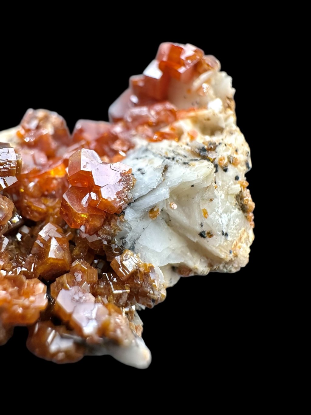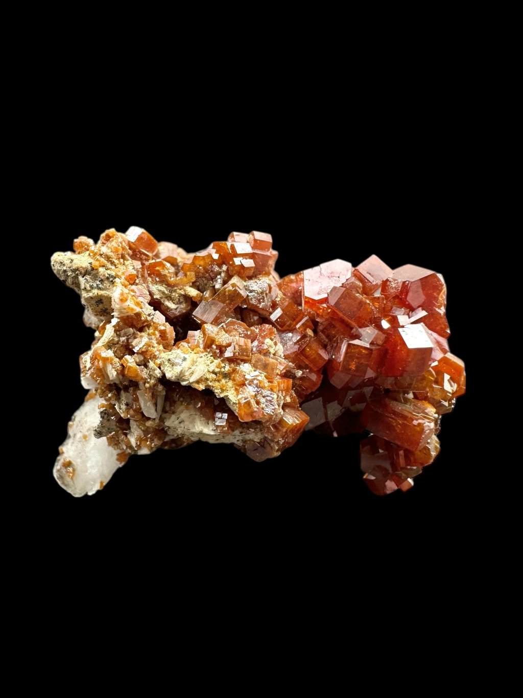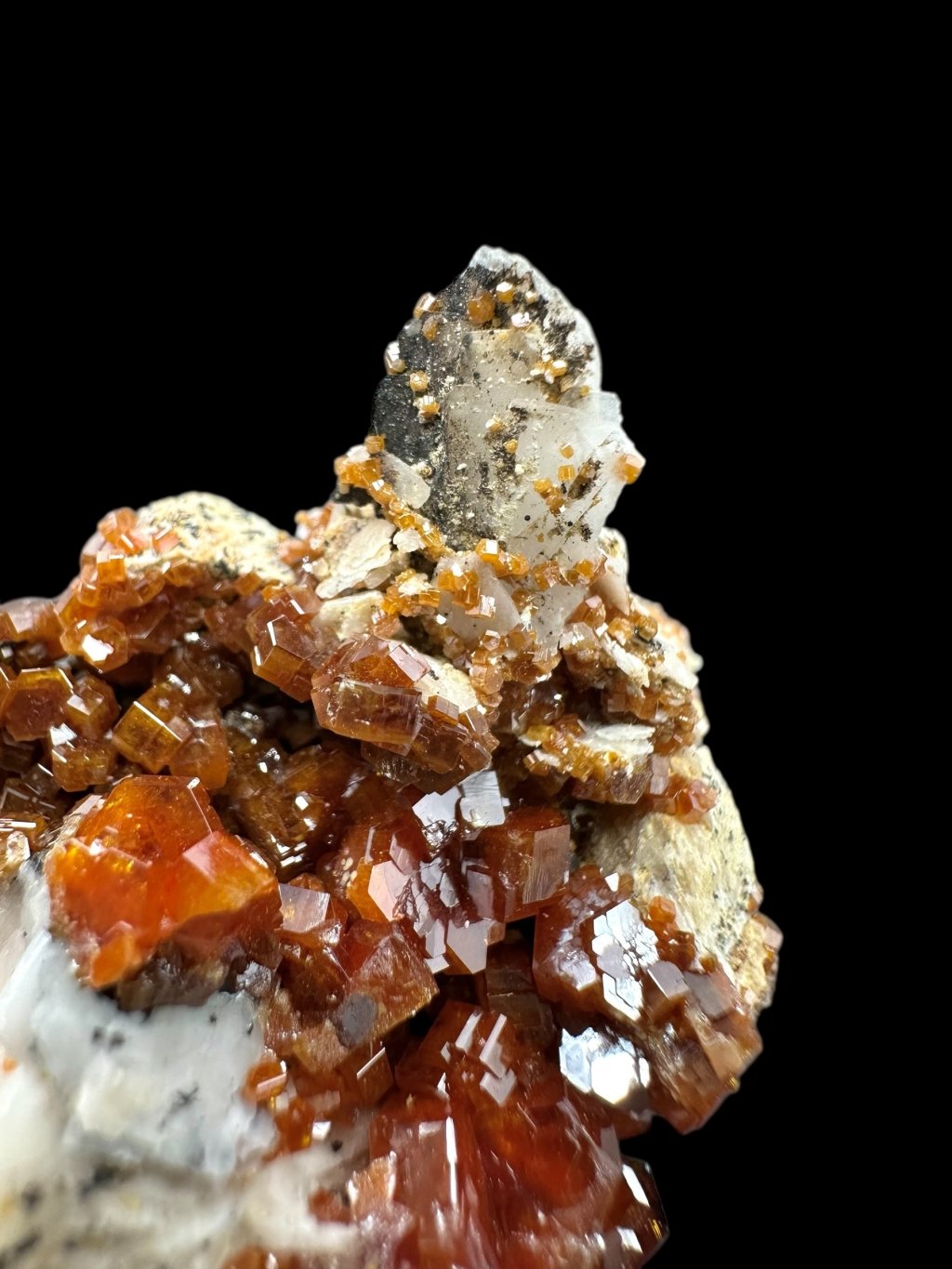 Vanadinite often forms beautiful compositions with barite, creating very aesthetic collectible specimens. In some cases, the barite, which is usually white or yellowish, may be covered with manganese salts. The manganese salts give the barite dark brown to black hues, creating a contrast with the vanadinite crystals. These crystals typically occur in bright red or orange, creating a visually attractive combination of