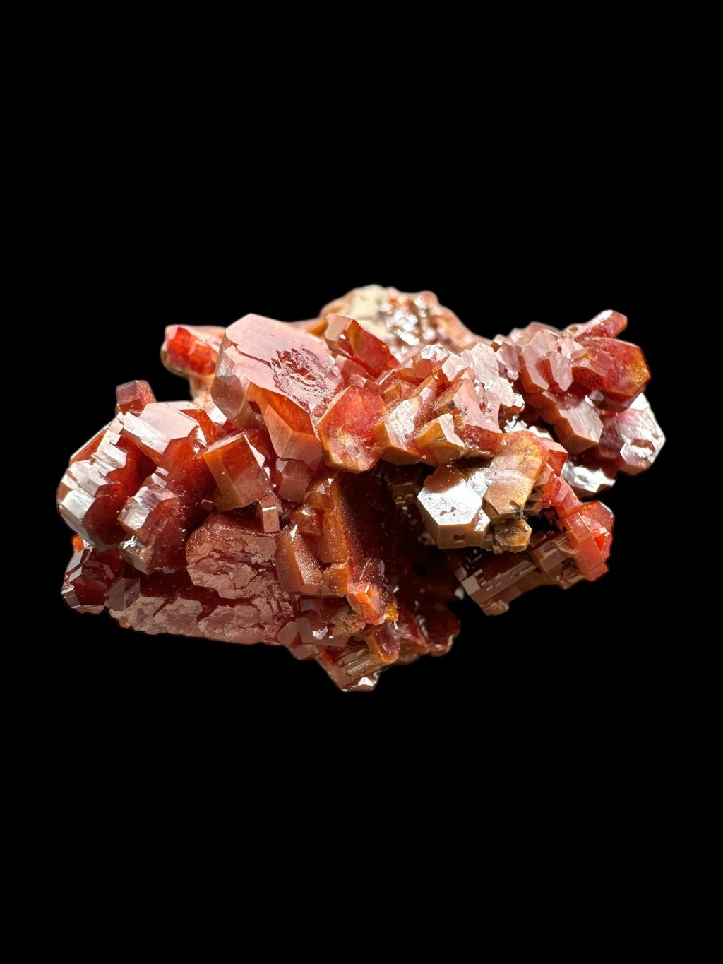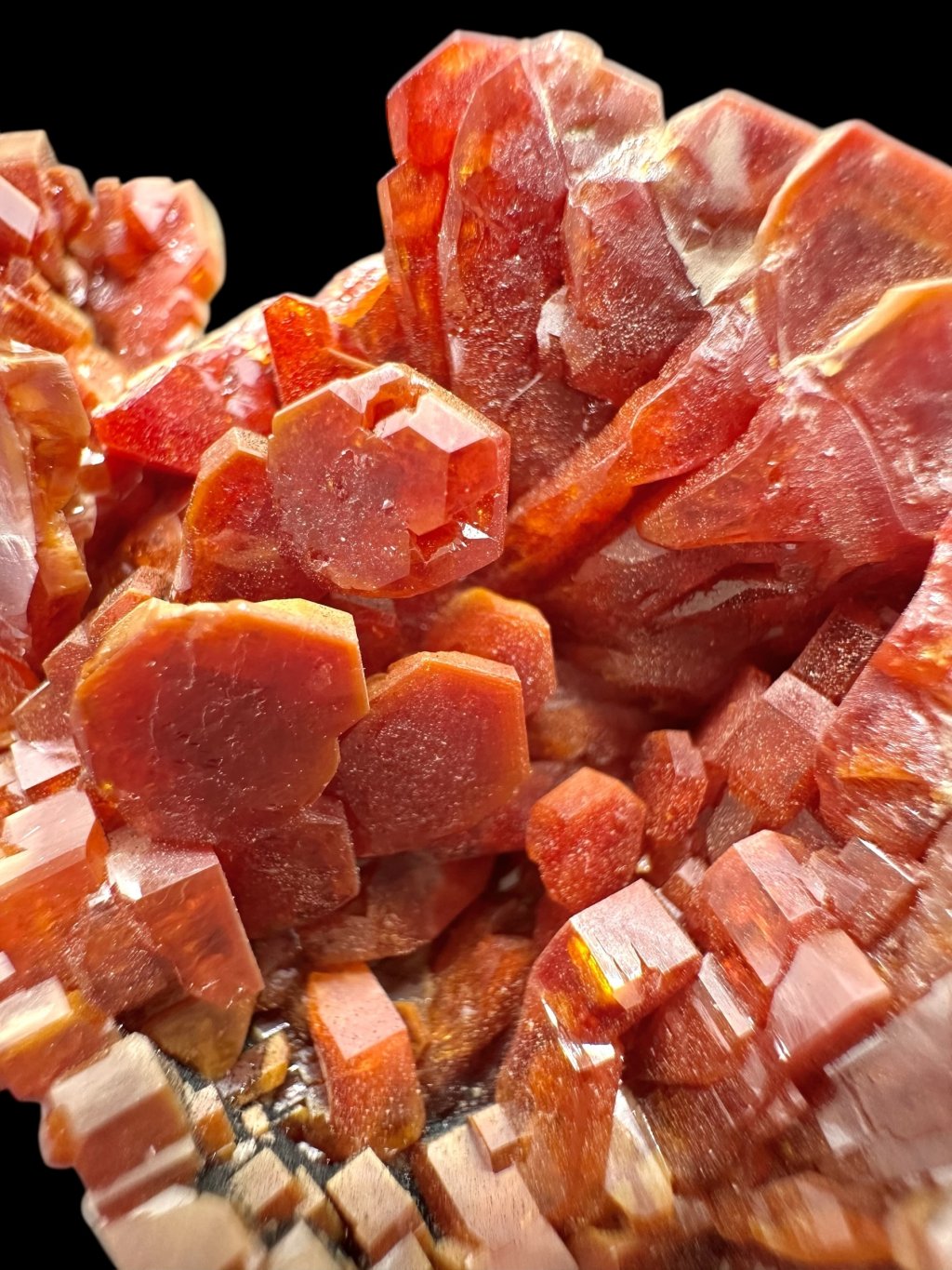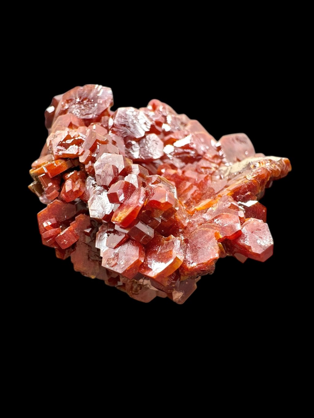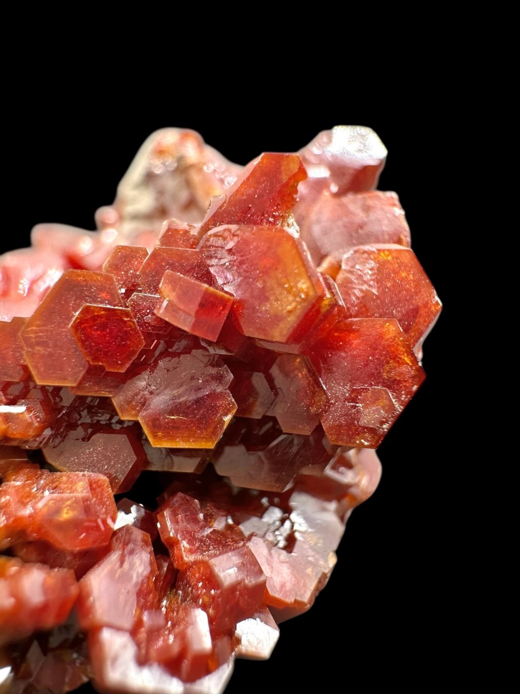 Vanadinite has the chemical formula Pb₅(VO₄)₃Cl and its principal constituents are lead, vanadium and chlorine. It also contains minor amounts of phosphorus and arsenic, which may partially replace vanadium in its structure. It typically occurs in shades of red, orange, brown and sometimes yellow. The colour depends on the vanadium and trace element content of the mineral. Vanadinite forms hexagonal (hexagonal) crystals that are often perfectly developed. It can also form stellate, granular or massive aggregates. Vanadinite crystals have a high glassy to diamond-like luster, which contributes to their attractive appearance and popularity among mineral collectors.