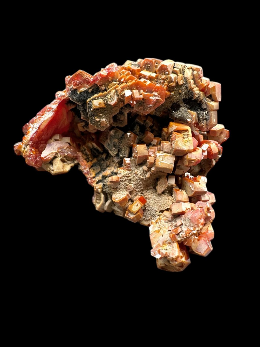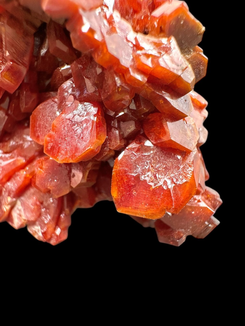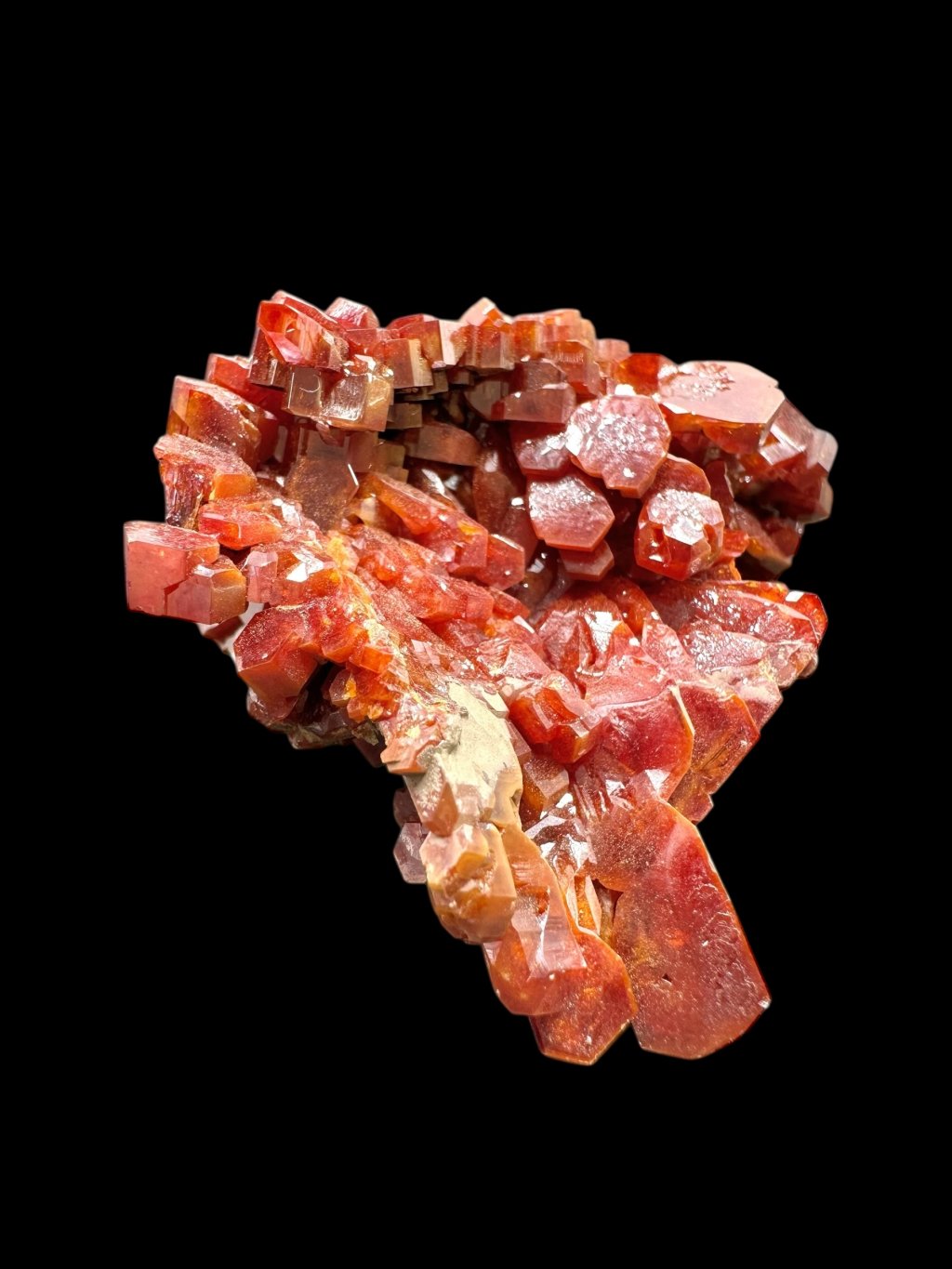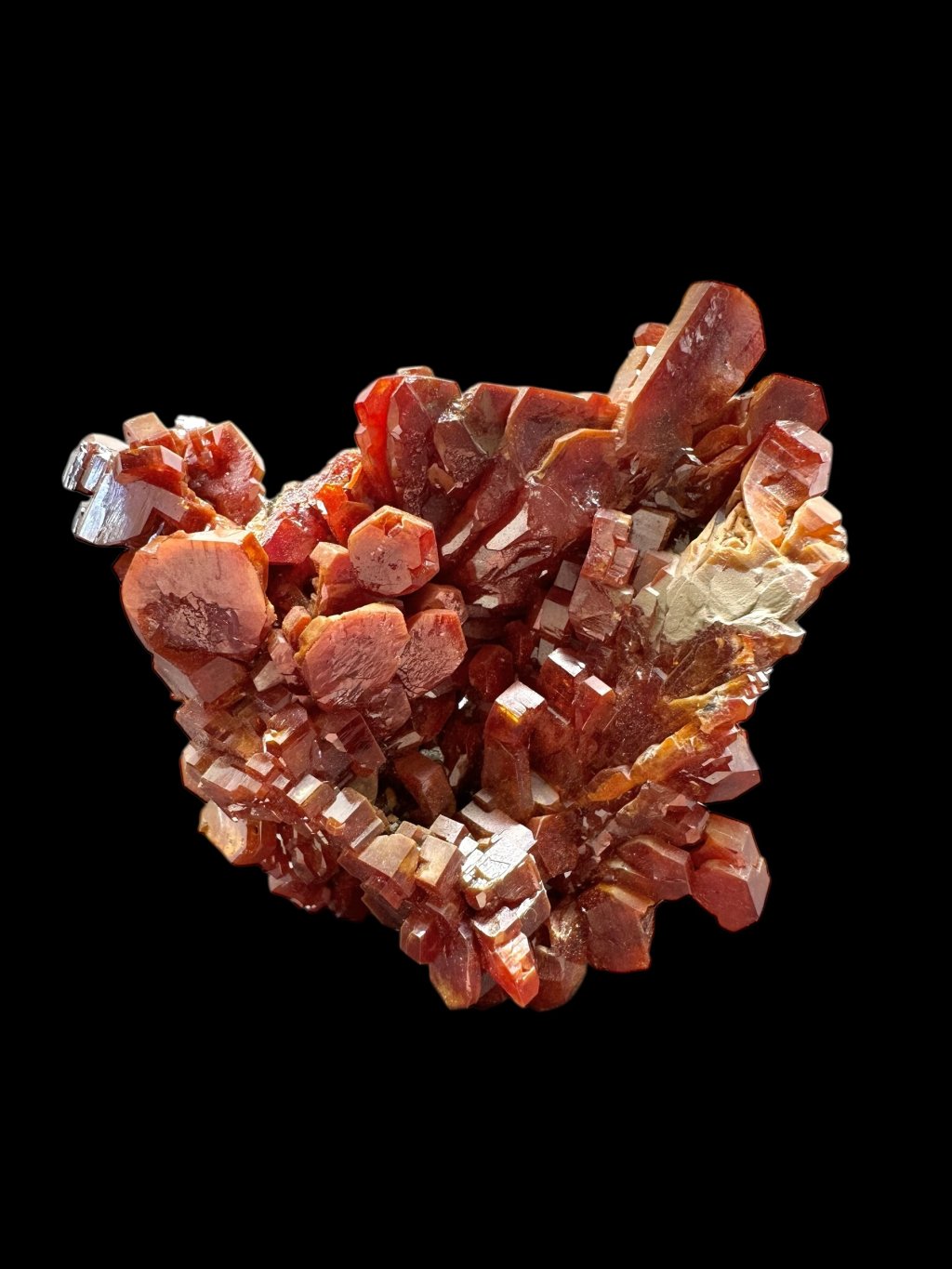Vanadinite has the chemical formula Pb₅(VO₄)₃Cl and its principal constituents are lead, vanadium and chlorine. It also contains minor amounts of phosphorus and arsenic, which may partially replace vanadium in its structure. It typically occurs in shades of red, orange, brown and sometimes yellow. The colour depends on the vanadium and trace element content of the mineral. Vanadinite forms hexagonal (hexagonal) crystals that are often perfectly developed. It can also form stellate, granular or massive aggregates. Vanadinite crystals have a high glassy to diamond-like luster, which contributes to their attractive appearance and popularity among mineral collectors.