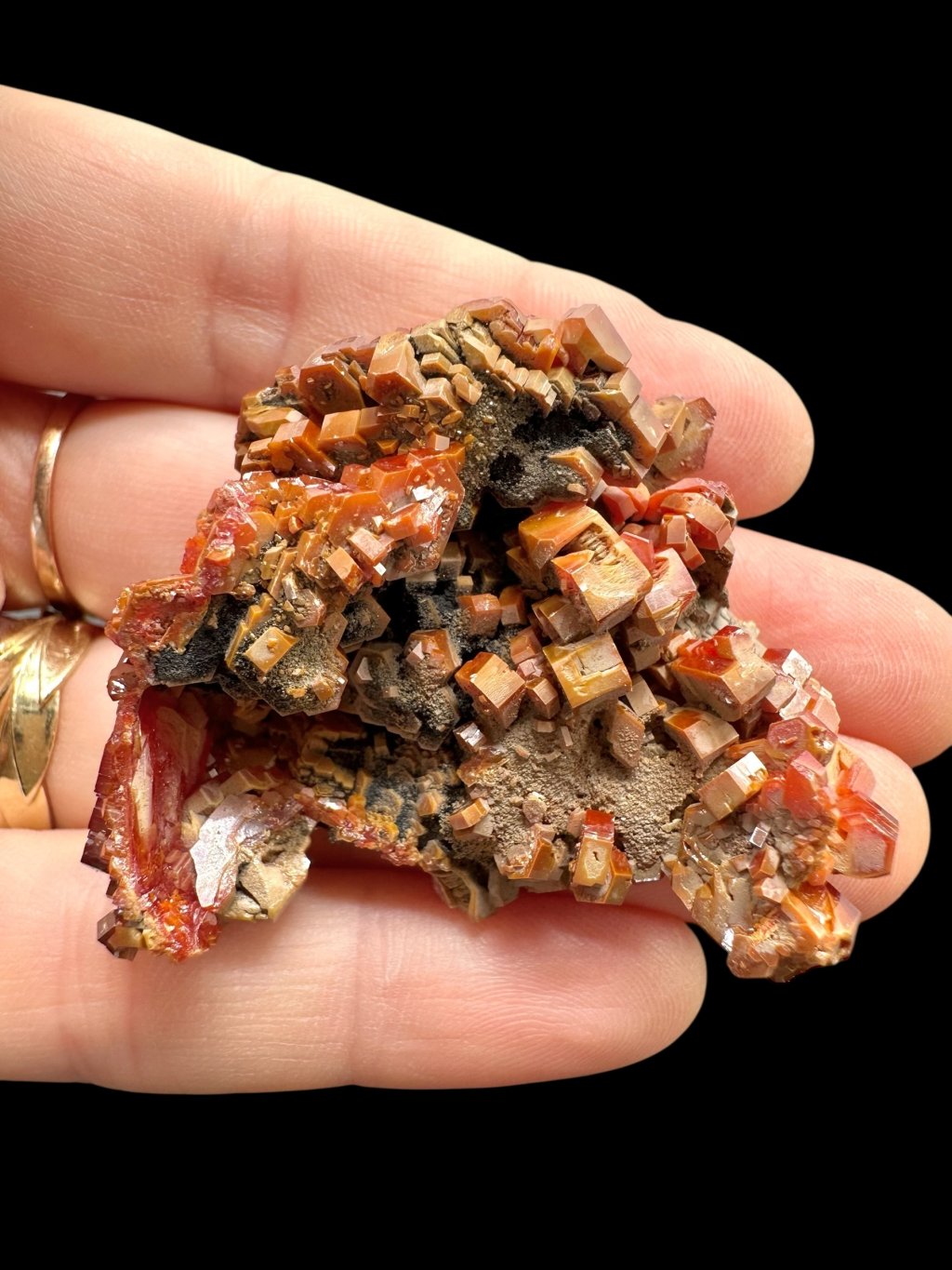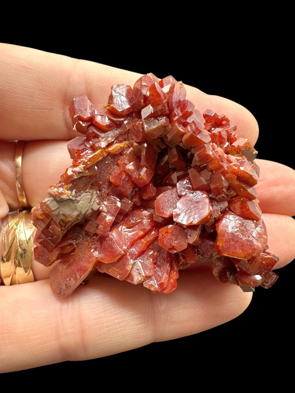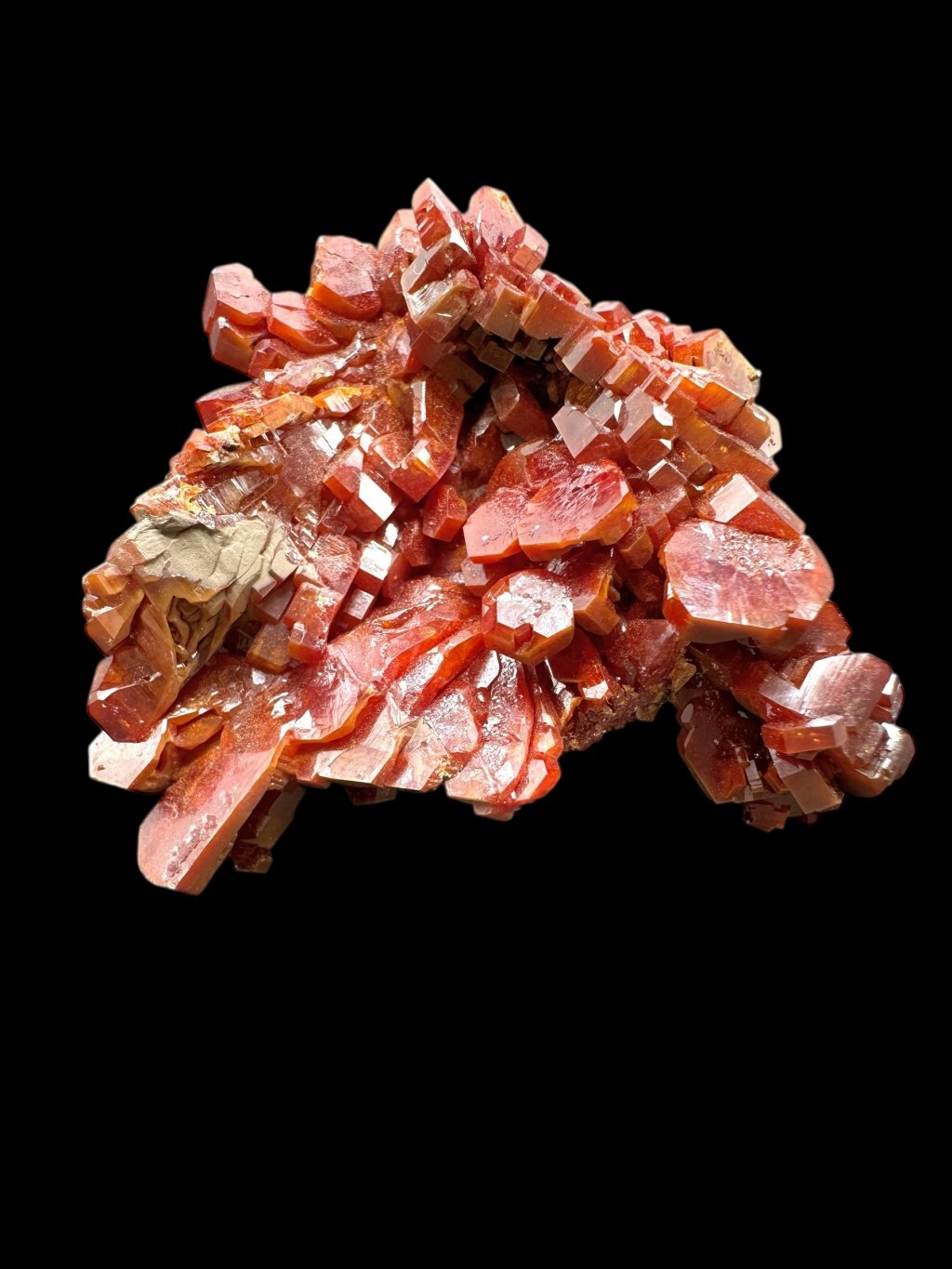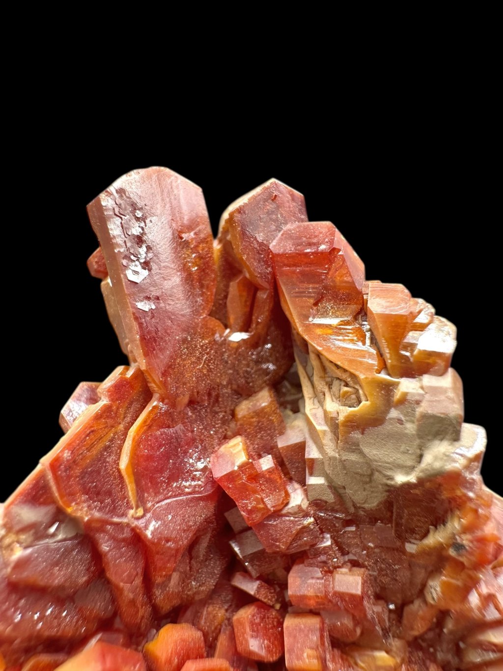 Vanadinite has the chemical formula Pb₅(VO₄)₃Cl and its principal constituents are lead, vanadium and chlorine. It also contains minor amounts of phosphorus and arsenic, which may partially replace vanadium in its structure. It typically occurs in shades of red, orange, brown and sometimes yellow. The colour depends on the vanadium and trace element content of the mineral. Vanadinite forms hexagonal (hexagonal) crystals that are often perfectly developed. It can also form stellate, granular or massive aggregates. Vanadinite crystals have a high glassy to diamond-like luster, which contributes to their attractive appearance and popularity among mineral collectors.