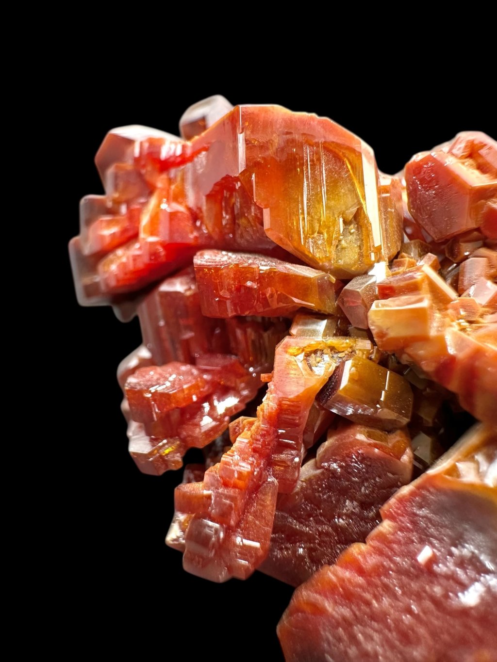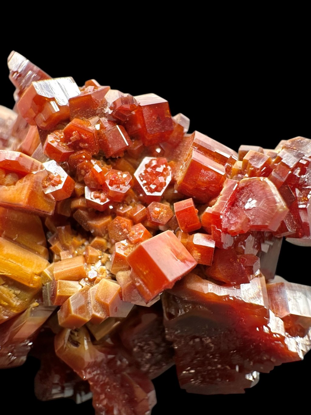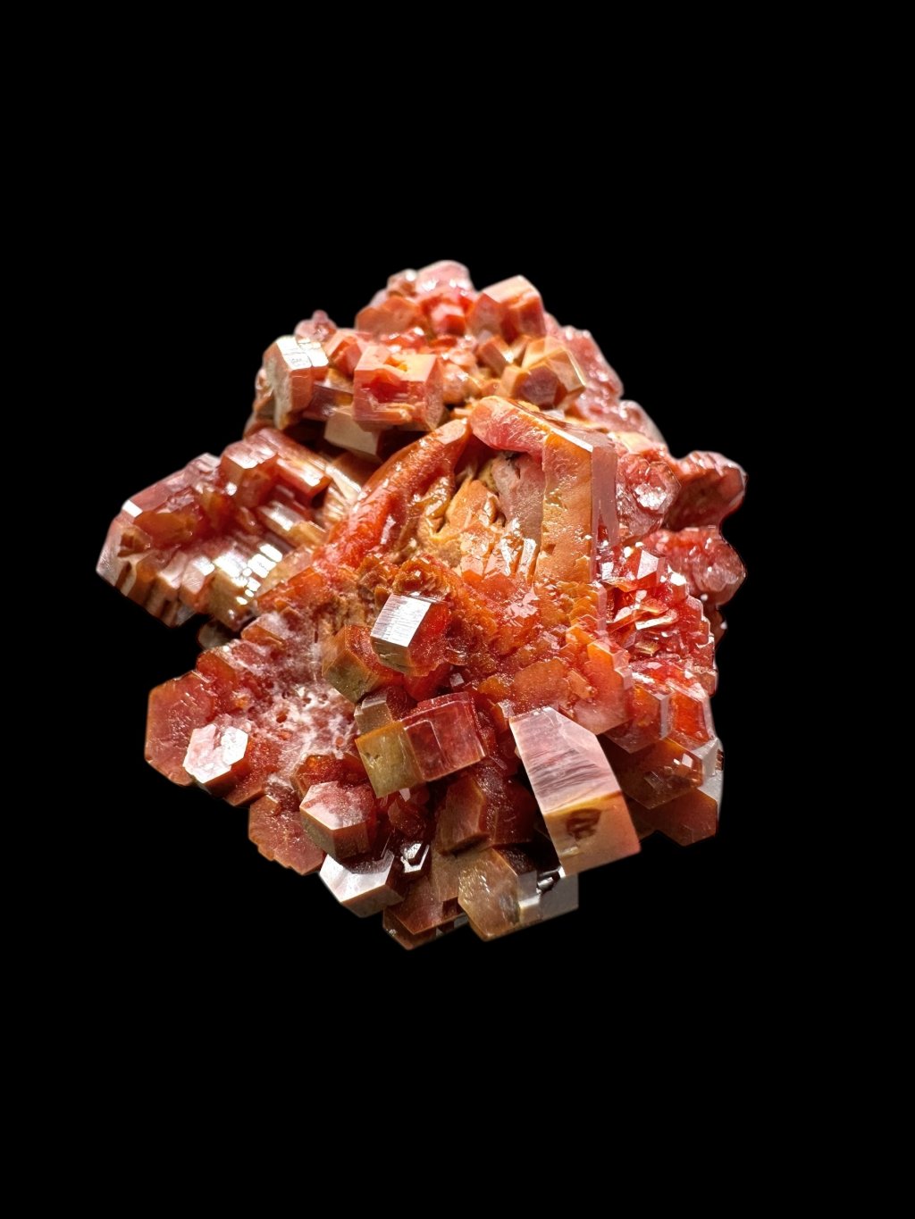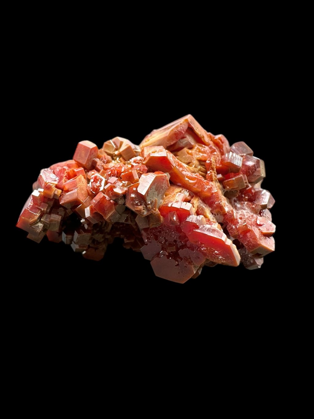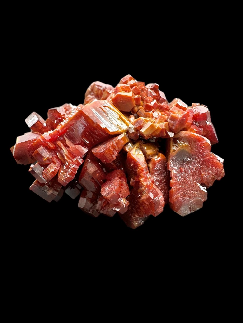 Vanadinite has the chemical formula Pb₅(VO₄)₃Cl and its principal constituents are lead, vanadium and chlorine. It also contains minor amounts of phosphorus and arsenic, which may partially replace vanadium in its structure. It typically occurs in shades of red, orange, brown and sometimes yellow. The colour depends on the vanadium and trace element content of the mineral. Vanadinite forms hexagonal (hexagonal) crystals that are often perfectly developed. It can also form stellate, granular or massive aggregates. Vanadinite crystals have a high glassy to diamond-like luster, which contributes to their attractive appearance and popularity among mineral collectors.