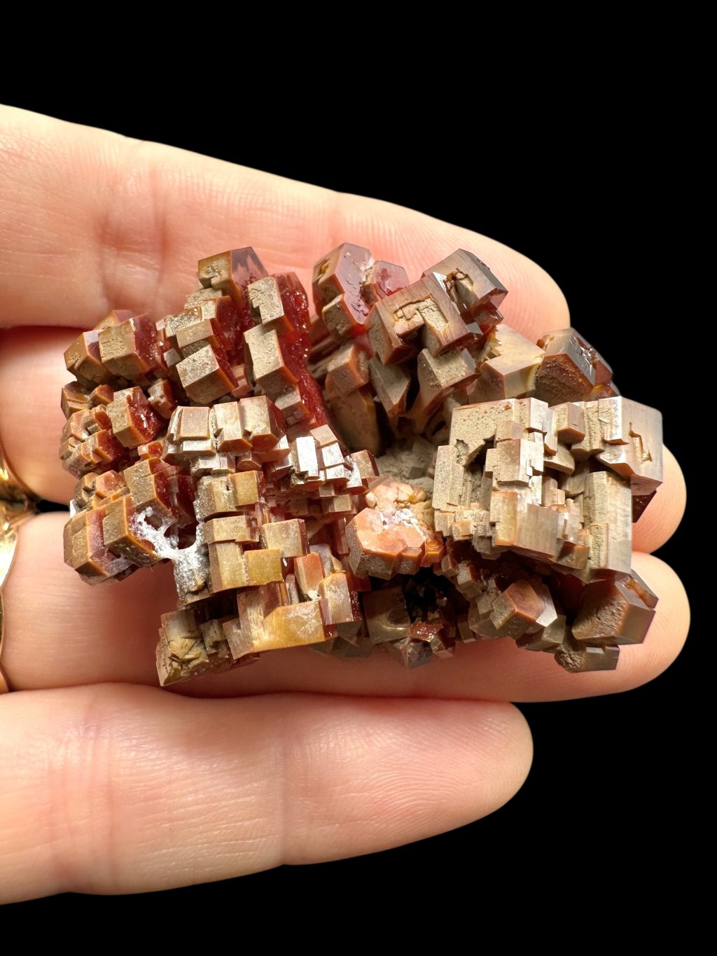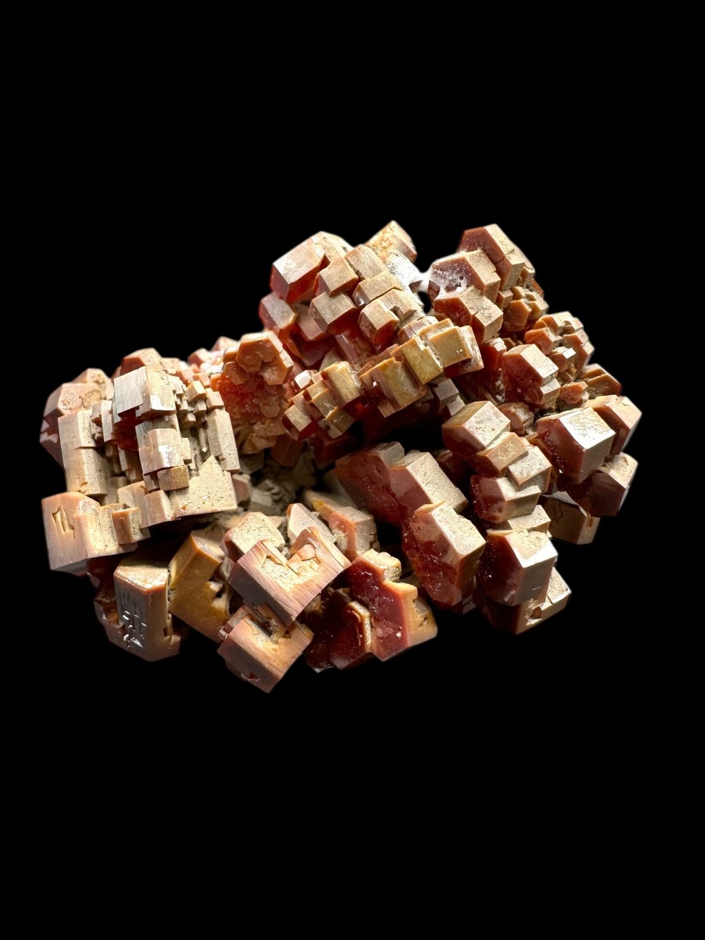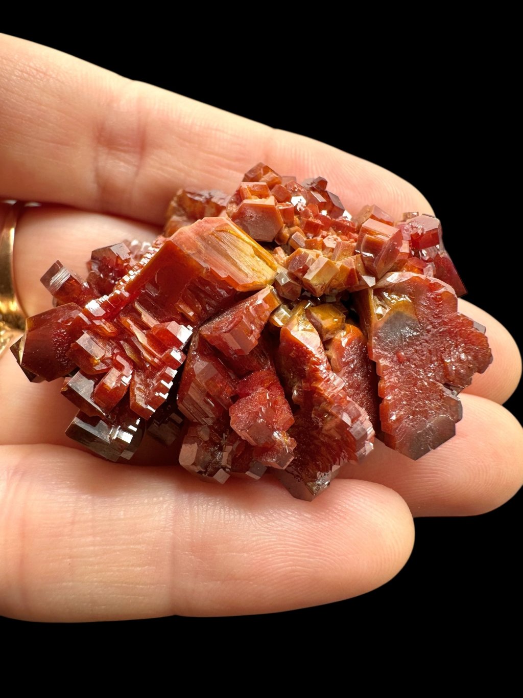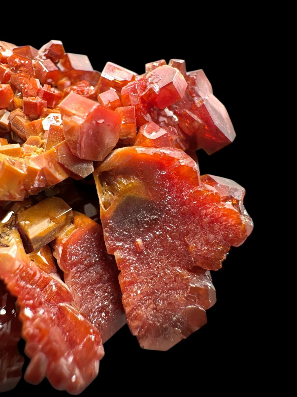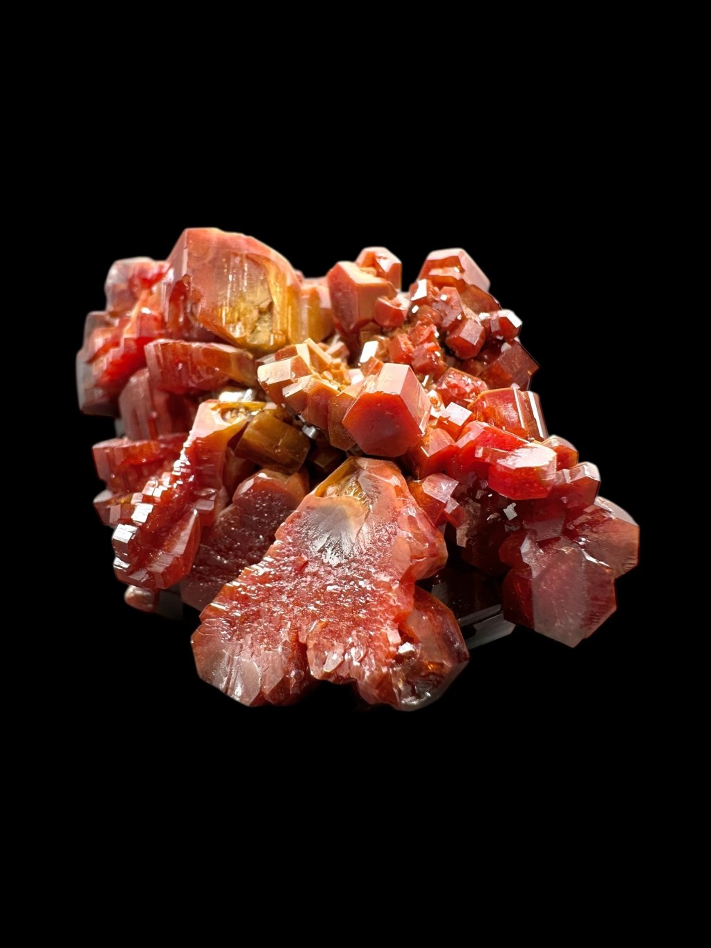 Vanadinite has the chemical formula Pb₅(VO₄)₃Cl and its principal constituents are lead, vanadium and chlorine. It also contains minor amounts of phosphorus and arsenic, which may partially replace vanadium in its structure. It typically occurs in shades of red, orange, brown and sometimes yellow. The colour depends on the vanadium and trace element content of the mineral. Vanadinite forms hexagonal (hexagonal) crystals that are often perfectly developed. It can also form stellate, granular or massive aggregates. Vanadinite crystals have a high glassy to diamond-like luster, which contributes to their attractive appearance and popularity among mineral collectors.