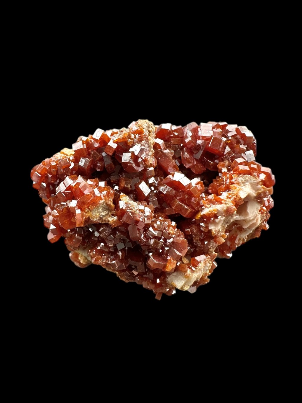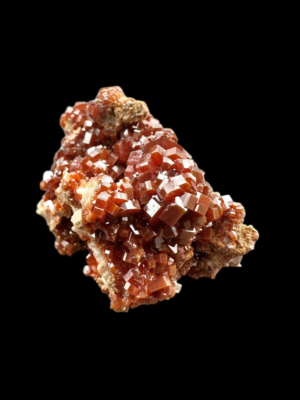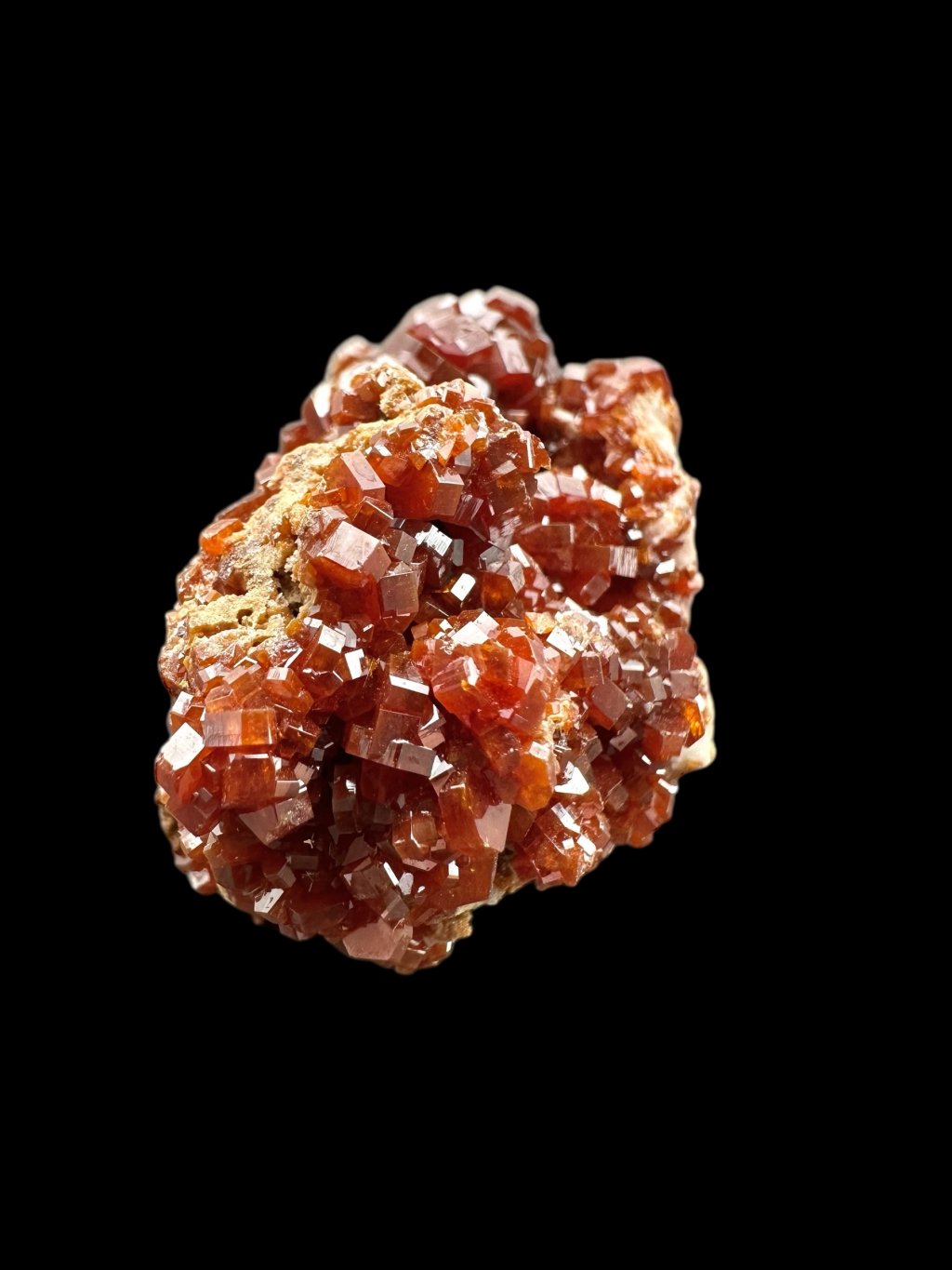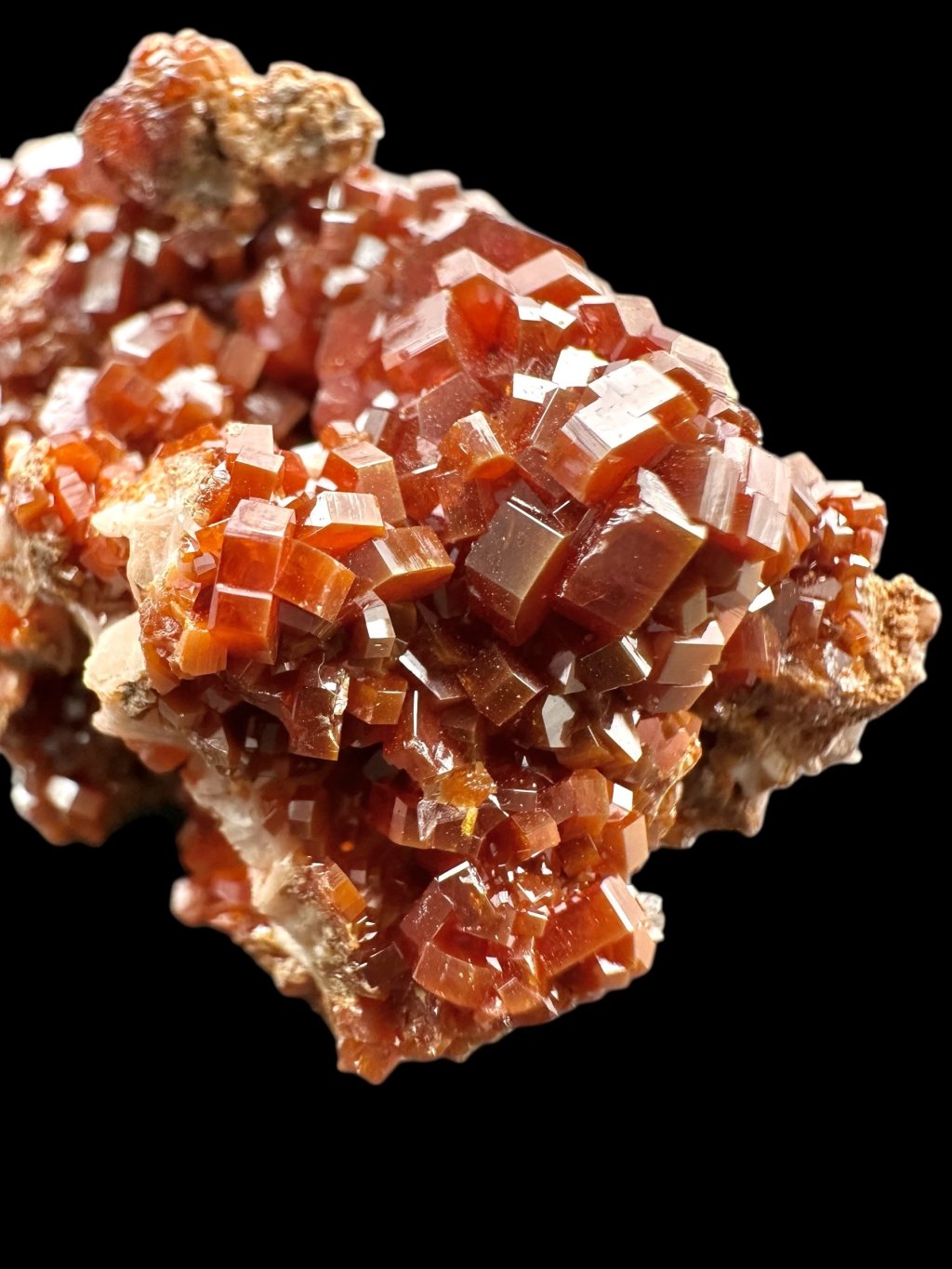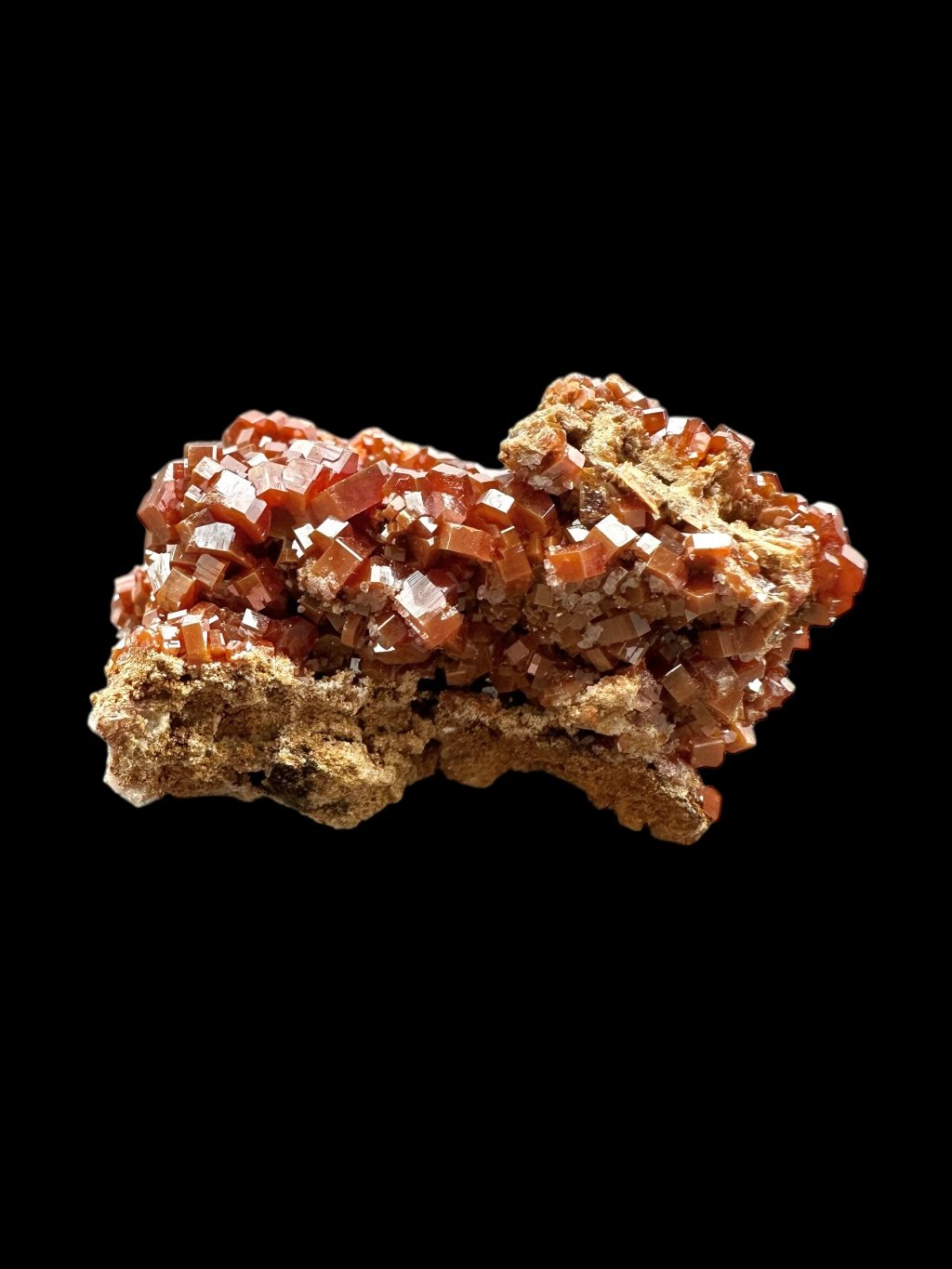 Vanadinite has the chemical formula Pb₅(VO₄)₃Cl and its principal constituents are lead, vanadium and chlorine. It also contains minor amounts of phosphorus and arsenic, which may partially replace vanadium in its structure. It typically occurs in shades of red, orange, brown and sometimes yellow. The colour depends on the vanadium and trace element content of the mineral. Vanadinite forms hexagonal (hexagonal) crystals that are often perfectly developed. It can also form stellate, granular or massive aggregates. Vanadinite crystals have a high glassy to diamond-like luster, which contributes to their attractive appearance and popularity among mineral collectors.