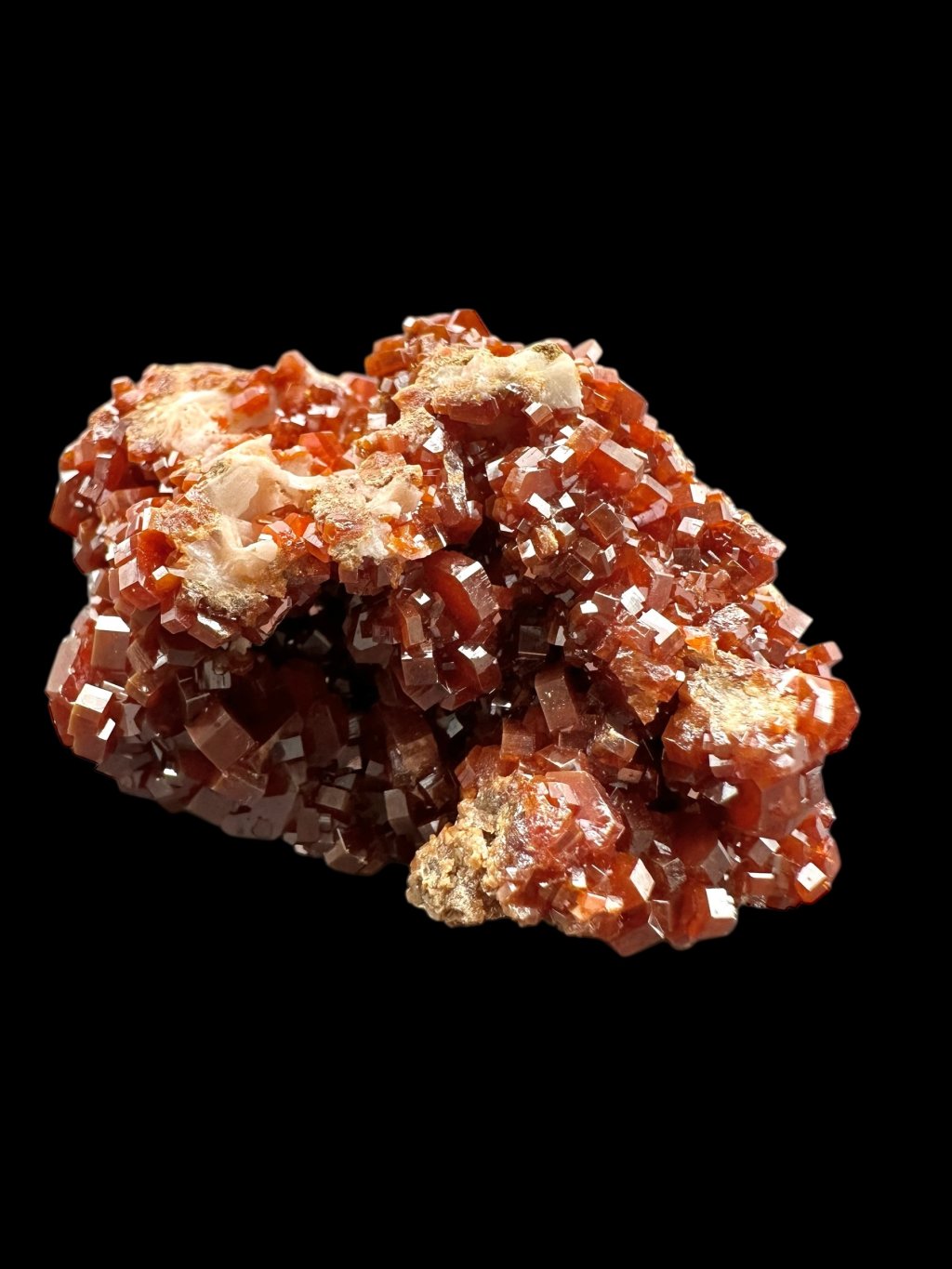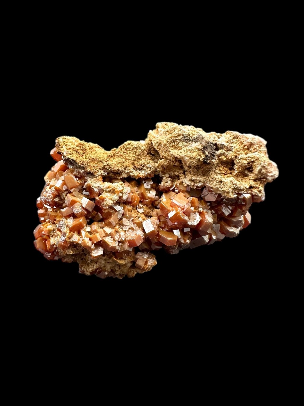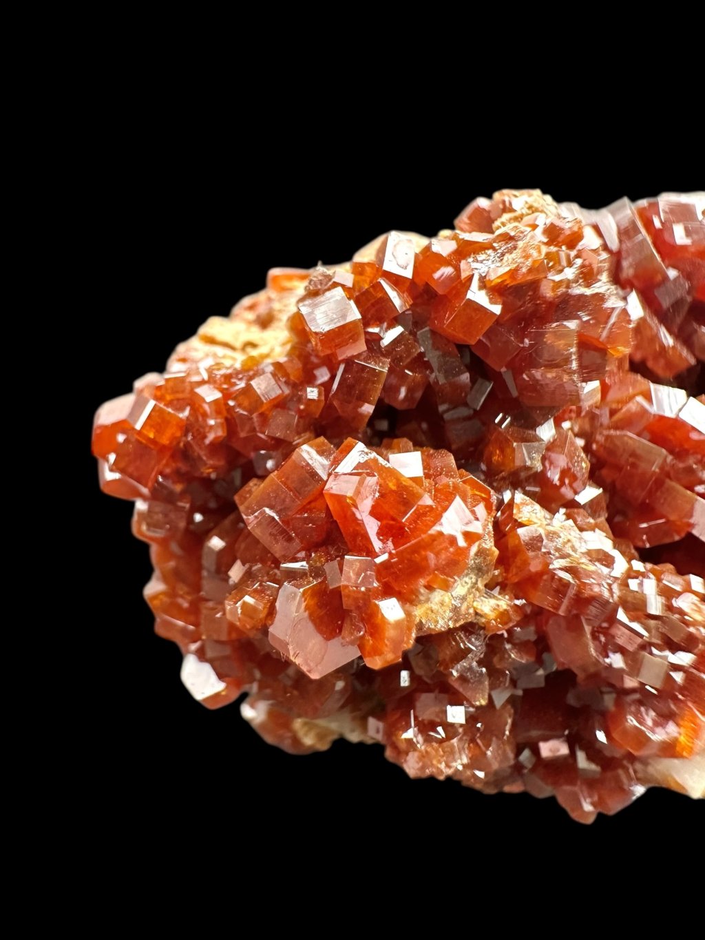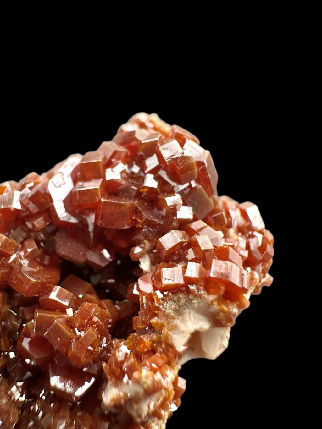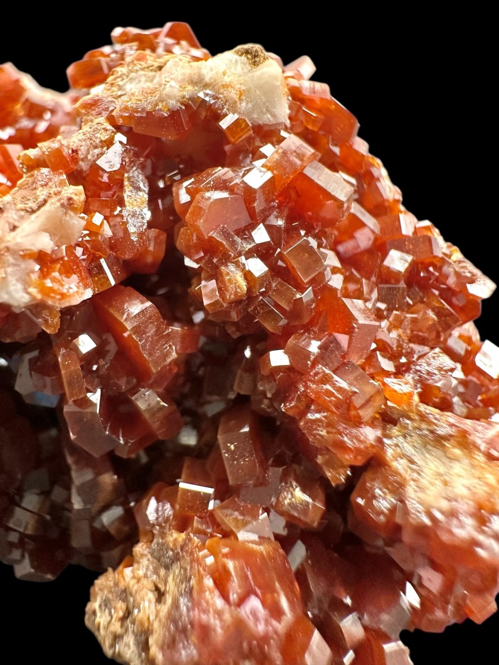 Vanadinite has the chemical formula Pb₅(VO₄)₃Cl and its principal constituents are lead, vanadium and chlorine. It also contains minor amounts of phosphorus and arsenic, which may partially replace vanadium in its structure. It typically occurs in shades of red, orange, brown and sometimes yellow. The colour depends on the vanadium and trace element content of the mineral. Vanadinite forms hexagonal (hexagonal) crystals that are often perfectly developed. It can also form stellate, granular or massive aggregates. Vanadinite crystals have a high glassy to diamond-like luster, which contributes to their attractive appearance and popularity among mineral collectors.