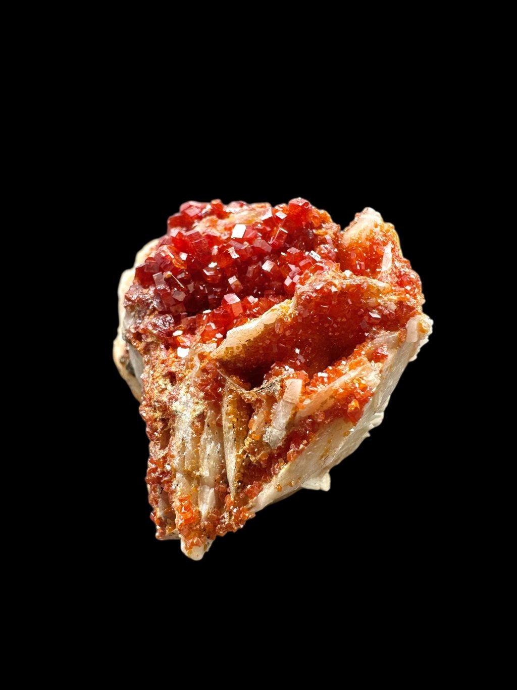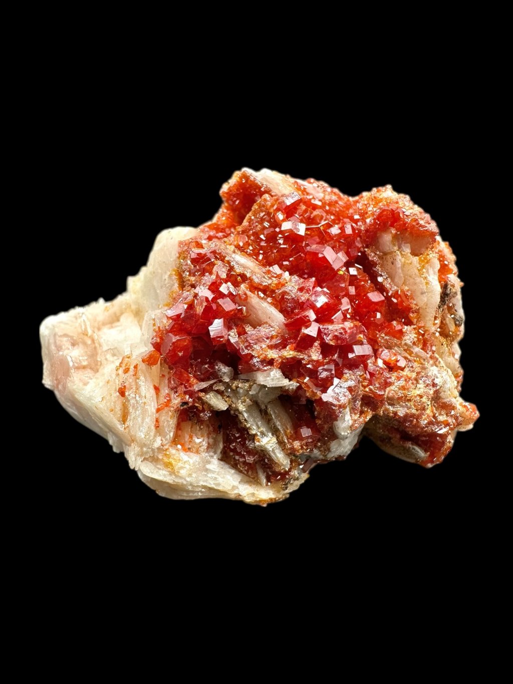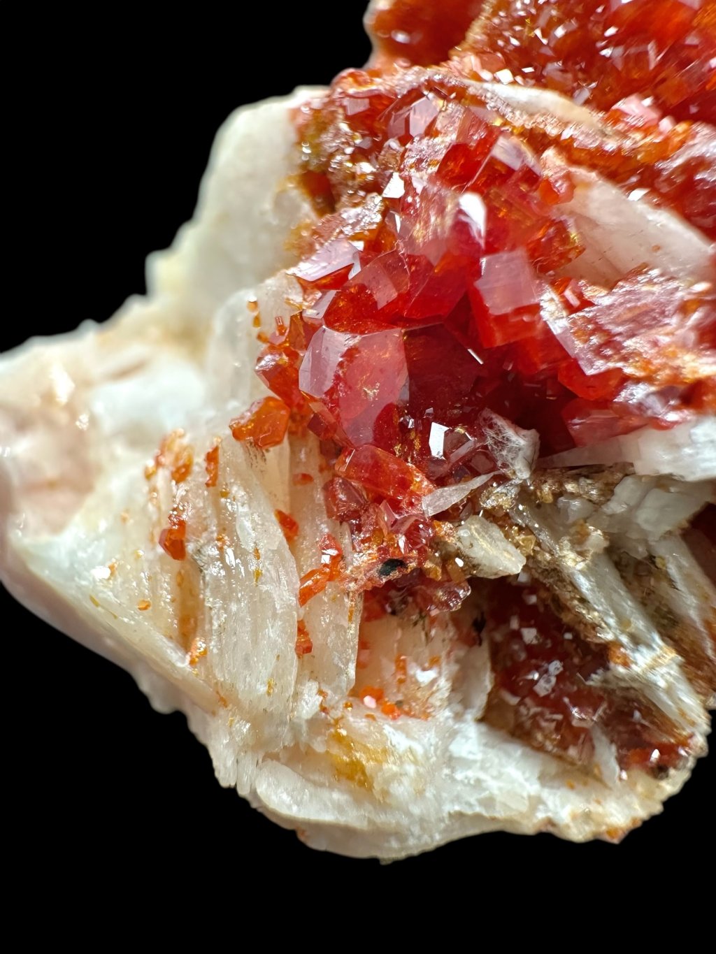 Vanadinite often forms beautiful compositions with barite, creating very aesthetic collectible specimens. In some cases, the barite, which is usually white or yellowish, may be covered with manganese salts. The manganese salts give the barite dark brown to black hues, creating a contrast with the vanadinite crystals. These crystals typically occur in bright red or orange, creating a visually attractive combination of