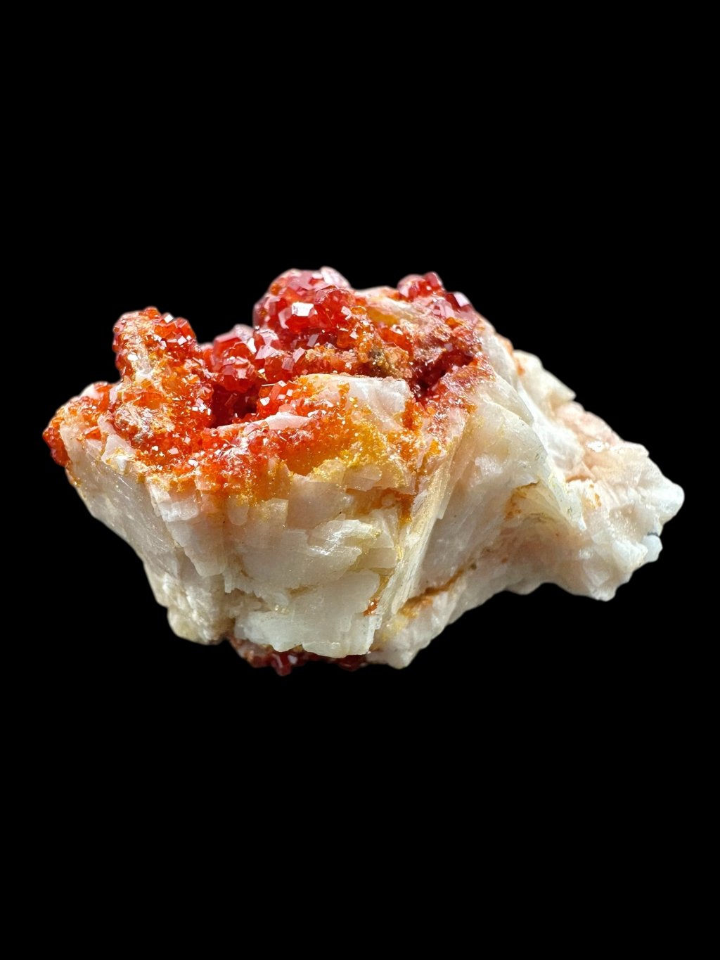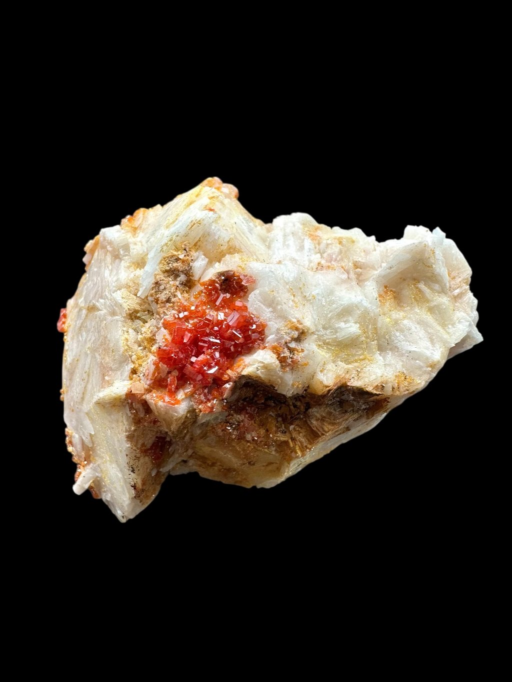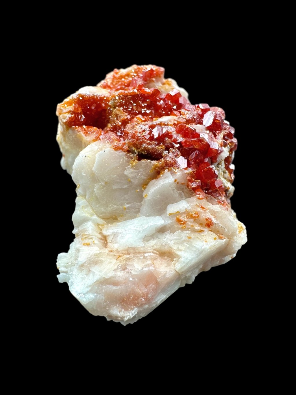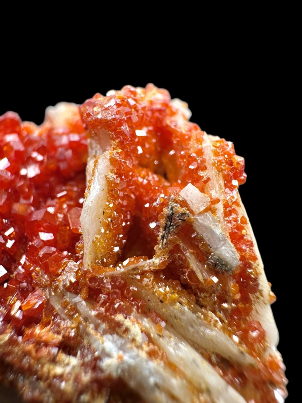 Vanadinite often forms beautiful compositions with barite, creating very aesthetic collectible specimens. In some cases, the barite, which is usually white or yellowish, may be covered with manganese salts. The manganese salts give the barite dark brown to black hues, creating a contrast with the vanadinite crystals. These crystals typically occur in bright red or orange, creating a visually attractive combination of