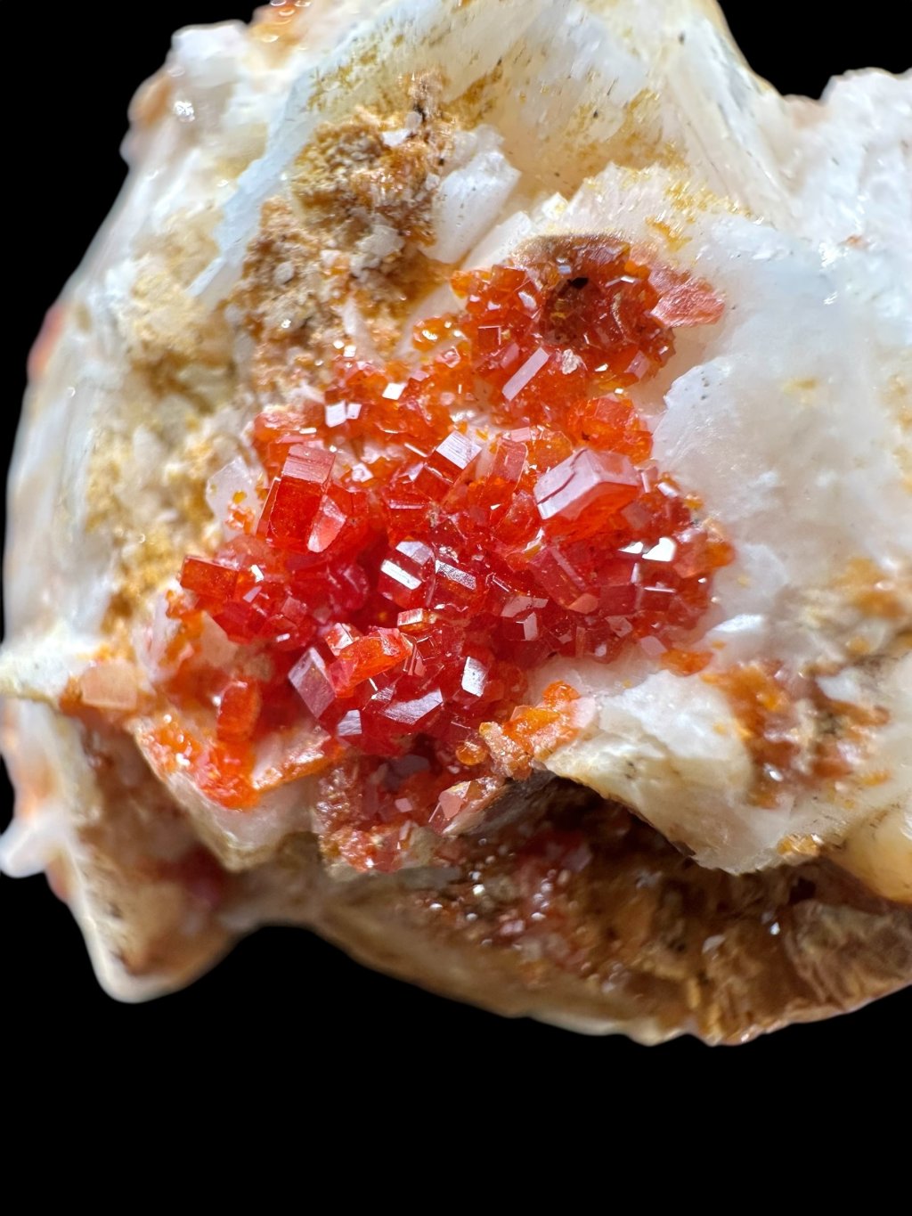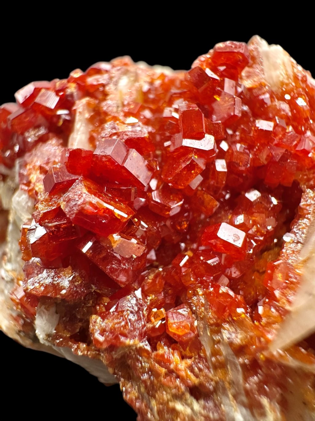 Vanadinite occurs mainly in dry, oxidised lead deposits, especially in Morocco, where some of the finest specimens have been found. Other important localities are Mexico, Argentina, Namibia, and the United States (e.g. Arizona).