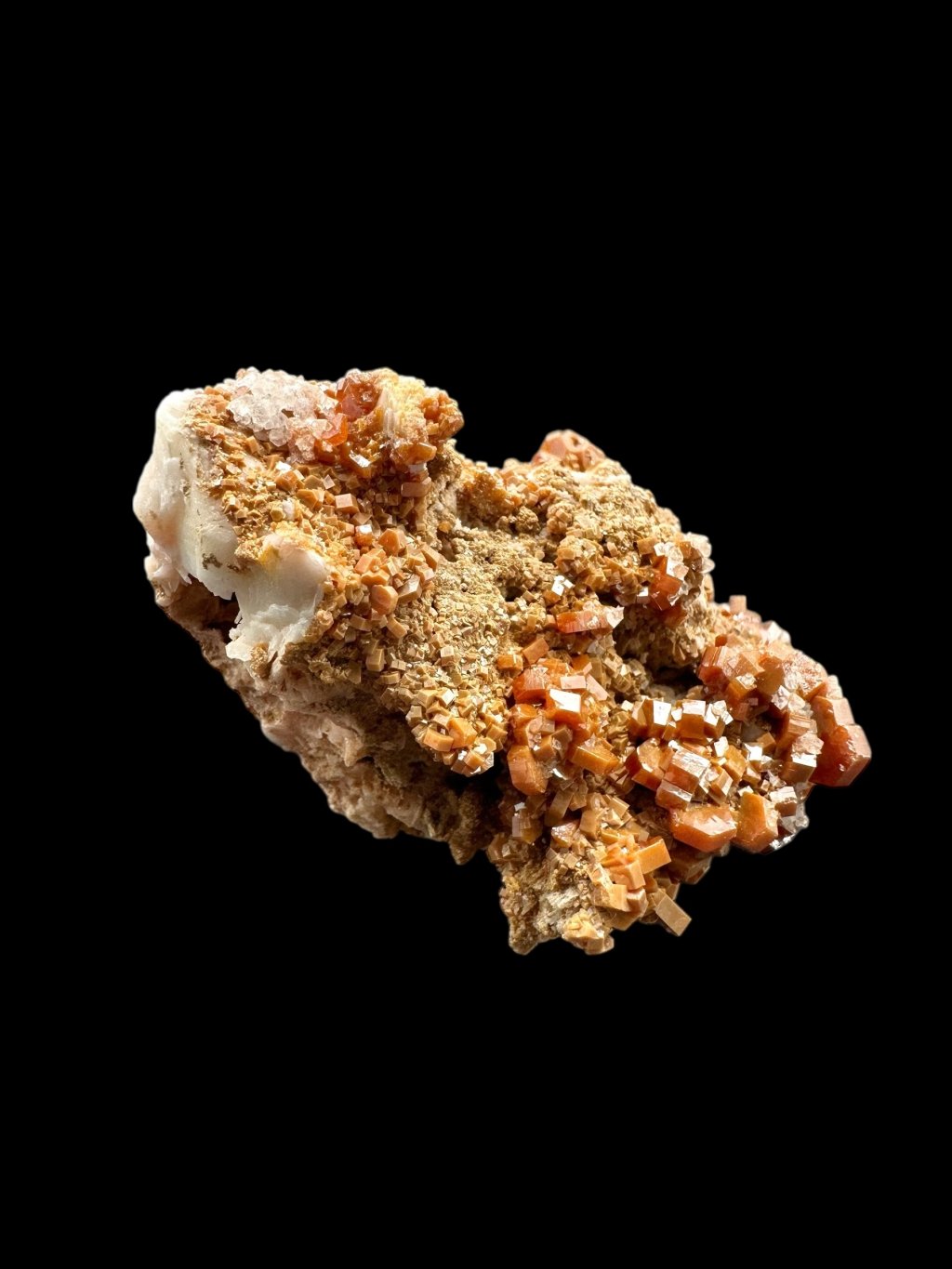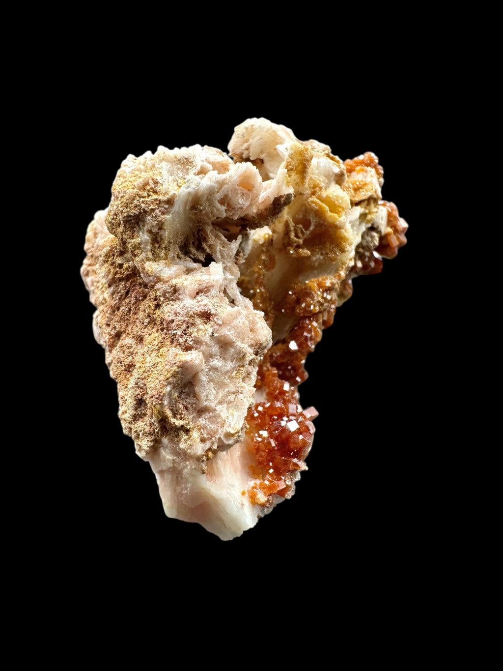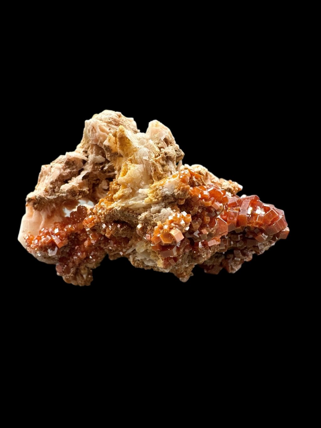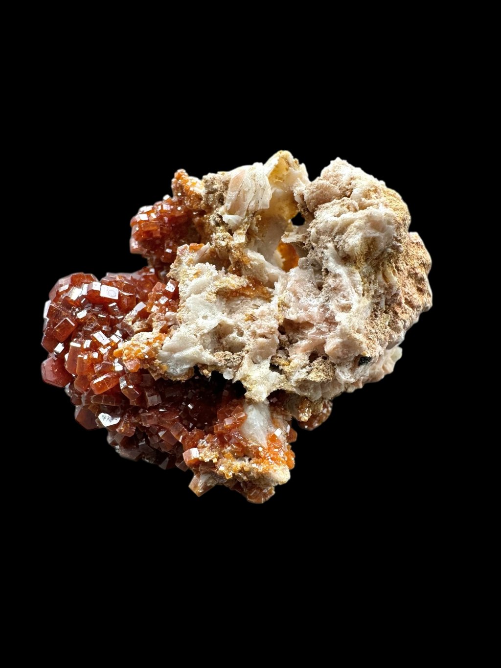 Vanadinite often forms beautiful compositions with barite, creating very aesthetic collectible specimens. In some cases, the barite, which is usually white or yellowish, may be covered with manganese salts. The manganese salts give the barite dark brown to black hues, creating a contrast with the vanadinite crystals. These crystals typically occur in bright red or orange, creating a visually attractive combination of