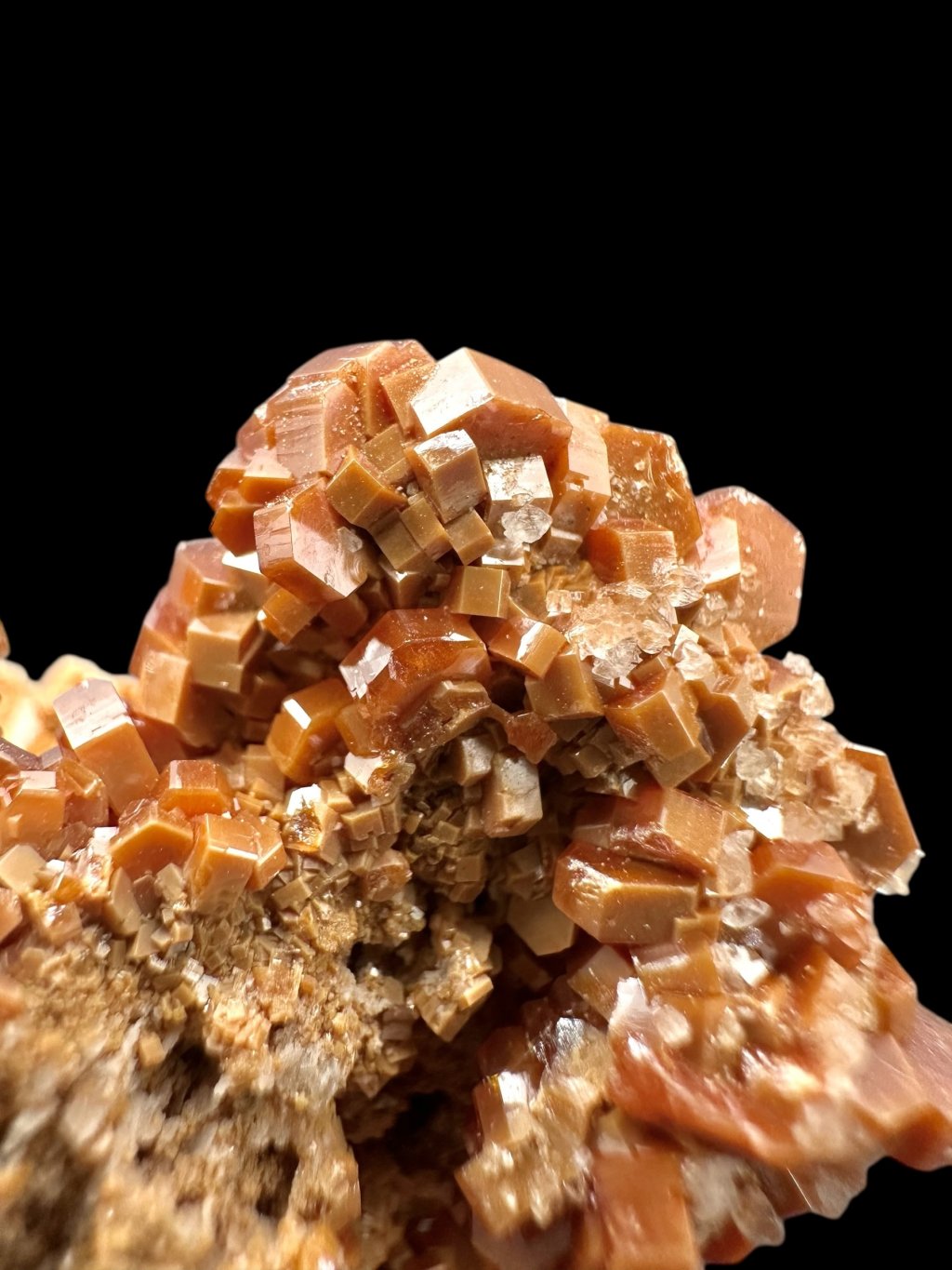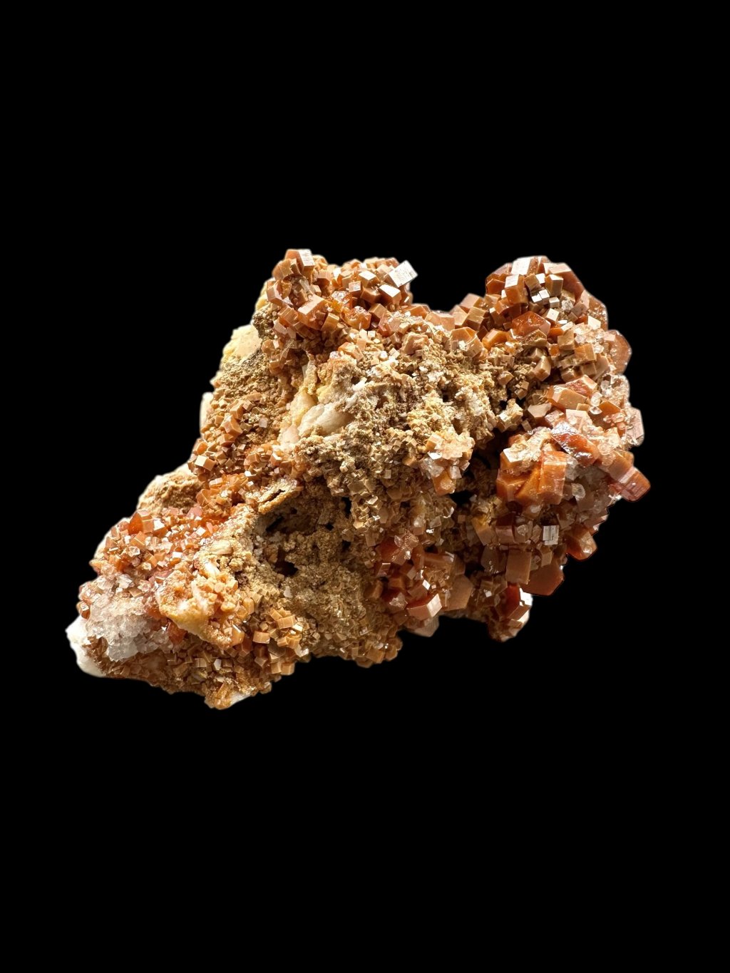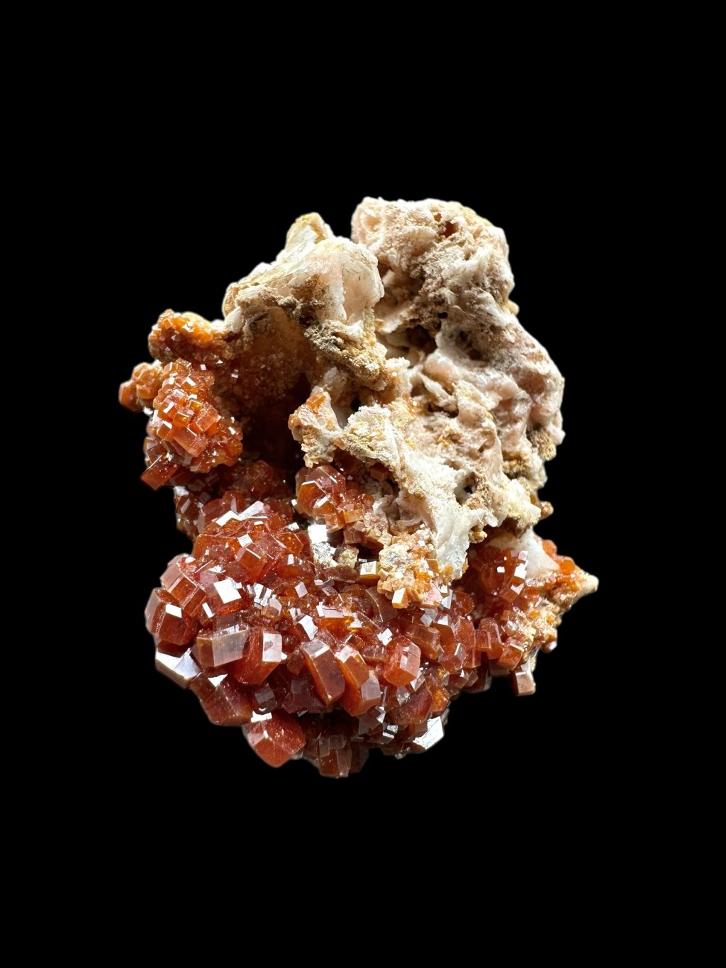 Vanadinite has the chemical formula Pb₅(VO₄)₃Cl and its principal constituents are lead, vanadium and chlorine. It also contains minor amounts of phosphorus and arsenic, which may partially replace vanadium in its structure. It typically occurs in shades of red, orange, brown and sometimes yellow. The colour depends on the vanadium and trace element content of the mineral. Vanadinite forms hexagonal (hexagonal) crystals that are often perfectly developed. It can also form stellate, granular or massive aggregates. Vanadinite crystals have a high glassy to diamond-like luster, which contributes to their attractive appearance and popularity among mineral collectors.