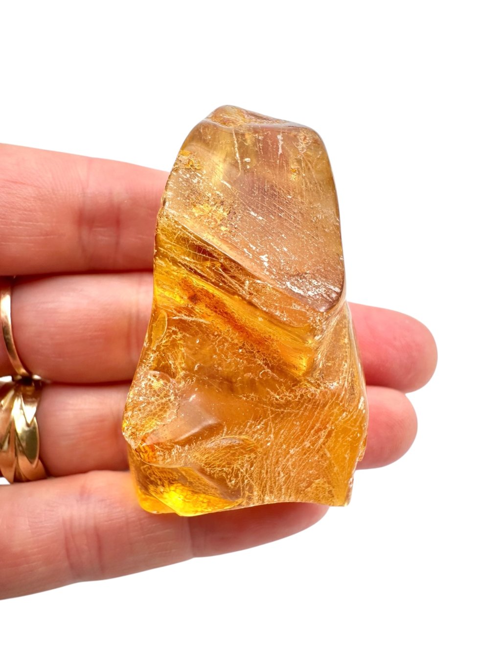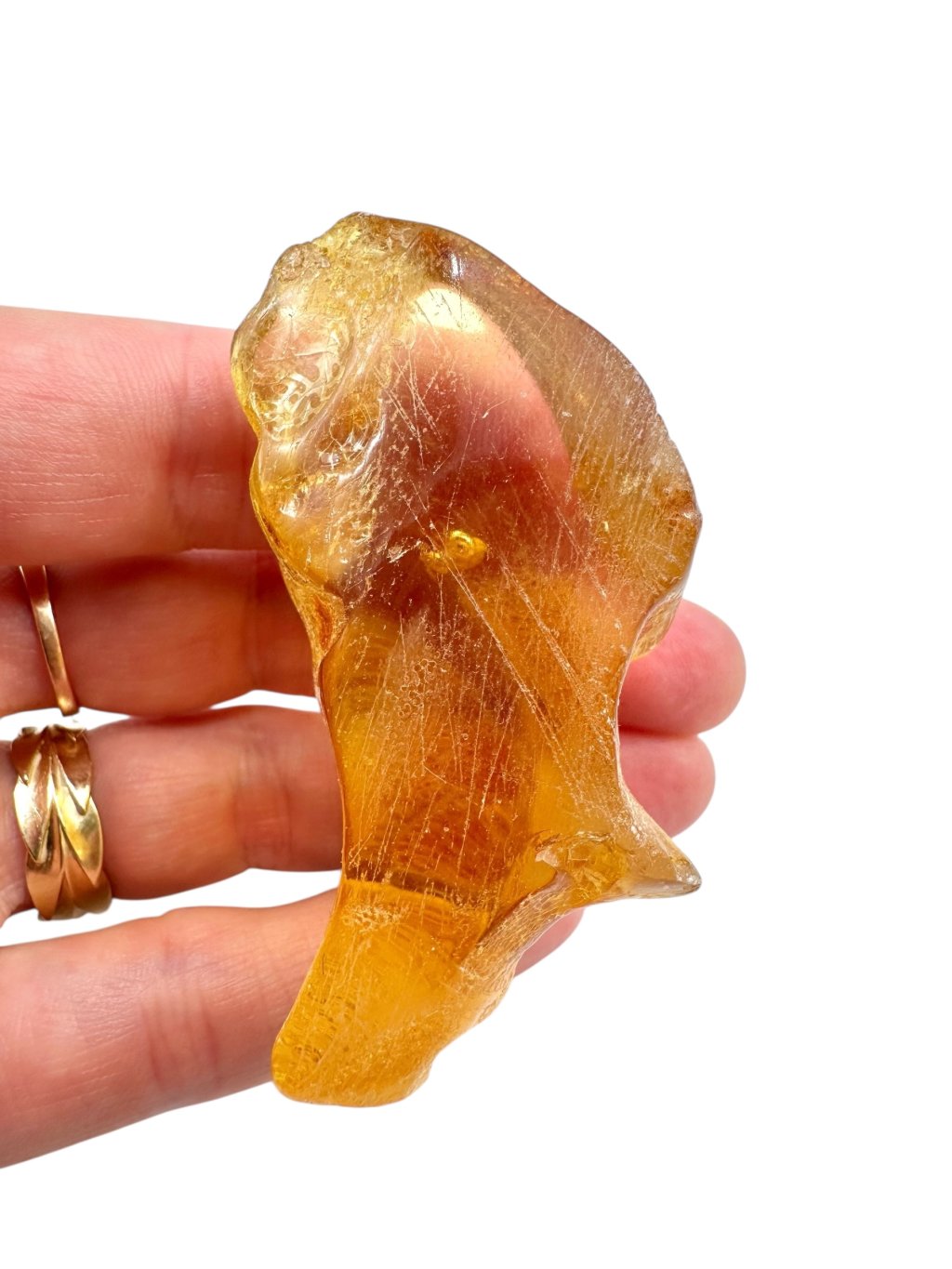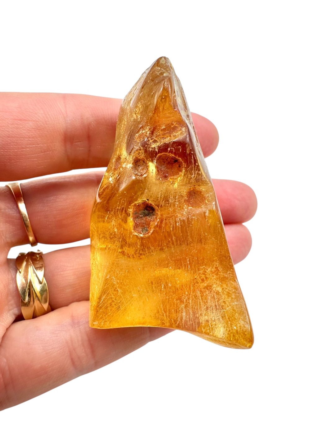 Copal may resemble amber at first glance—it is often clear, golden, and lightweight, and can sometimes contain insect or plant inclusions. However, the key difference lies in its physical and chemical properties: copal is softer, less stable, often slightly sticky, and dissolves in organic solvents (e.g. acetone), whereas true amber remains unaffected.