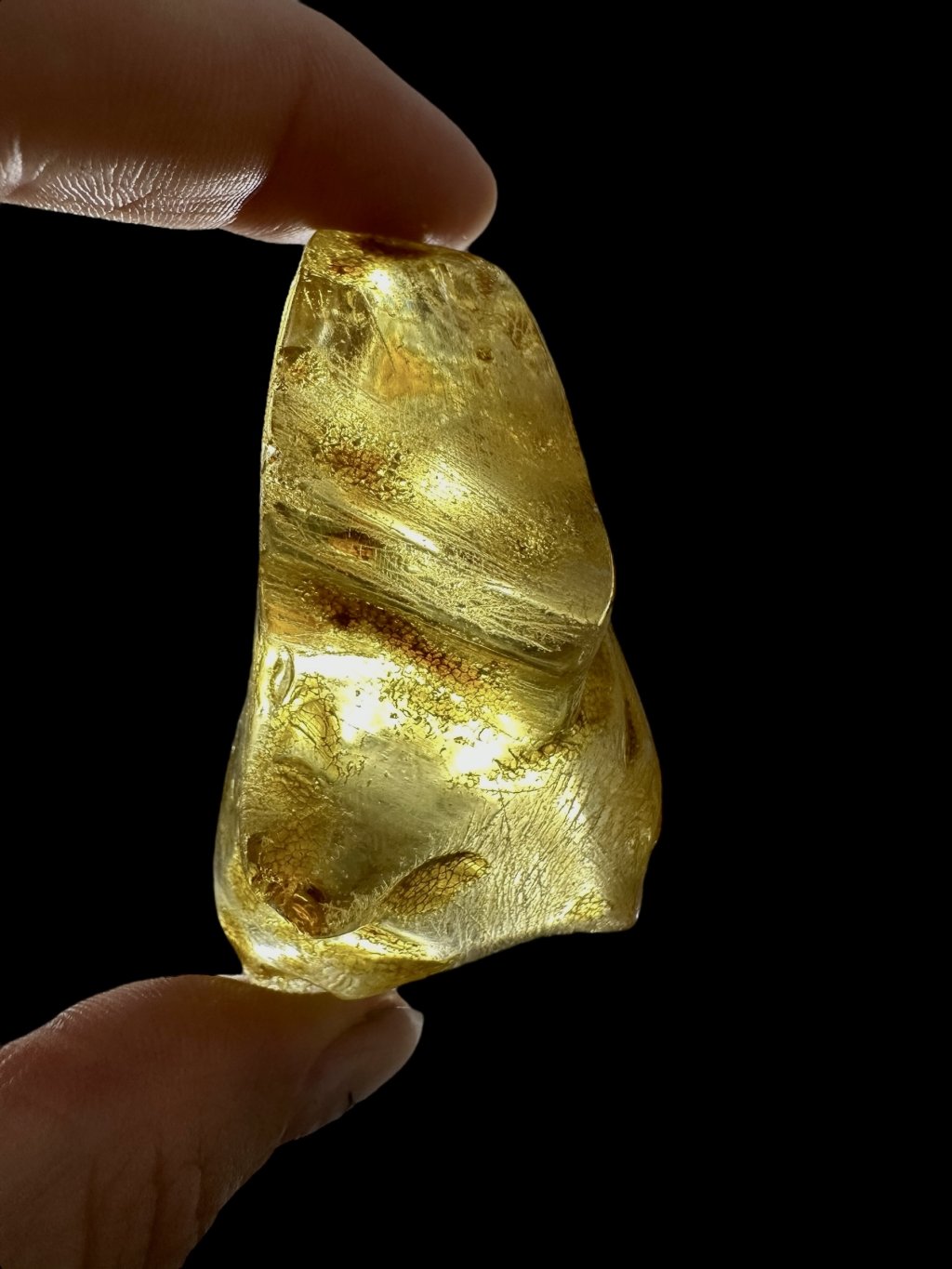 Colombian amber can preserve fossil remains of various prehistoric insects (e.g. ants, termites, mosquitoes, wasps, beetles), arachnids, and plant material such as fibers, leaf fragments, or pollen grains. Rarer inclusions may include tiny pieces of lichens or mosses, providing insight into the rich vegetation and tropical conditions of its time.