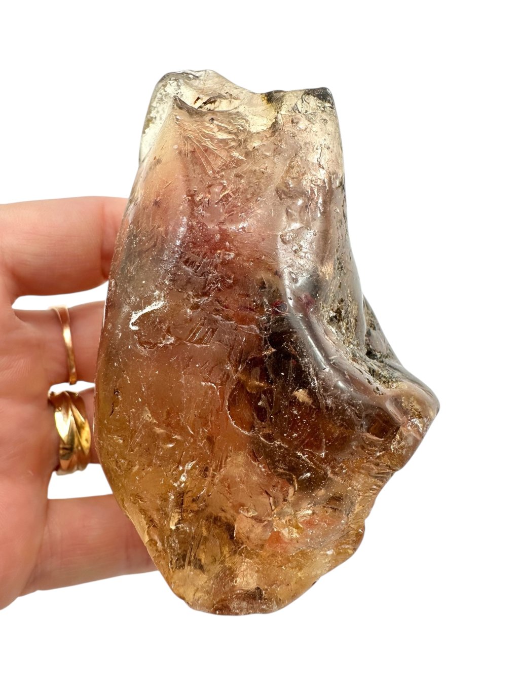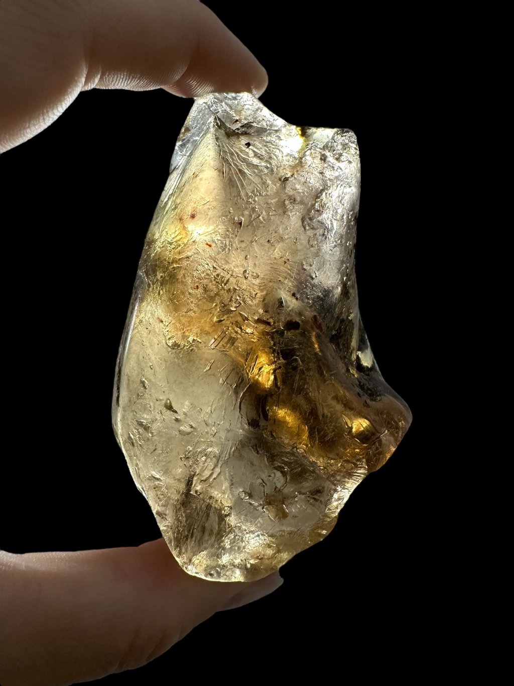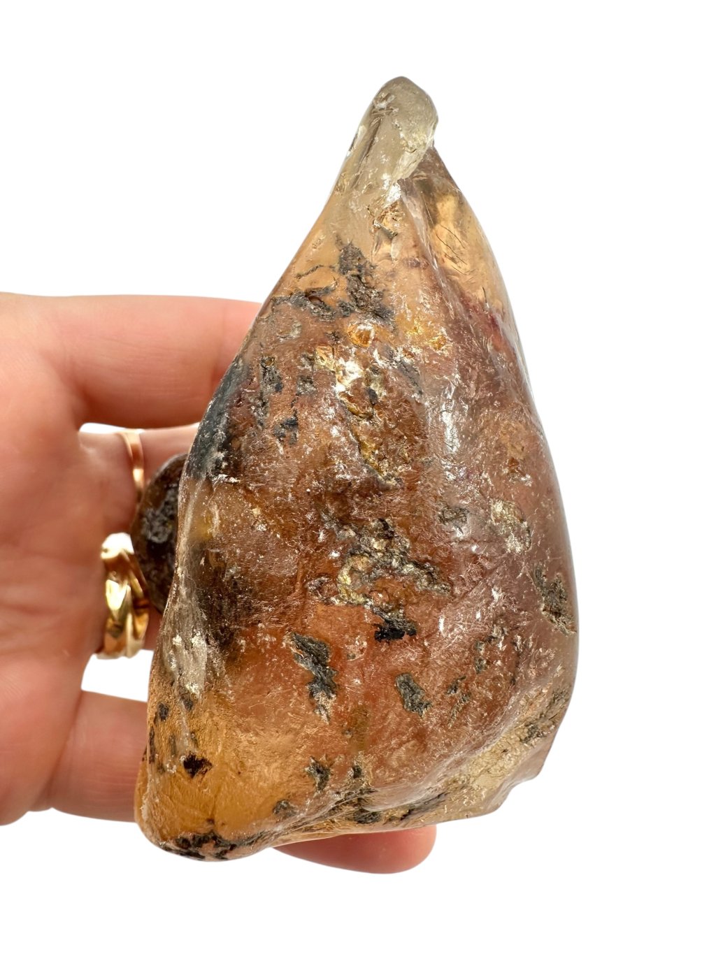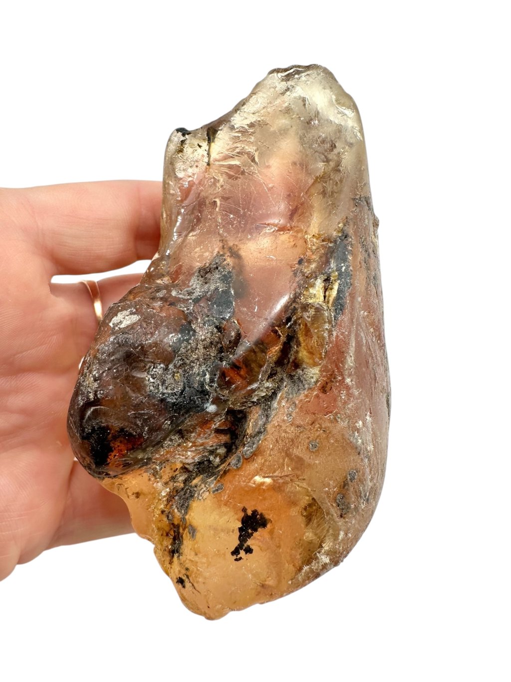 Copal may resemble amber at first glance—it is often clear, golden, and lightweight, and can sometimes contain insect or plant inclusions. However, the key difference lies in its physical and chemical properties: copal is softer, less stable, often slightly sticky, and dissolves in organic solvents (e.g. acetone), whereas true amber remains unaffected.