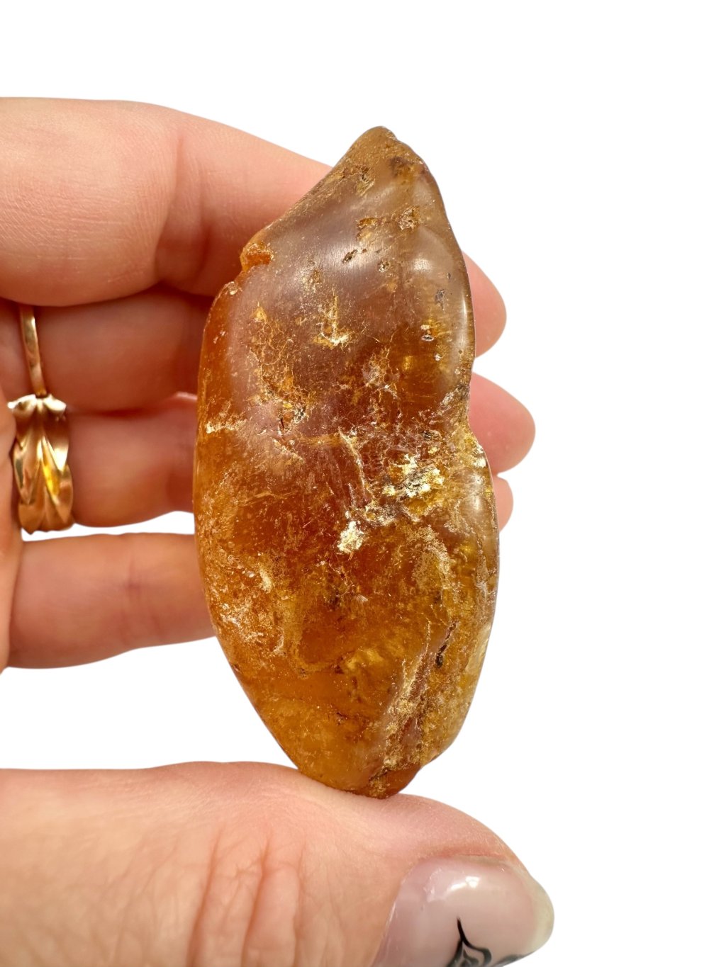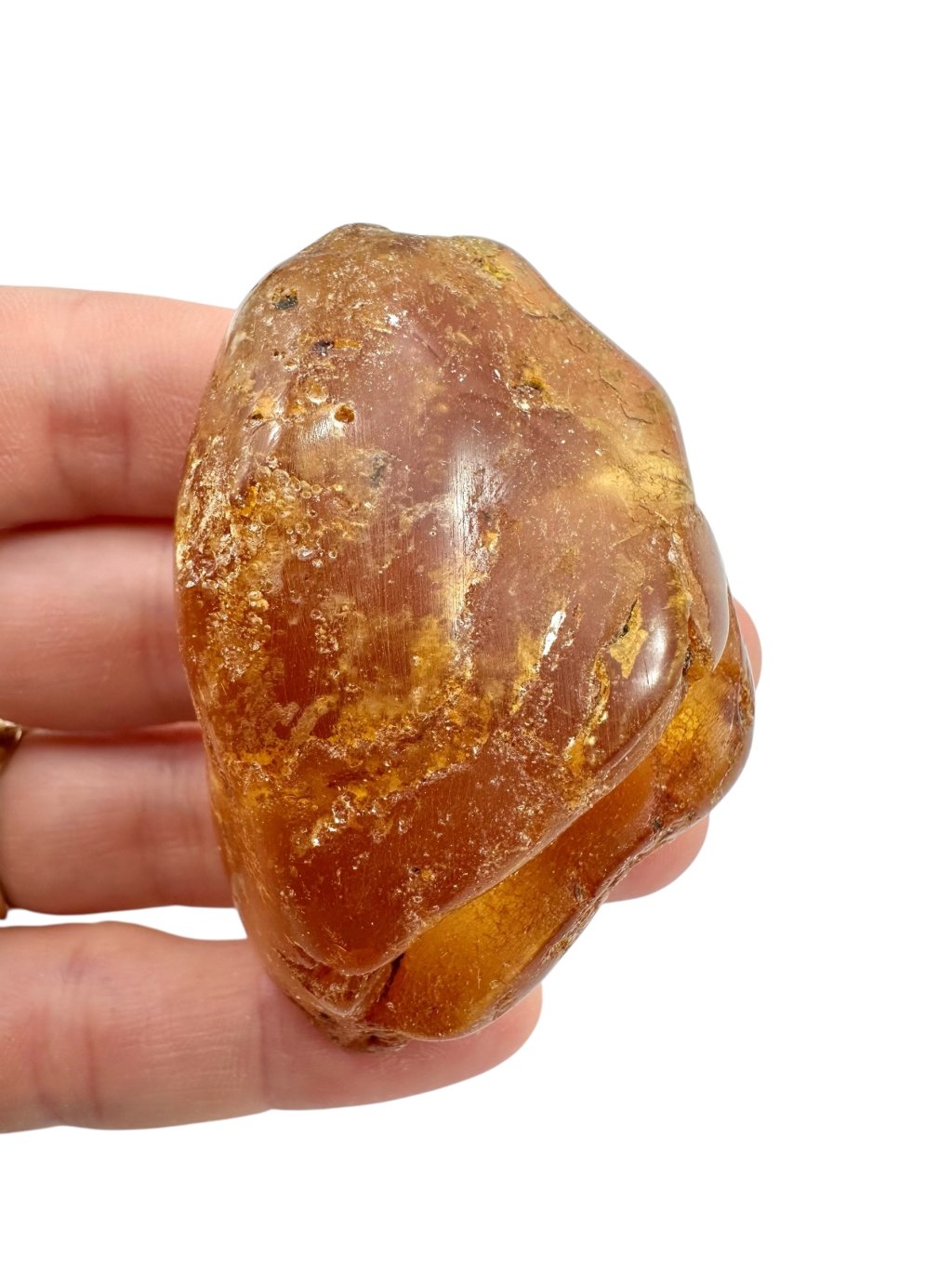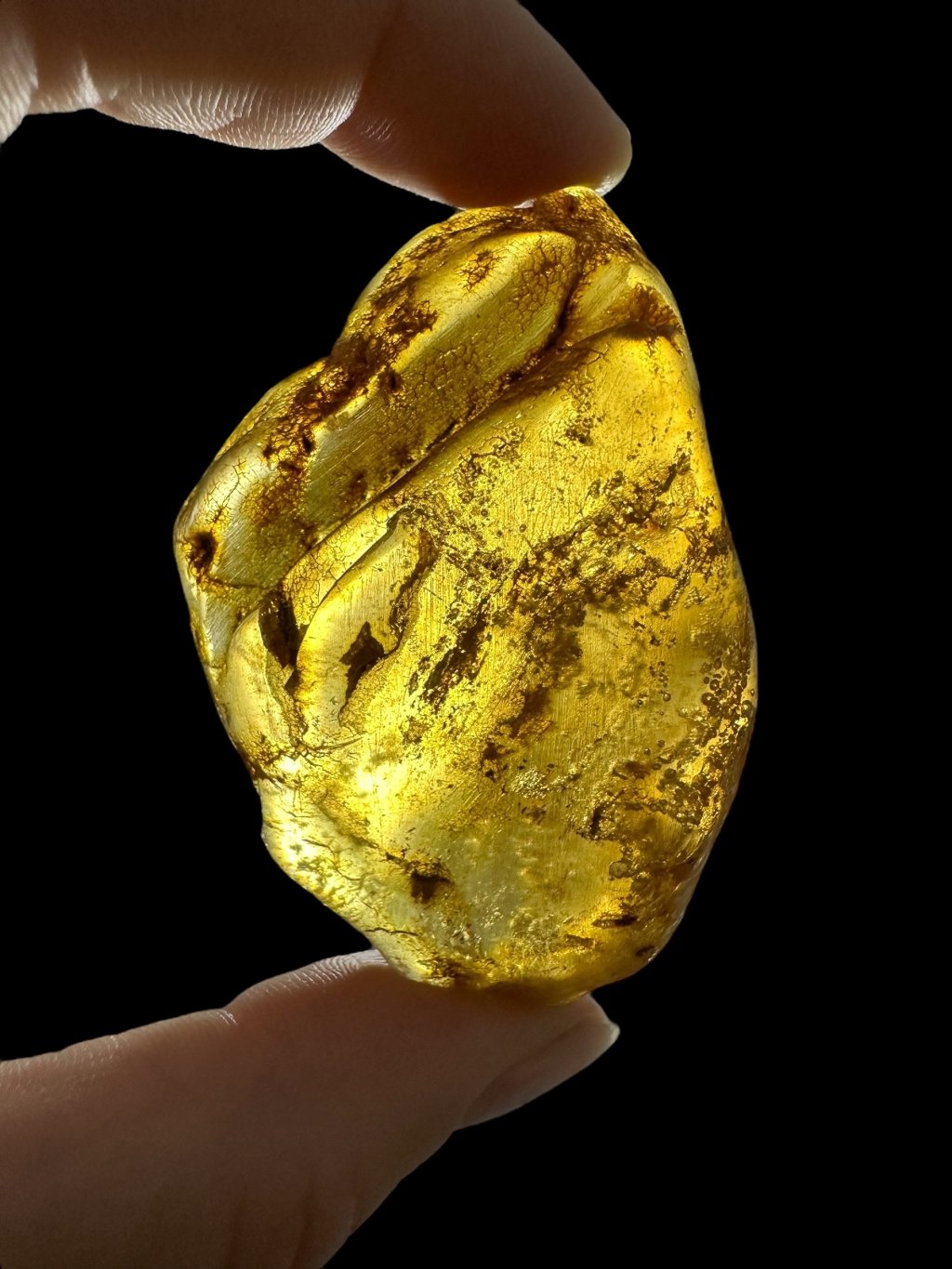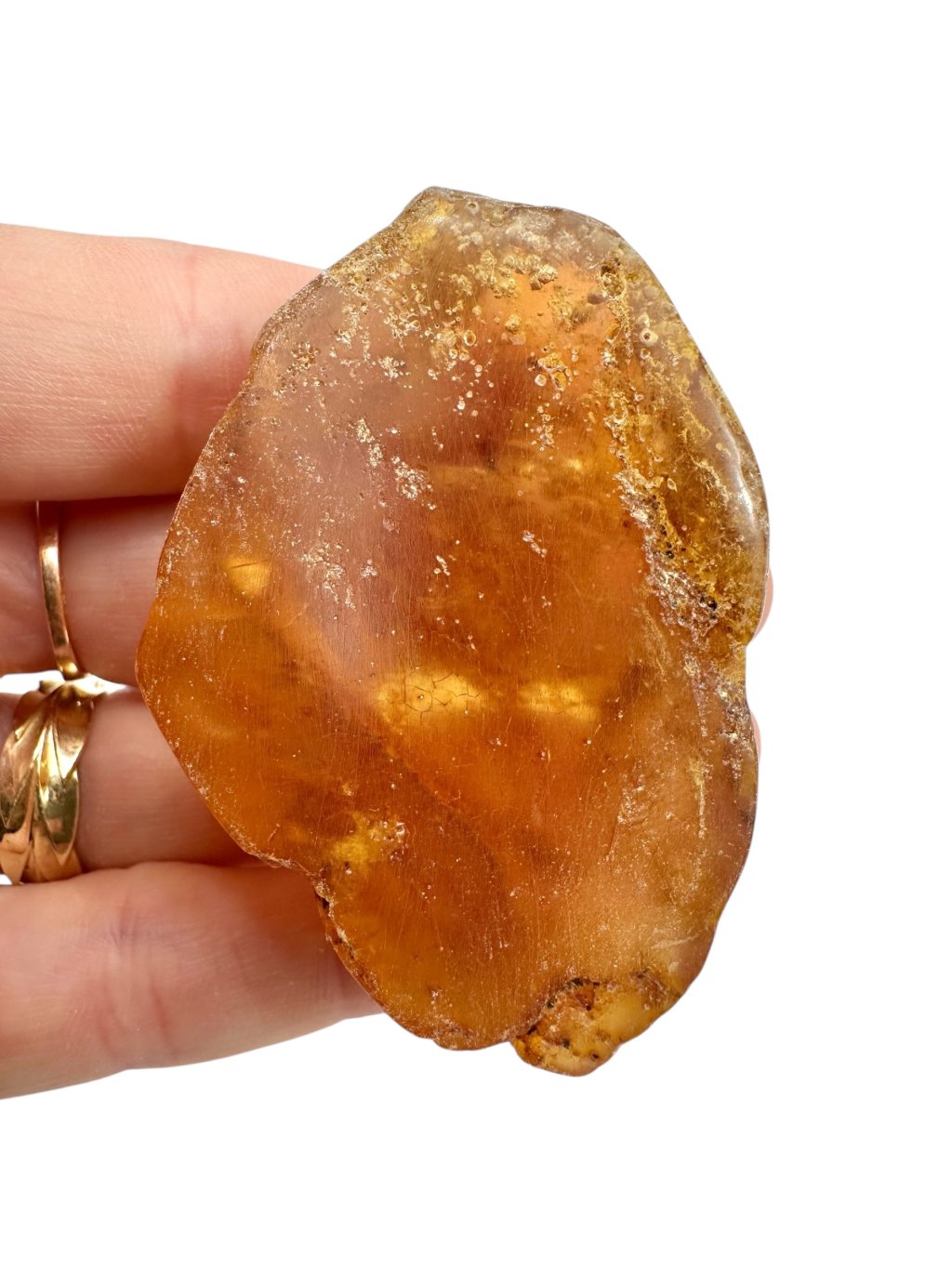 Copal may resemble amber at first glance—it is often clear, golden, and lightweight, and can sometimes contain insect or plant inclusions. However, the key difference lies in its physical and chemical properties: copal is softer, less stable, often slightly sticky, and dissolves in organic solvents (e.g. acetone), whereas true amber remains unaffected.
