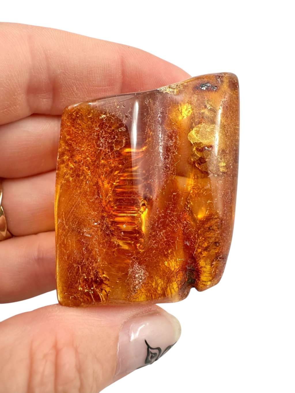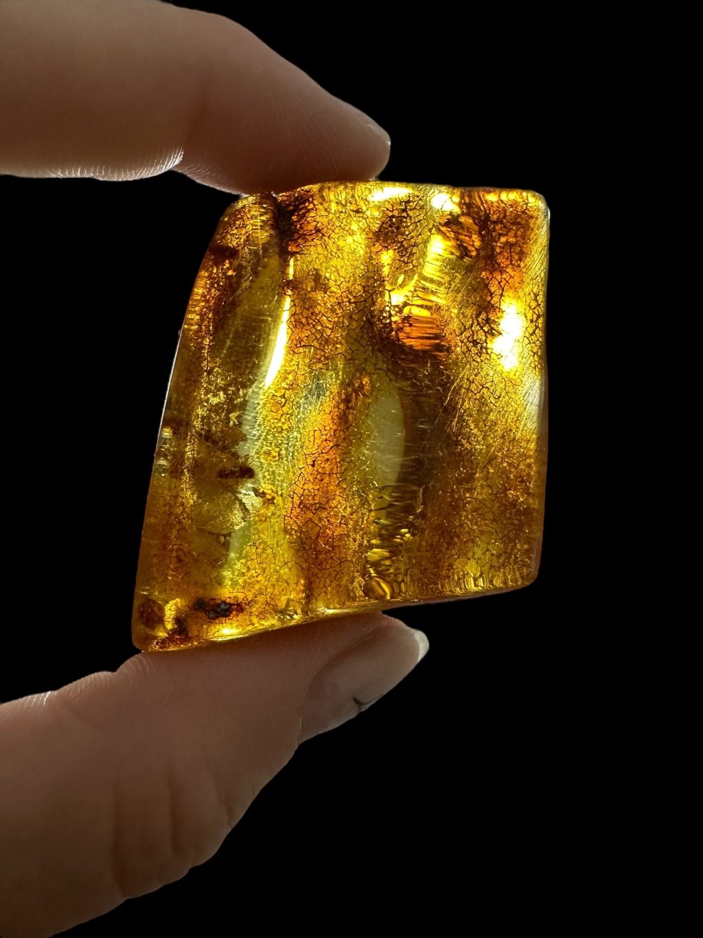 Colombian amber can preserve fossil remains of various prehistoric insects (e.g. ants, termites, mosquitoes, wasps, beetles), arachnids, and plant material such as fibers, leaf fragments, or pollen grains. Rarer inclusions may include tiny pieces of lichens or mosses, providing insight into the rich vegetation and tropical conditions of its time.