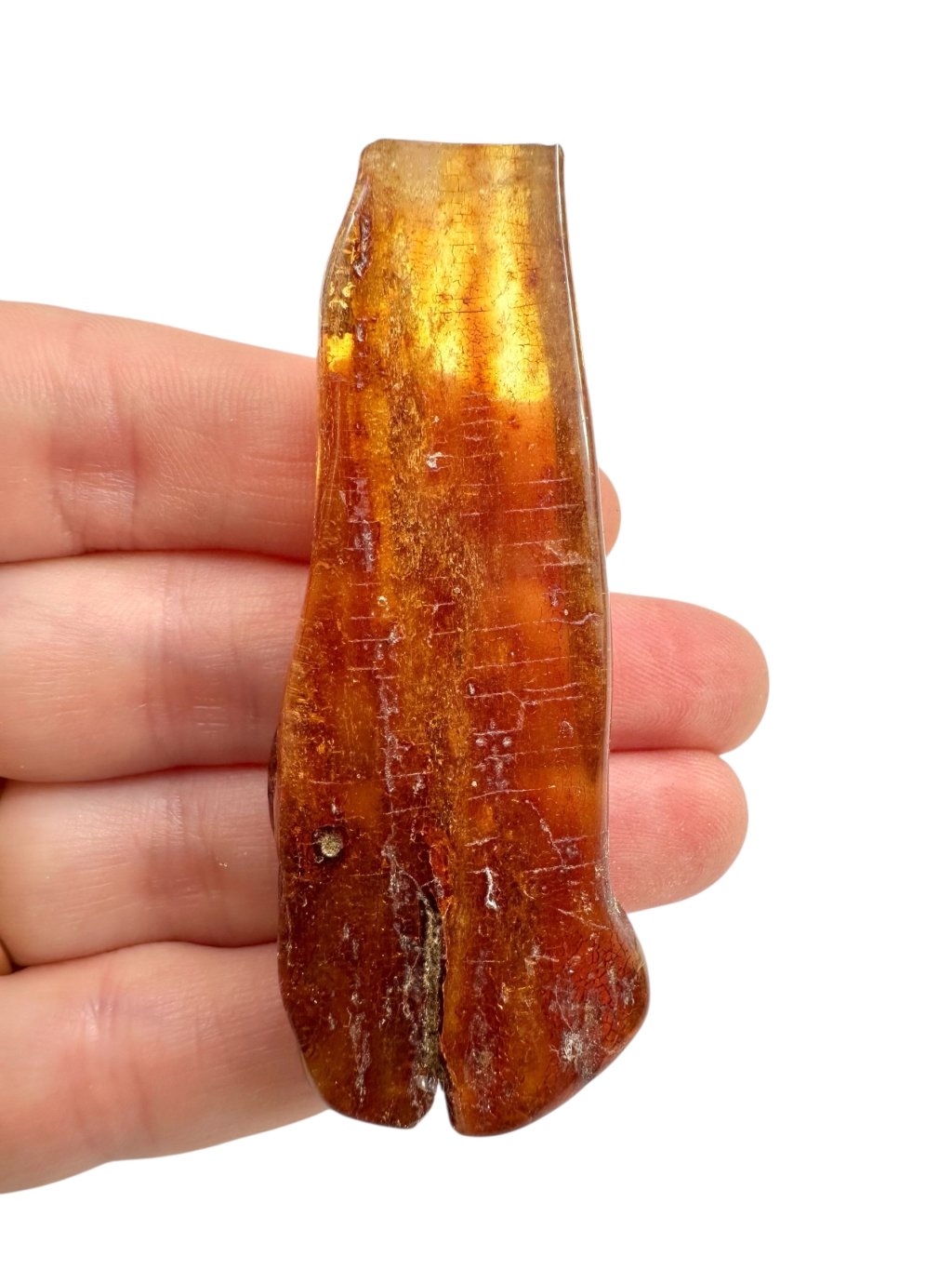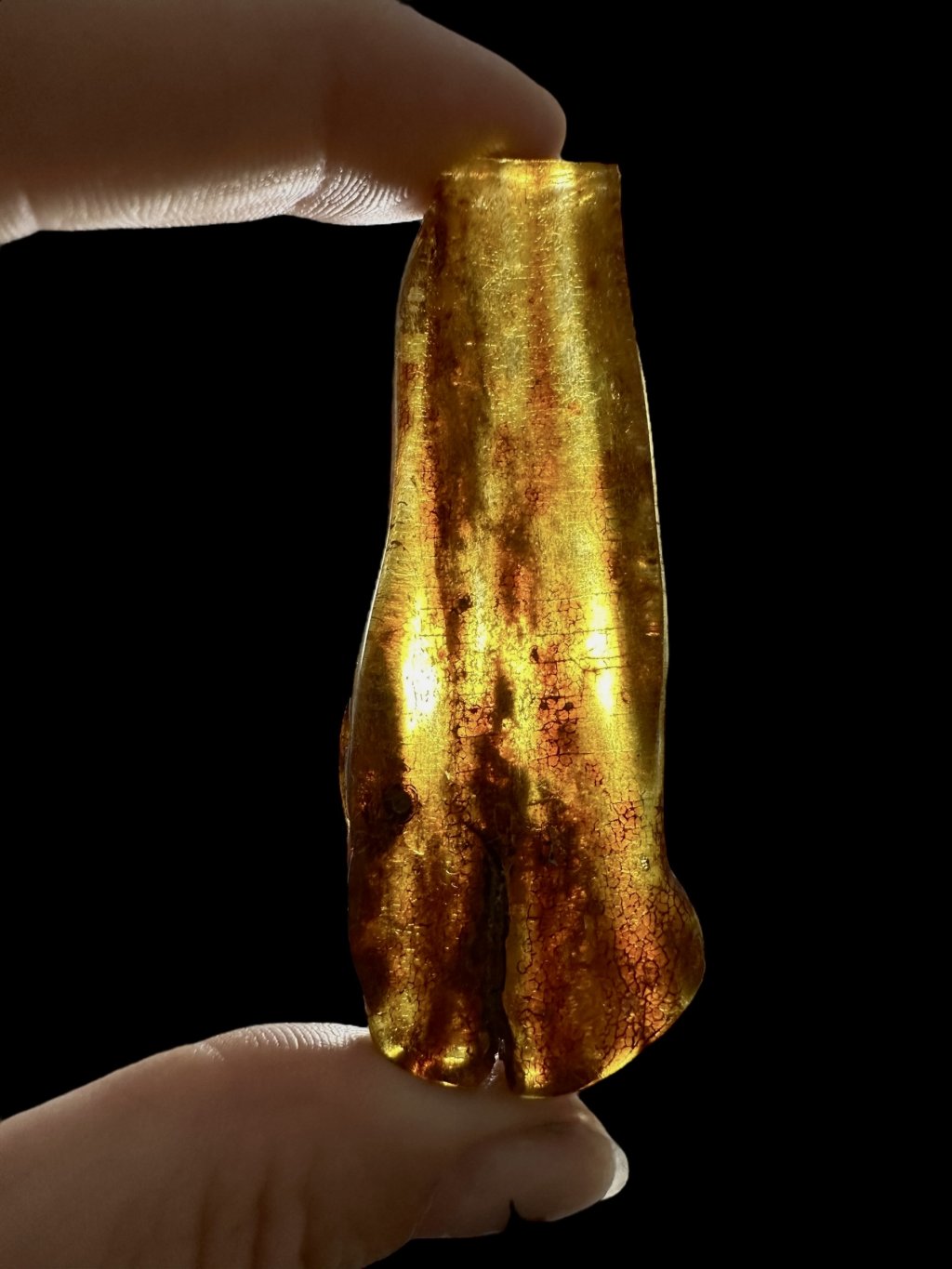 Copal may resemble amber at first glance—it is often clear, golden, and lightweight, and can sometimes contain insect or plant inclusions. However, the key difference lies in its physical and chemical properties: copal is softer, less stable, often slightly sticky, and dissolves in organic solvents (e.g. acetone), whereas true amber remains unaffected.