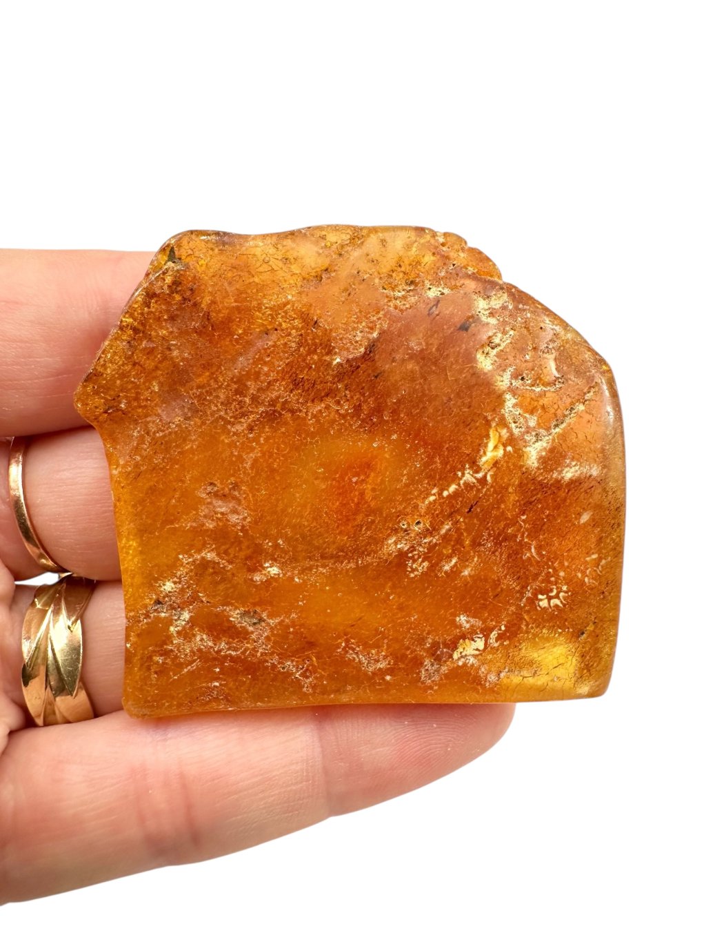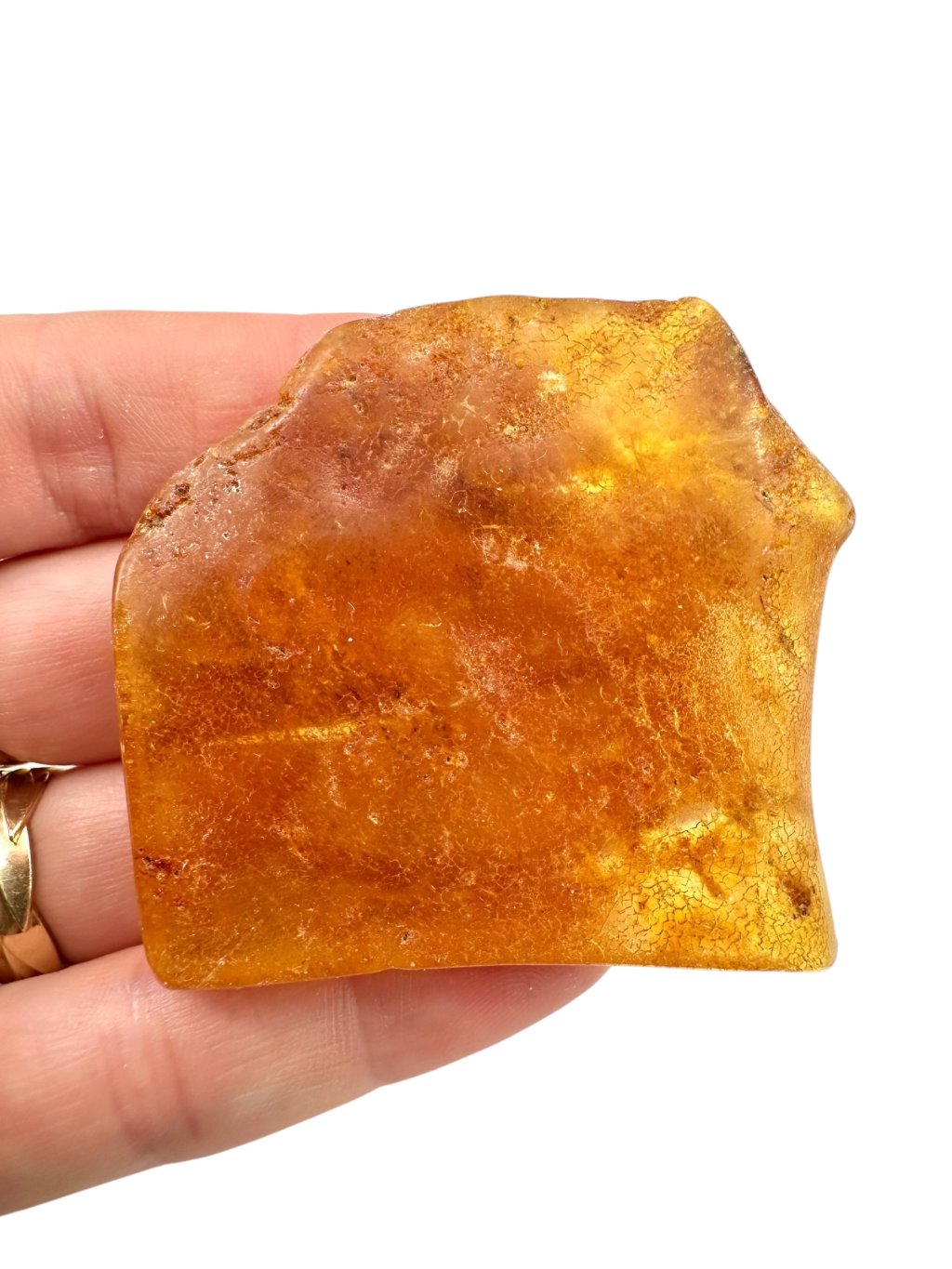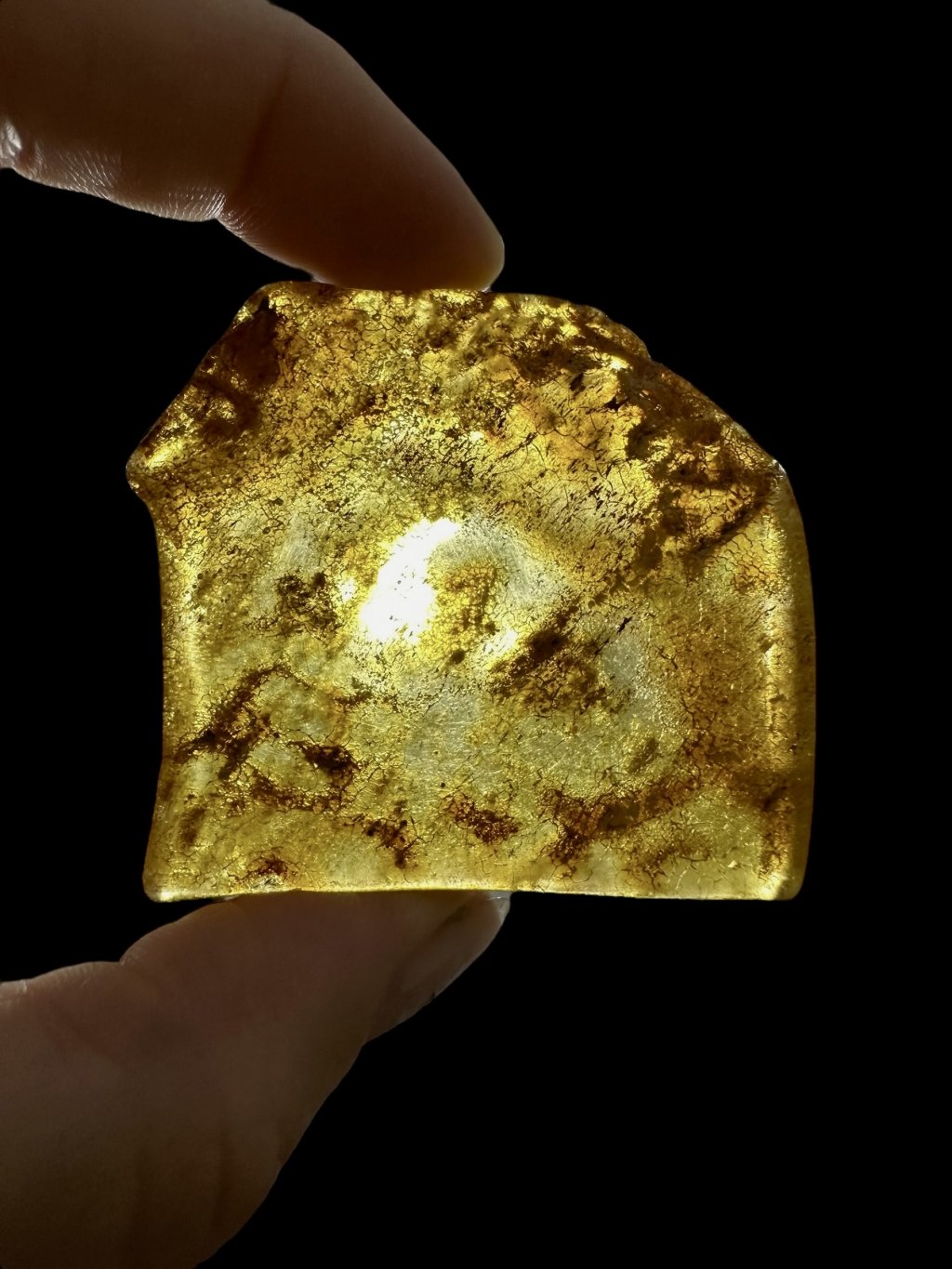 Copal may resemble amber at first glance—it is often clear, golden, and lightweight, and can sometimes contain insect or plant inclusions. However, the key difference lies in its physical and chemical properties: copal is softer, less stable, often slightly sticky, and dissolves in organic solvents (e.g. acetone), whereas true amber remains unaffected.