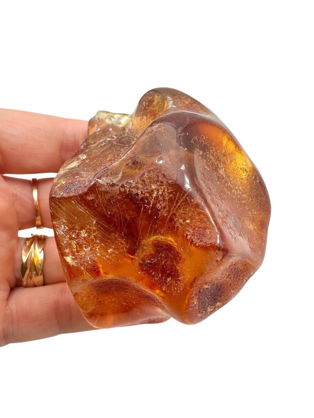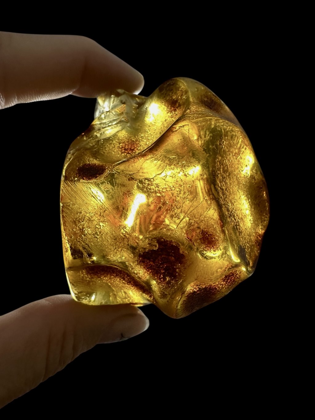 Copal may resemble amber at first glance—it is often clear, golden, and lightweight, and can sometimes contain insect or plant inclusions. However, the key difference lies in its physical and chemical properties: copal is softer, less stable, often slightly sticky, and dissolves in organic solvents (e.g. acetone), whereas true amber remains unaffected.