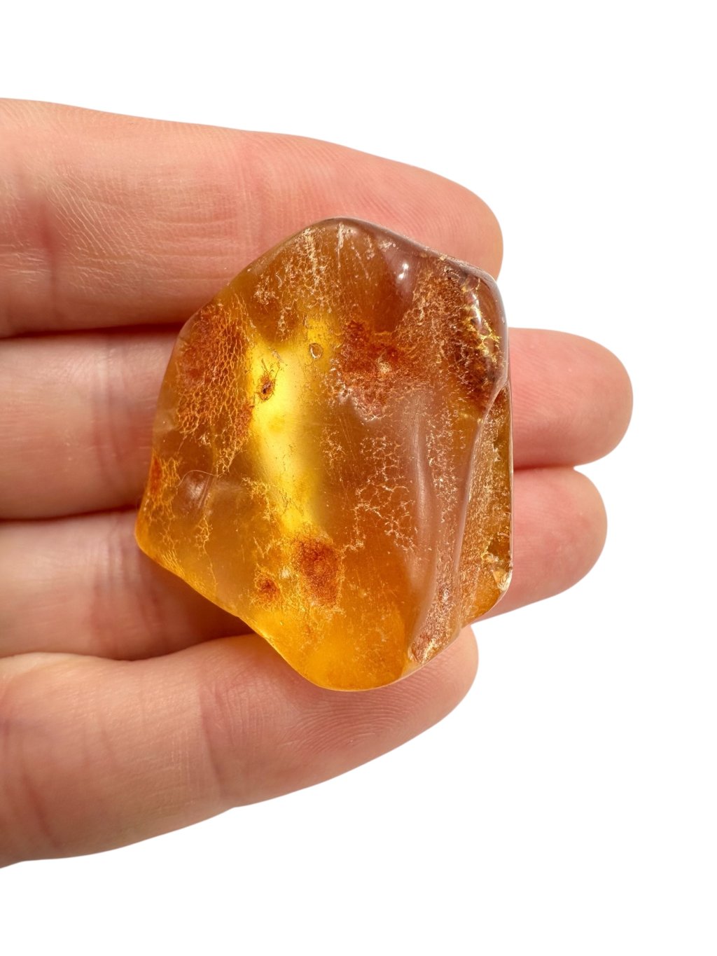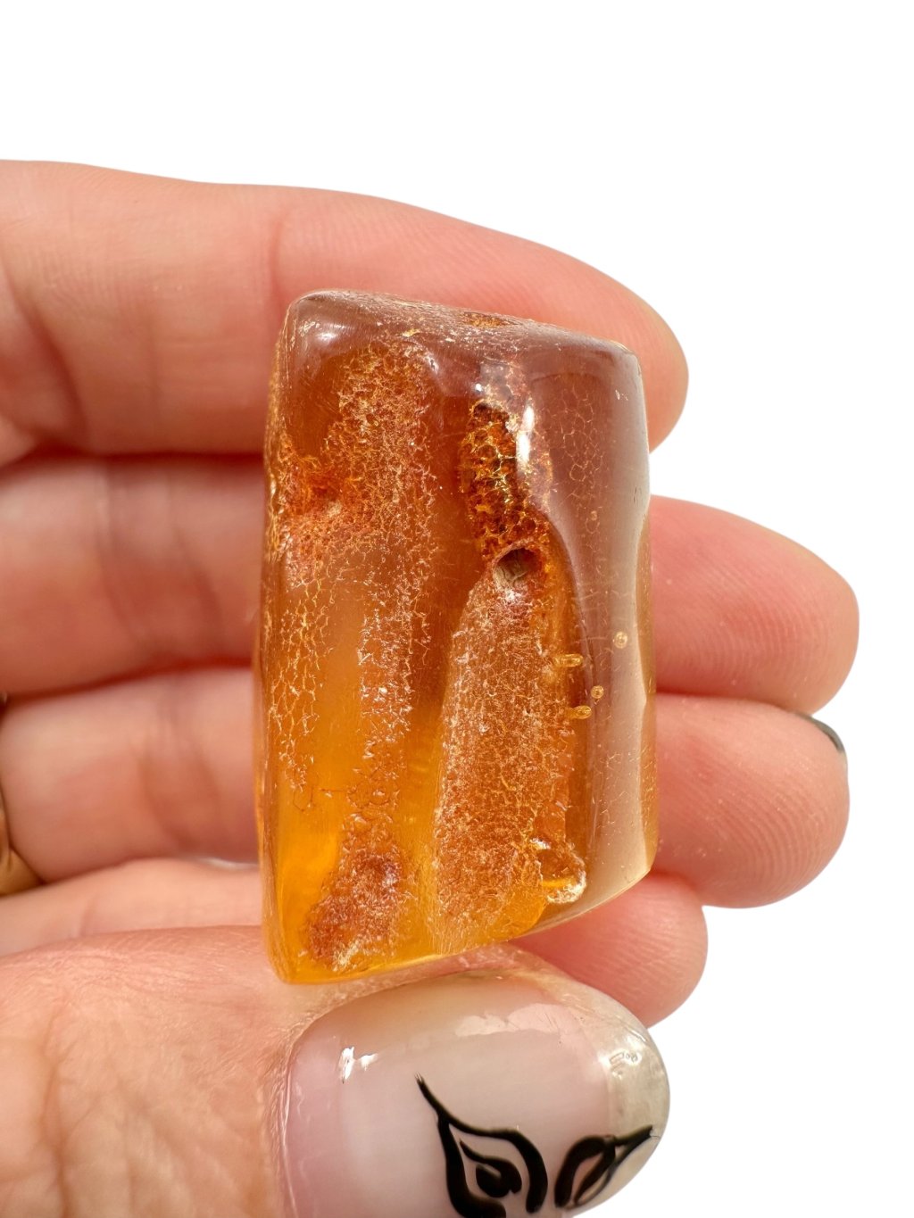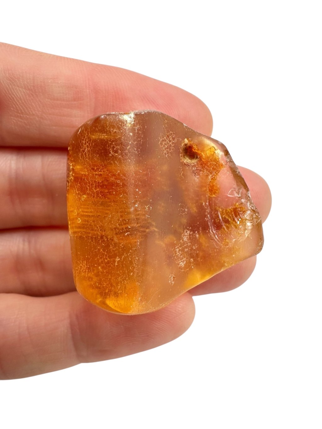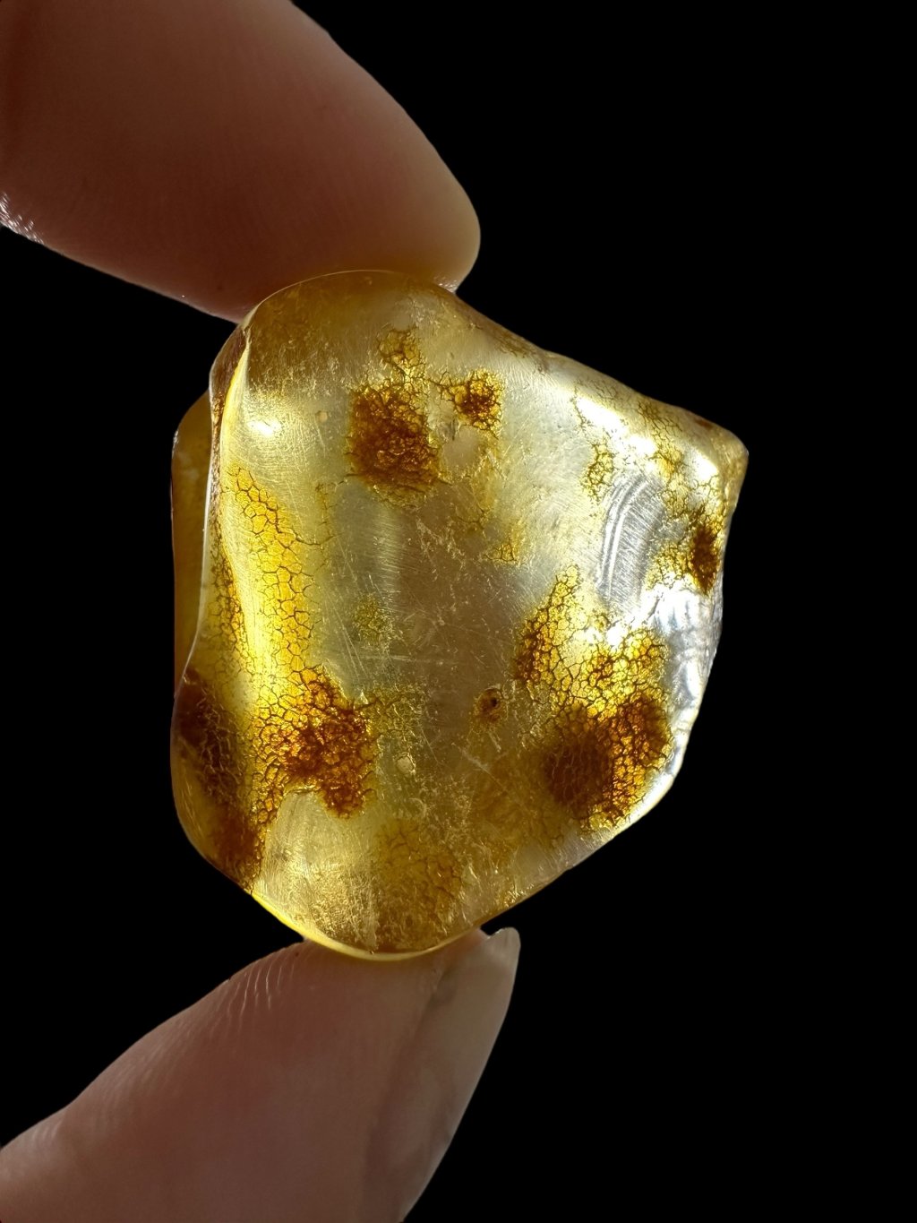 Copal may resemble amber at first glance—it is often clear, golden, and lightweight, and can sometimes contain insect or plant inclusions. However, the key difference lies in its physical and chemical properties: copal is softer, less stable, often slightly sticky, and dissolves in organic solvents (e.g. acetone), whereas true amber remains unaffected.
