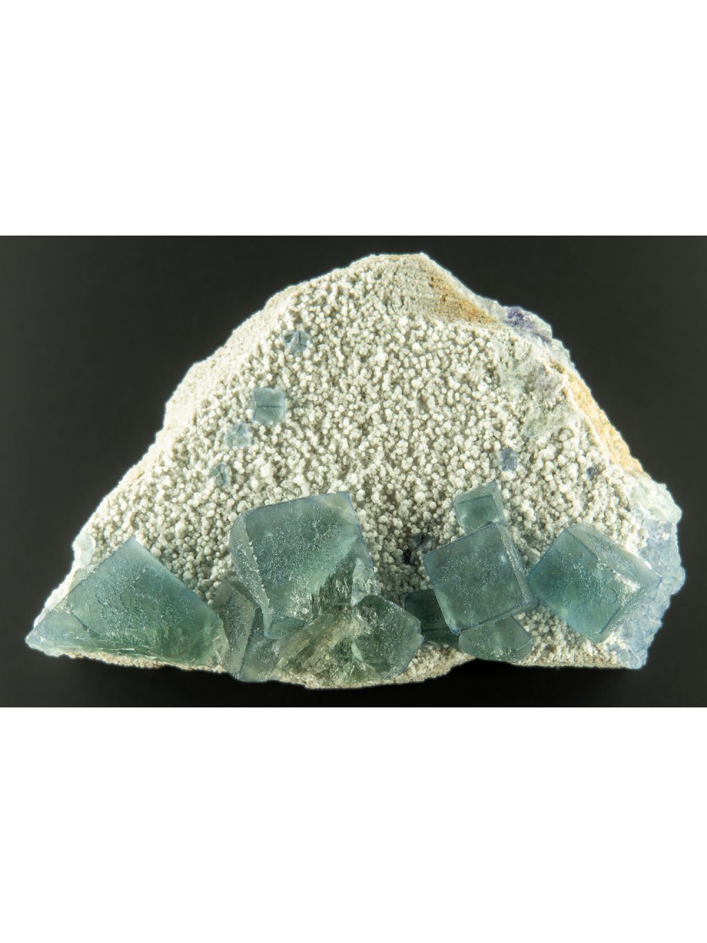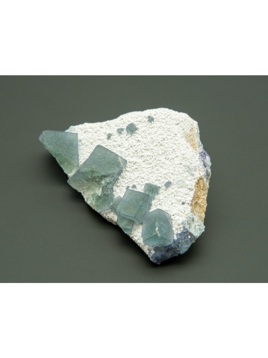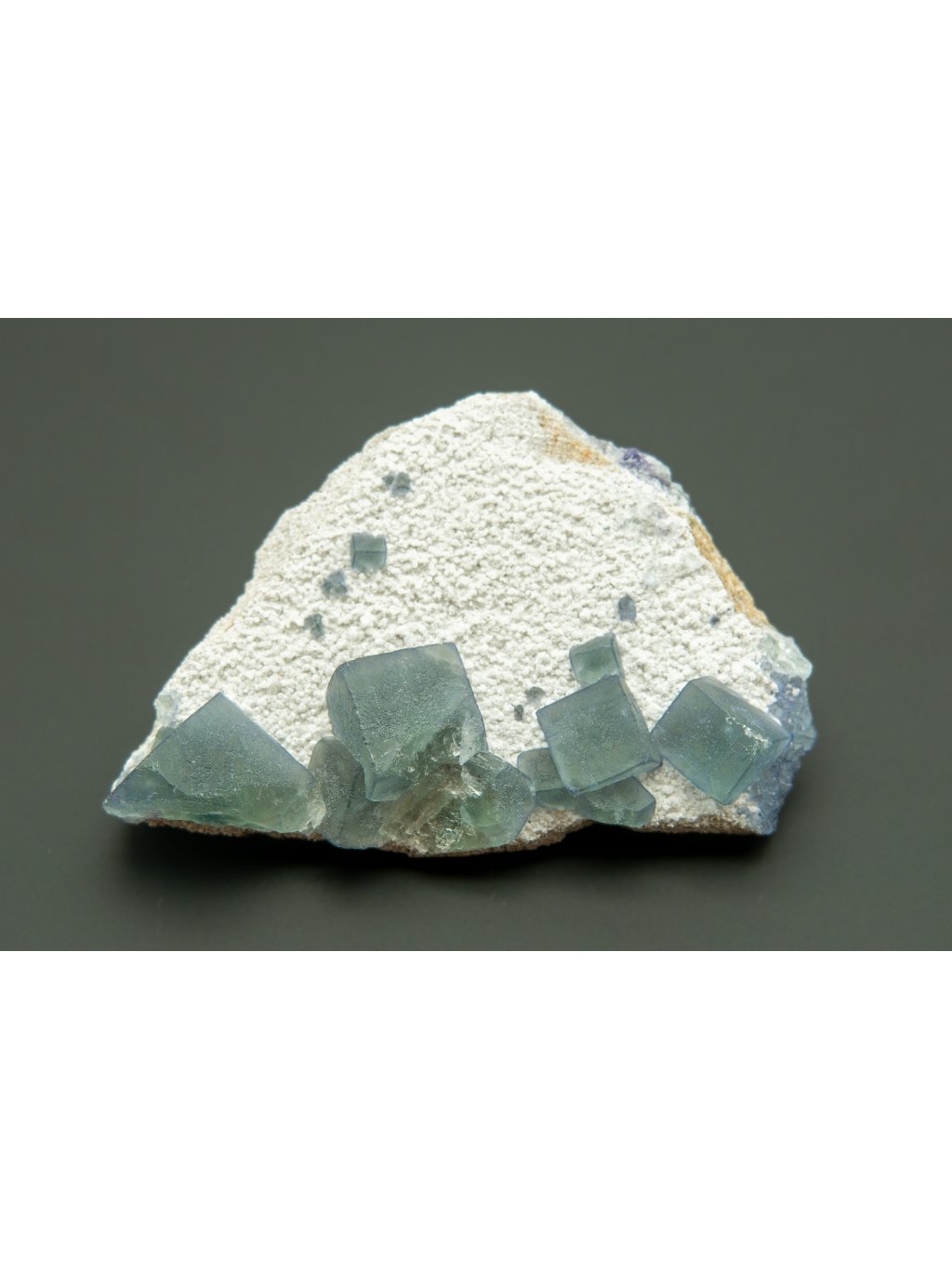 Fluorit: Nedávno objevené vzorky fluoritu z Huanggang Mine často vykazují výjimečné barvy a krystalové formy. Tyto vzorky mohou být různých barev, včetně zelené, fialové, modré a někdy i vícebarevné kombinace. Fluorit z této lokality je známý svou vynikající průhledností a leskem, často tvořícím kubické a osmistěnné krystaly. Fluorit se často nachází na kusu horniny, který je obvykle tvořen bílým substrátem, jako je kalcit nebo křemen. Tento bílý substrát poskytuje kontrastní pozadí pro krystaly fluoritu, které mohou být různě zbarvené. Tento kontrastní efekt zvyšuje vizuální atraktivitu a estetickou hodnotu těchto vzorků fluoritu.