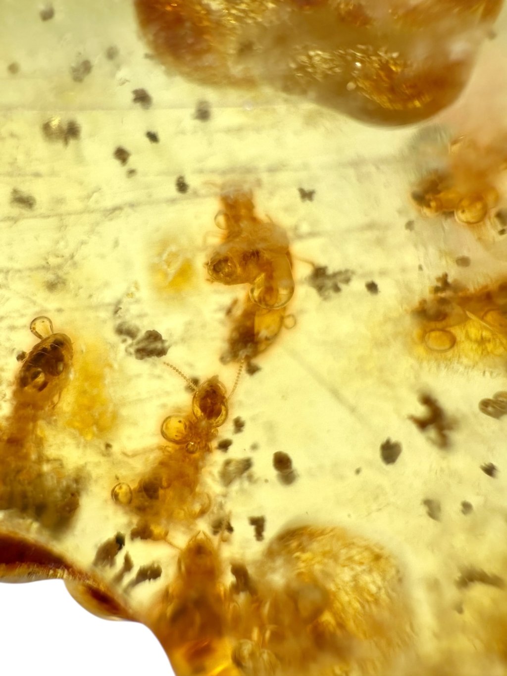 V kolumbijském jantaru se mohou uchovávat fosilní zbytky různých druhů pravěkého hmyzu (např. mravenci, termiti, komáři, vosy, brouci), pavoukovců i zbytky rostlinného materiálu (vlákna, úlomky listů, pylová zrna). Objevují se i vzácnější inkluze, jako jsou malé kousky lišejníků či mechorostů, které dokládají bohatou vegetaci a specifické podmínky tropického pásma.