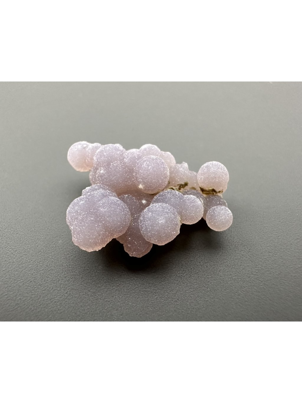 Hroznové chalcedony jsou relativně novým objevem na trhu s minerály. První vzorky byly nalezeny v roce 2016 na indonéském ostrově Sulawesi v Indonésii, konkrétně v oblasti Manakarra. Hroznový chalcedon je odrůdou křemene a vyznačuje se charakteristickými kulovitými agregáty zvanými sférolity, které vznikají vysrážením z rosolovitých roztoků bohatých na oxid křemičitý (SiO₂). Tyto kulovité struktury, často v rozměrech až do 1 cm, jsou tvořeny jemnými vlákny stejné délky, která jsou k sobě těsně přiložena. Jednotlivé kuličky jsou často srostlé k sobě nebo k podložní hornině, což vytváří tvar připomínající hroznové víno, což vedlo k jejich názvu.