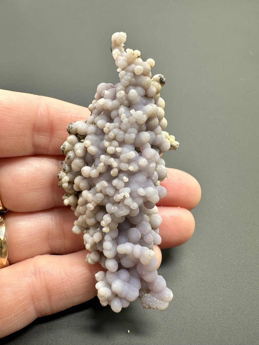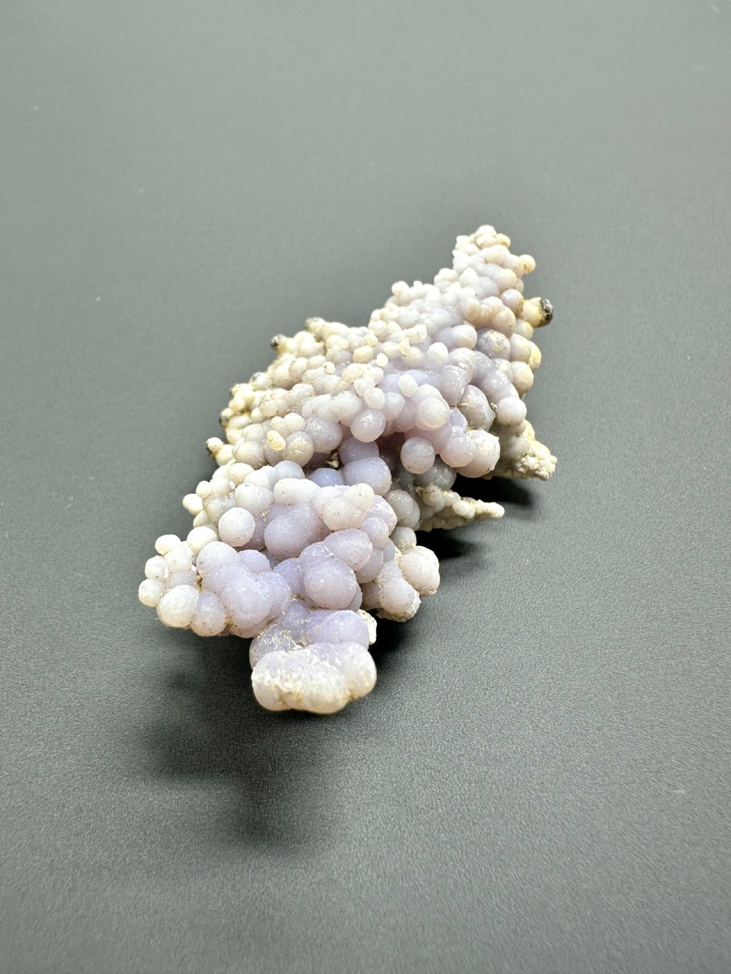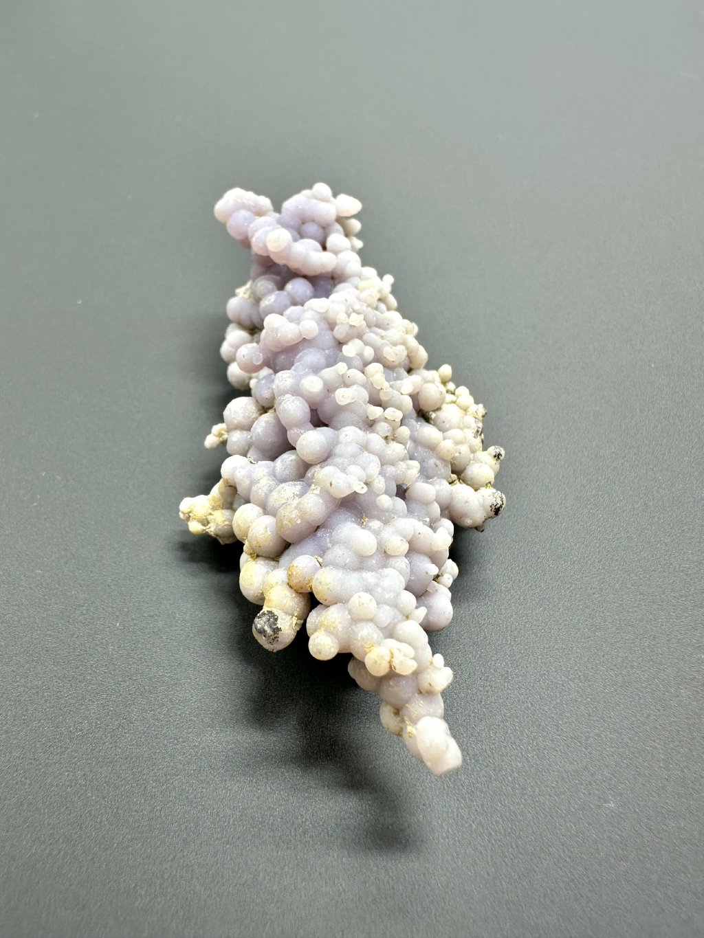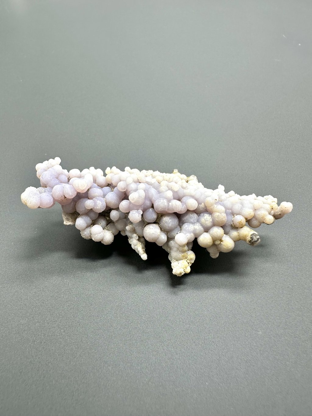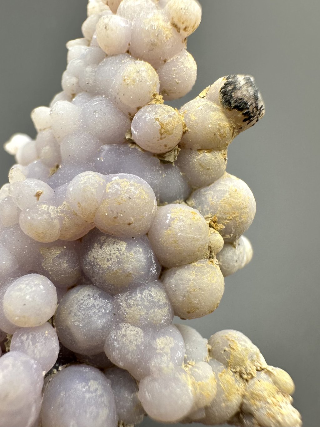 Hroznové chalcedony jsou relativně novým objevem na trhu s minerály. První vzorky byly nalezeny v roce 2016 na indonéském ostrově Sulawesi v Indonésii, konkrétně v oblasti Manakarra. Hroznový chalcedon je odrůdou křemene a vyznačuje se charakteristickými kulovitými agregáty zvanými sférolity, které vznikají vysrážením z rosolovitých roztoků bohatých na oxid křemičitý (SiO₂). Tyto kulovité struktury, často v rozměrech až do 1 cm, jsou tvořeny jemnými vlákny stejné délky, která jsou k sobě těsně přiložena. Jednotlivé kuličky jsou často srostlé k sobě nebo k podložní hornině, což vytváří tvar připomínající hroznové víno, což vedlo k jejich názvu.