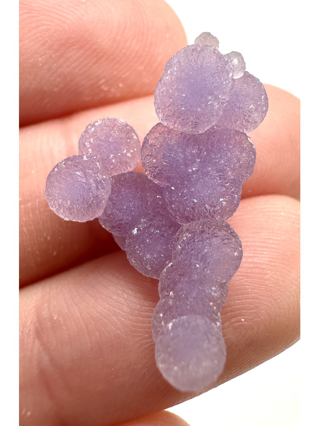 Hroznové chalcedony jsou relativně novým objevem na trhu s minerály. První vzorky byly nalezeny v roce 2016 na indonéském ostrově Sulawesi v Indonésii, konkrétně v oblasti Manakarra. Hroznový chalcedon je odrůdou křemene a vyznačuje se charakteristickými kulovitými agregáty zvanými sférolity, které vznikají vysrážením z rosolovitých roztoků bohatých na oxid křemičitý (SiO₂). Tyto kulovité struktury, často v rozměrech až do 1 cm, jsou tvořeny jemnými vlákny stejné délky, která jsou k sobě těsně přiložena. Jednotlivé kuličky jsou často srostlé k sobě nebo k podložní hornině, což vytváří tvar připomínající hroznové víno, což vedlo k jejich názvu.