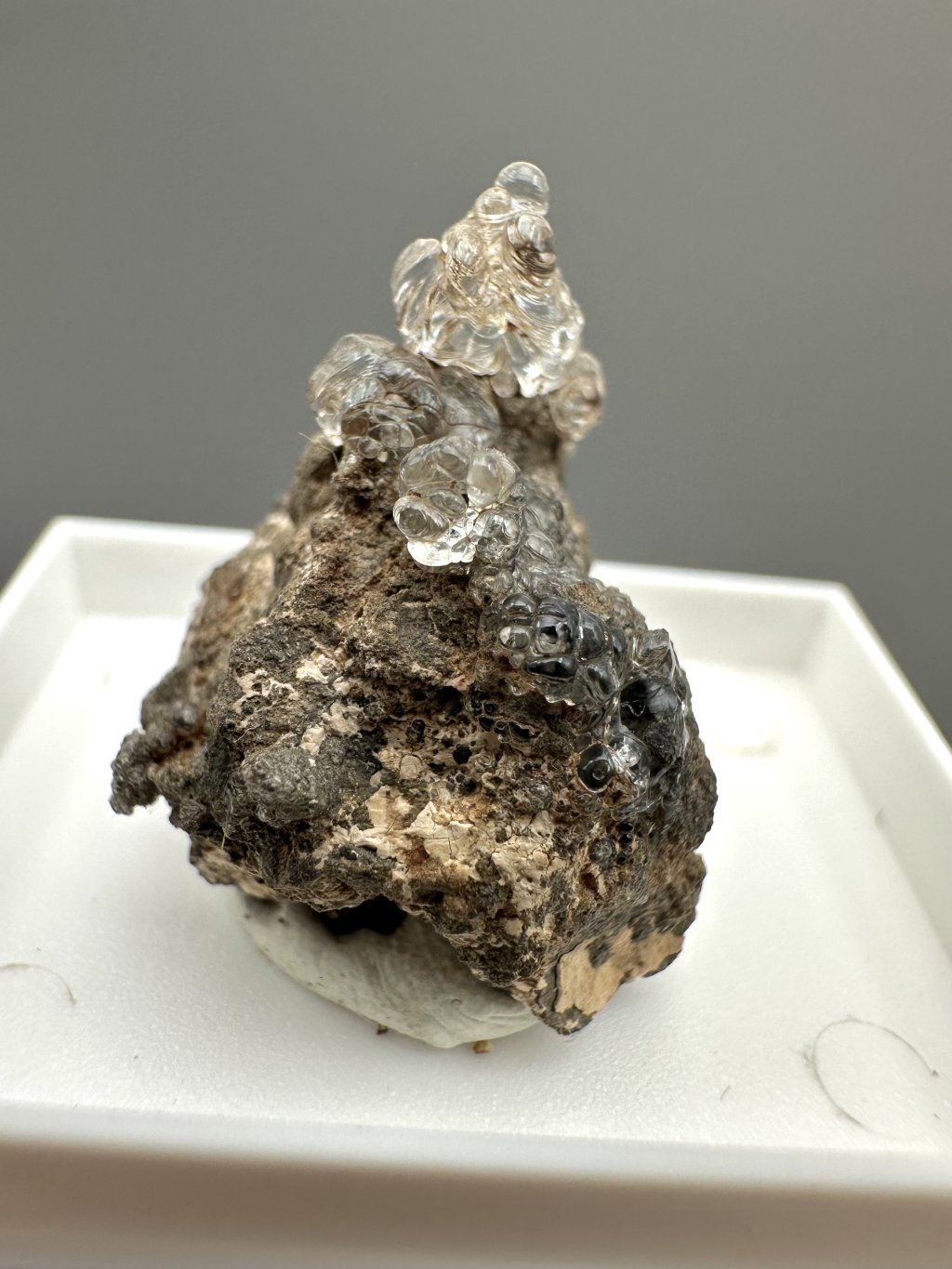 Hyalit, známý také jako skelný opál, je odrůda opálu, která se vyznačuje svou čirou, bezbarvou až jemně zbarvenou strukturou a charakteristickým sklovitým leskem. Tento minerál je tvořen oxidem křemičitým (SiO₂) a obsahuje vodu, což mu dává jeho jedinečné vlastnosti. Hyalit vzniká v důsledku hydrotermálních procesů blízko zemského povrchu, často v dutinách vyvřelých hornin, jako je čedič. V České republice je významné naleziště hyalitu v okolí obce Valeč v Doupovských horách, kde se vyskytuje ve formě hroznovitých nebo krápníkovitých agregátů.