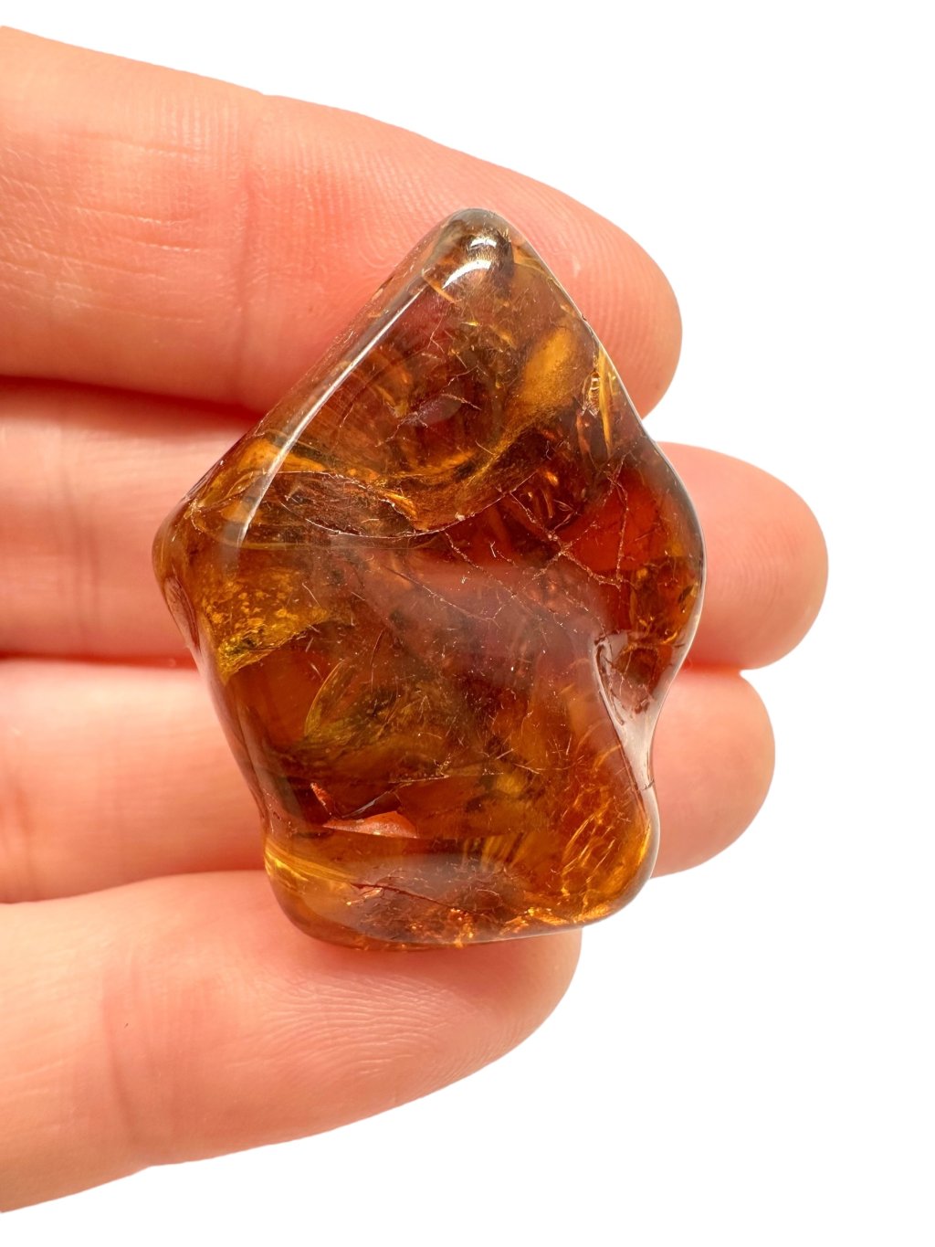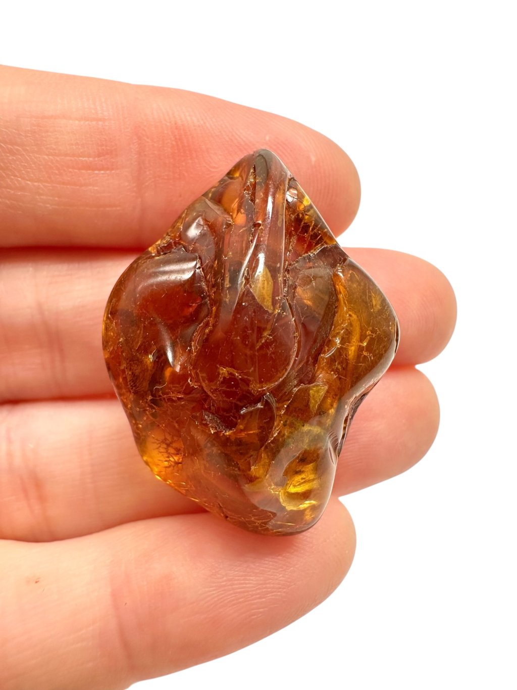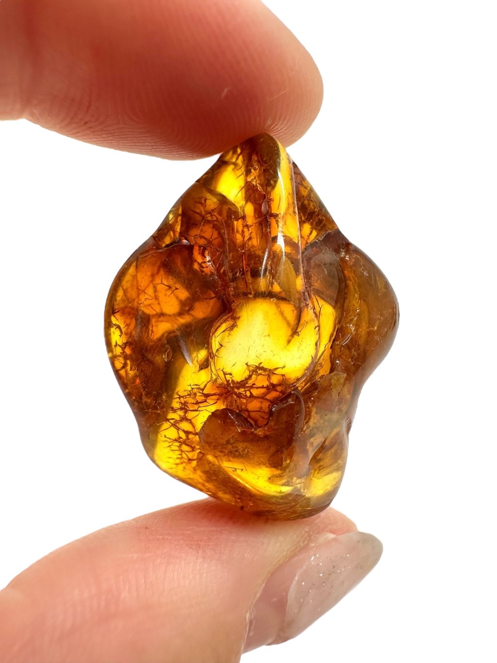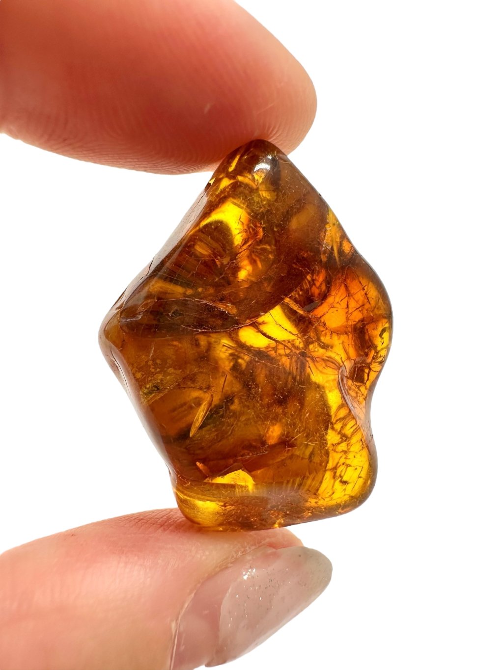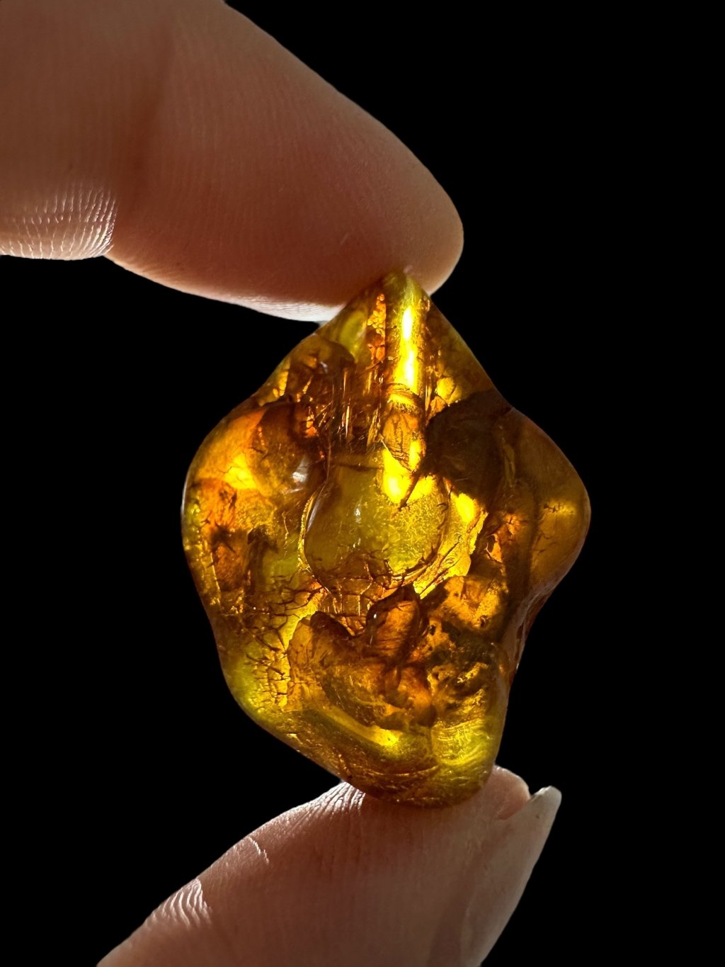 Poznámka: Úvodní fotografie byla pořízena s jantarem drženým mezi prsty, takže skrz něj prochází světlo a působí světlejším dojmem, než když je položen na povrchu.
