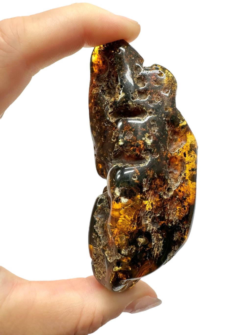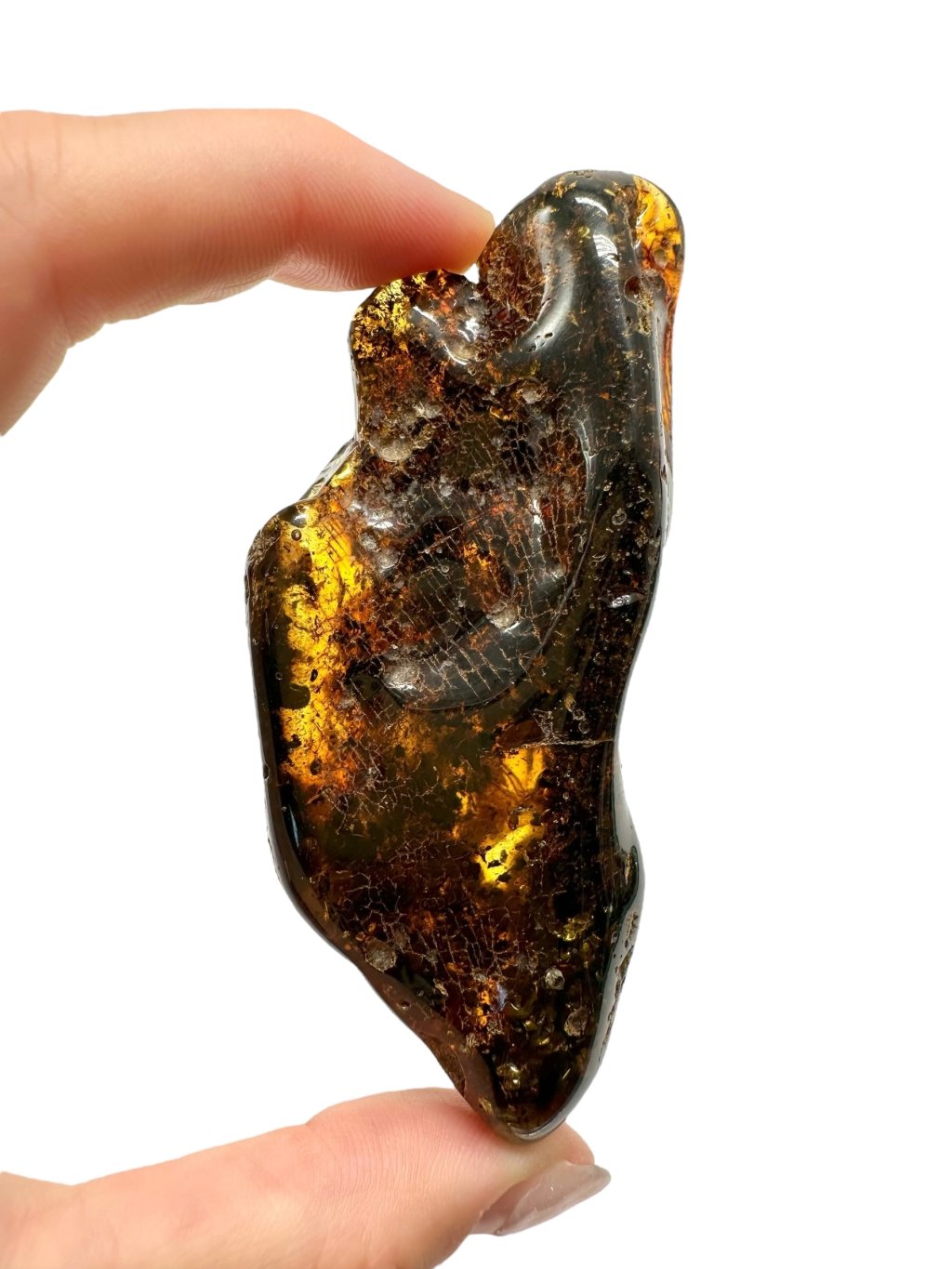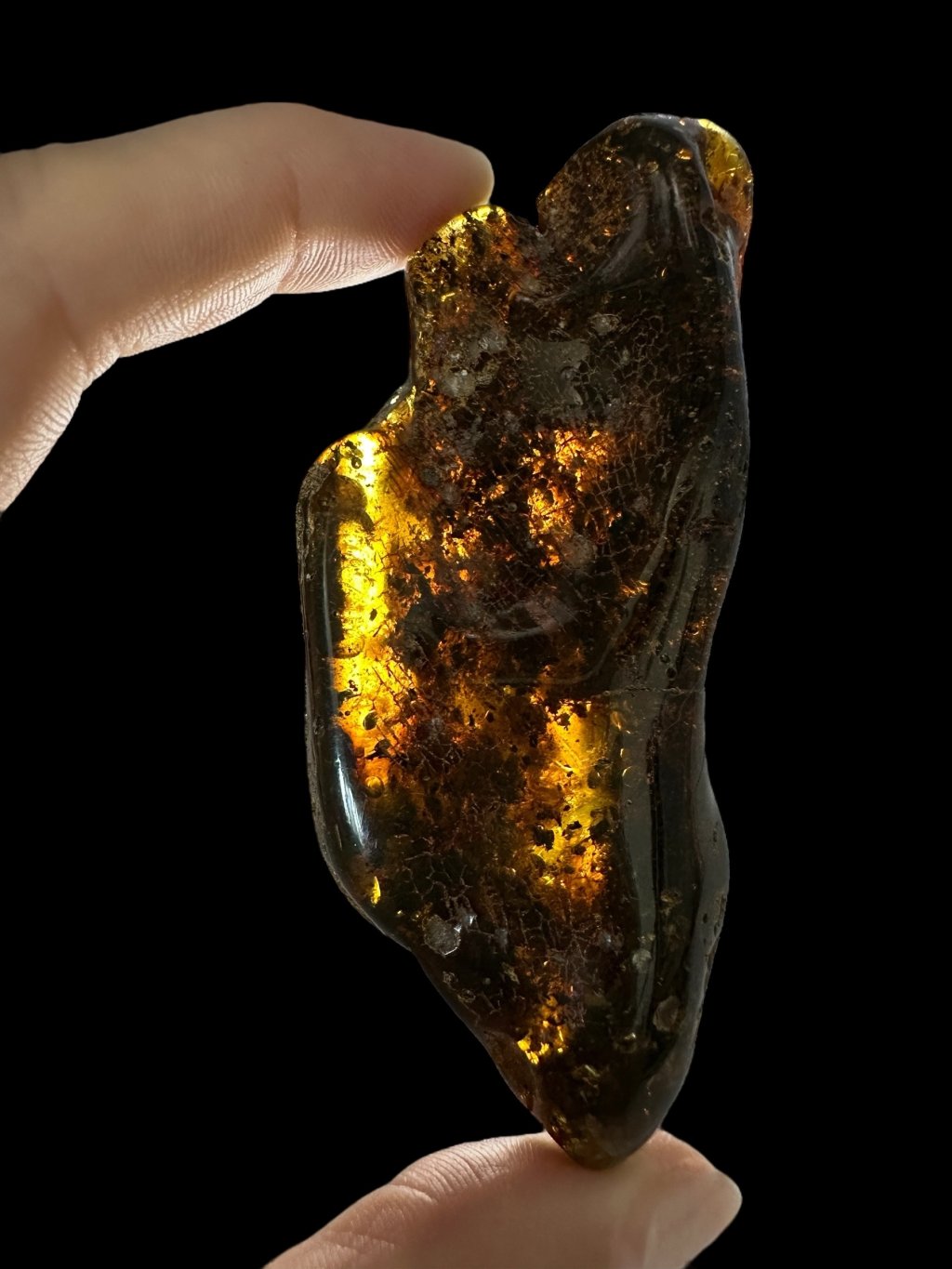Poznámka: Úvodní fotografie byla pořízena s jantarem drženým mezi prsty, takže skrz něj prochází světlo a působí světlejším dojmem, než když je položen na povrchu.